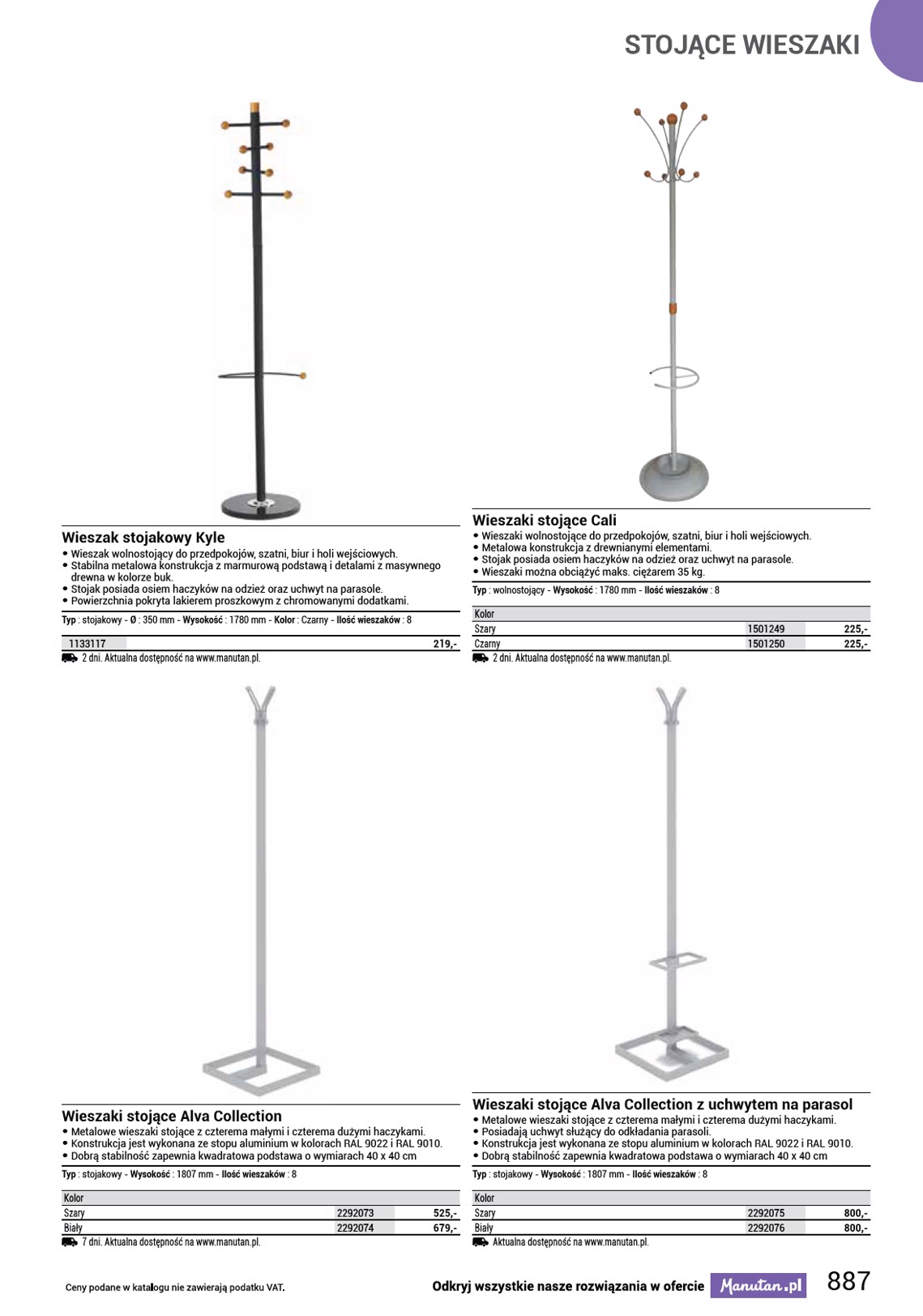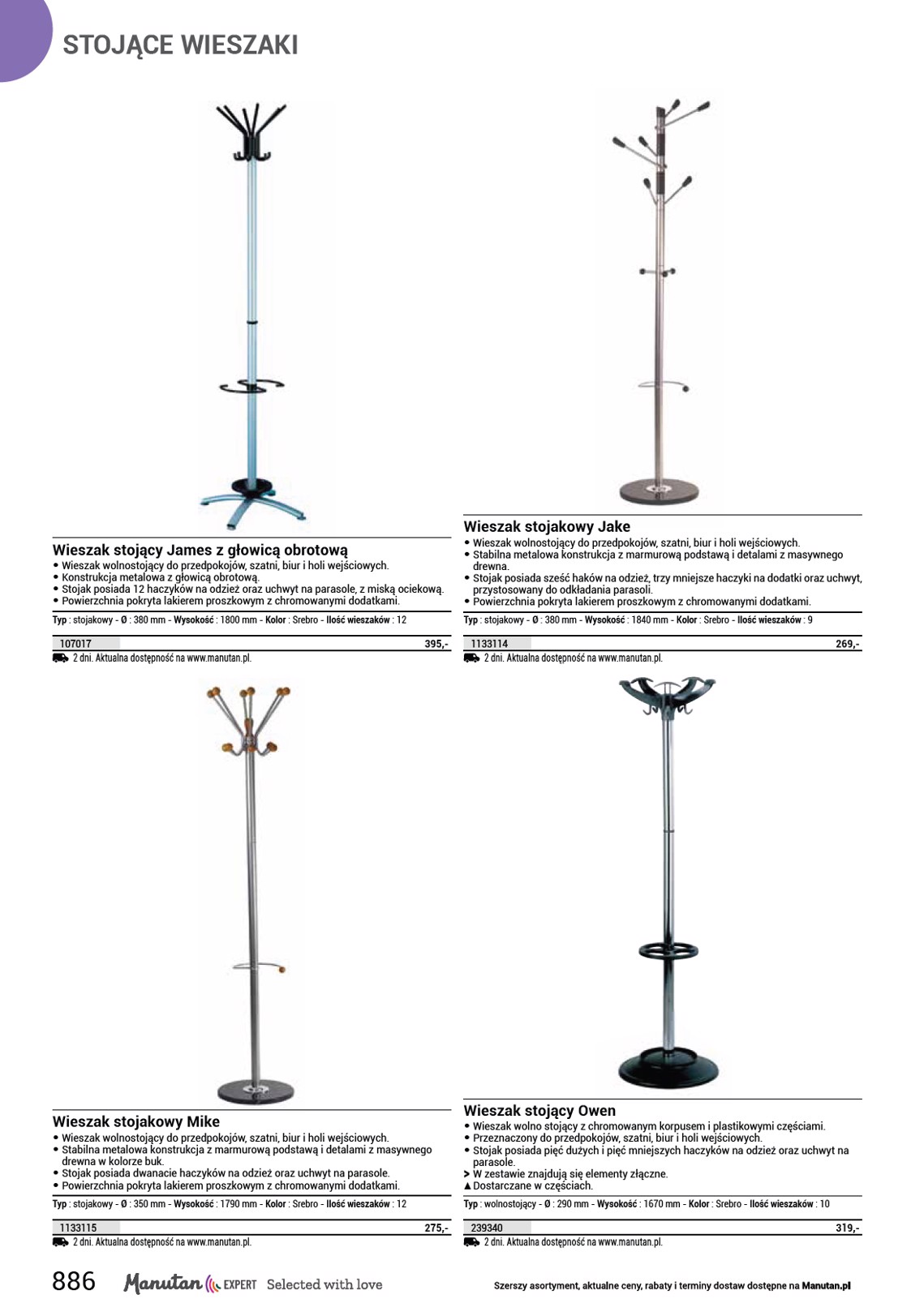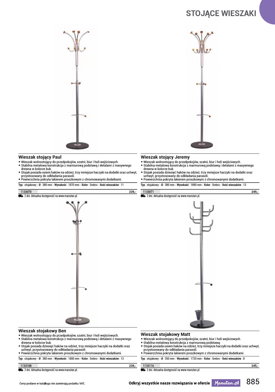 STOJĄCE WIESZAKI Wieszak stojący Paul • Wieszak wolnostojący do przedpokojów, szatni, biur i holi wejściowych. • Stabilna metalowa konstrukcja z marmurową podstawą i detalami z masywnego drewna w kolorze buk. • Stojak posiada osiem haków na odzież, trzy mniejsze haczyki na dodatki oraz uchwyt, przystosowany do odkładania parasoli. • Powierzchnia pokryta lakierem proszkowym z chromowanymi dodatkami. Typ : stojakowy - Ø : 380 mm - Wysokość : 1870 mm - Kolor : Srebro - Ilość wieszaków : 11 1133070 2 dni. Aktualna dostępność na www.manutan.pl. 239,- Wieszak stojący Jeremy • Wieszak wolnostojący do przedpokojów, szatni, biur i holi wejściowych. • Stabilna metalowa konstrukcja z marmurową podstawą i detalami z masywnego drewna w kolorze buk. • Stojak posiada dziesięć haków na odzież, trzy mniejsze haczyki na dodatki oraz uchwyt, przystosowany do odkładania parasoli. • Powierzchnia pokryta lakierem proszkowym z chromowanymi dodatkami. Typ : stojakowy - Ø : 380 mm - Wysokość : 1890 mm - Kolor : Srebro - Ilość wieszaków : 13 1133071 2 dni. Aktualna dostępność na www.manutan.pl. 249,- Wieszak stojakowy Ben • Wieszak wolnostojący do przedpokojów, szatni, biur i holi wejściowych. • Stabilna metalowa konstrukcja z marmurową podstawą i detalami z masywnego drewna w kolorze buk. • Stojak posiada dziesięć haków na odzież, trzy mniejsze haczyki na dodatki oraz uchwyt, przystosowany do odkładania parasoli. • Powierzchnia pokryta lakierem proszkowym z chromowanymi dodatkami. Typ : stojakowy - Ø : 380 mm - Wysokość : 1800 mm - Kolor : Srebro - Ilość wieszaków : 13 1133108 2 dni. Aktualna dostępność na www.manutan.pl. 239,- Wieszak stojakowy Matt • Wieszak wolnostojący do przedpokojów, szatni, biur i holi wejściowych. • Stabilna metalowa konstrukcja z marmurową podstawą. • Stojak posiada osiem haków na odzież, trzy mniejsze haczyki na dodatki oraz uchwyt, przystosowany do odkładania parasoli. • Powierzchnia pokryta lakierem proszkowym z chromowanymi dodatkami. Typ : stojakowy - Ø : 350 mm - Wysokość : 1720 mm - Kolor : Srebro - Ilość wieszaków : 8 1133116 2 dni. Aktualna dostępność na www.manutan.pl. 245,- 885