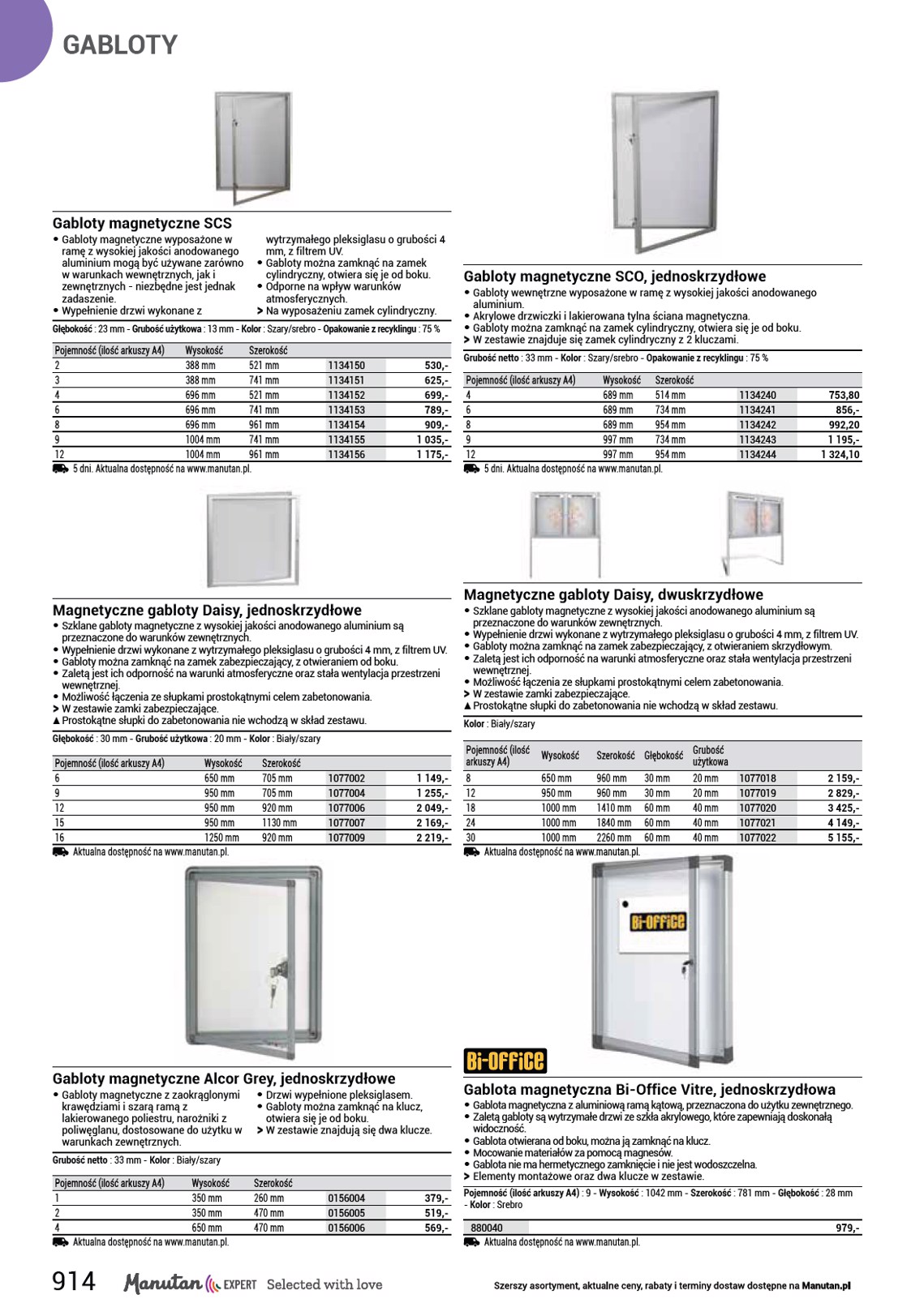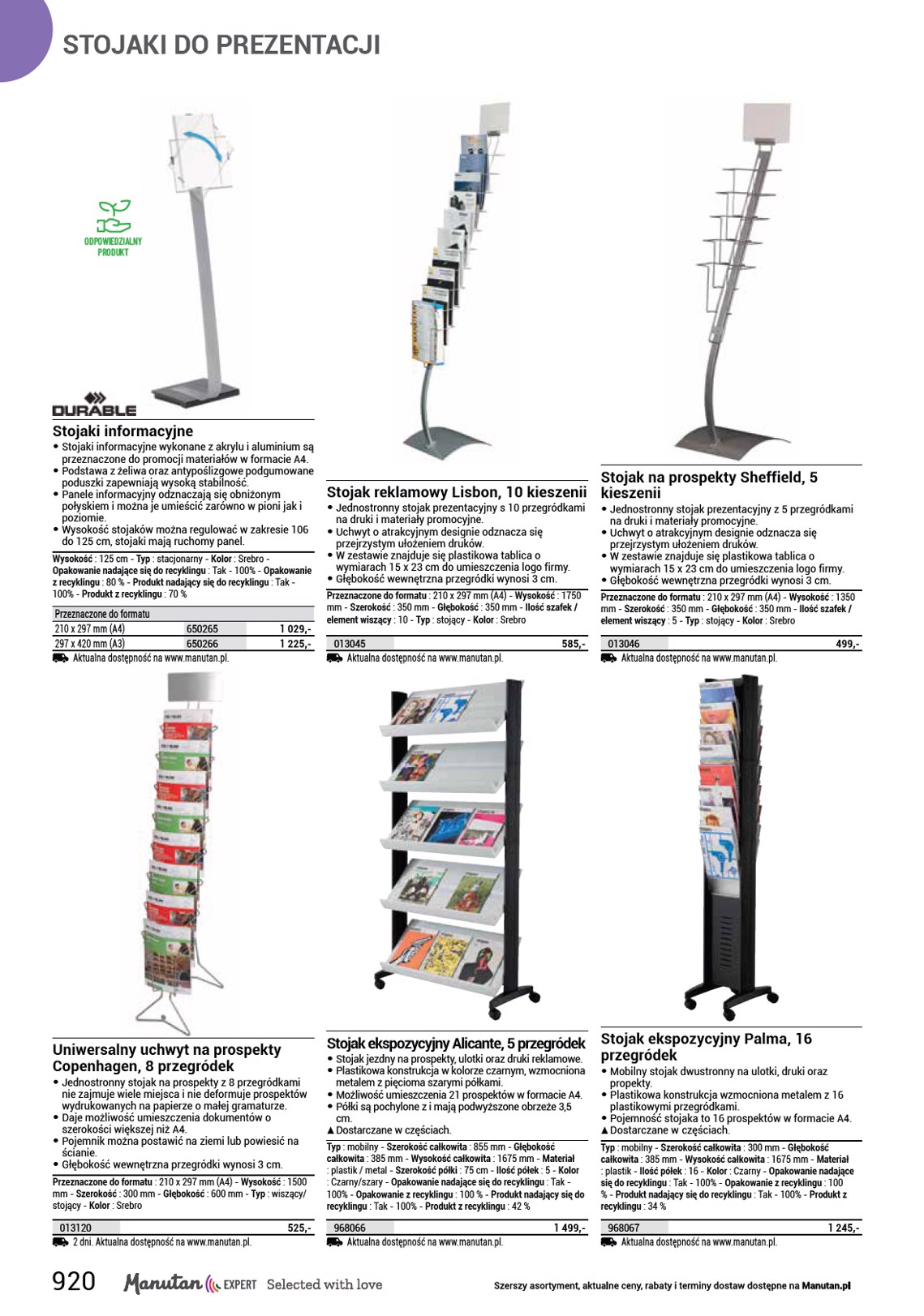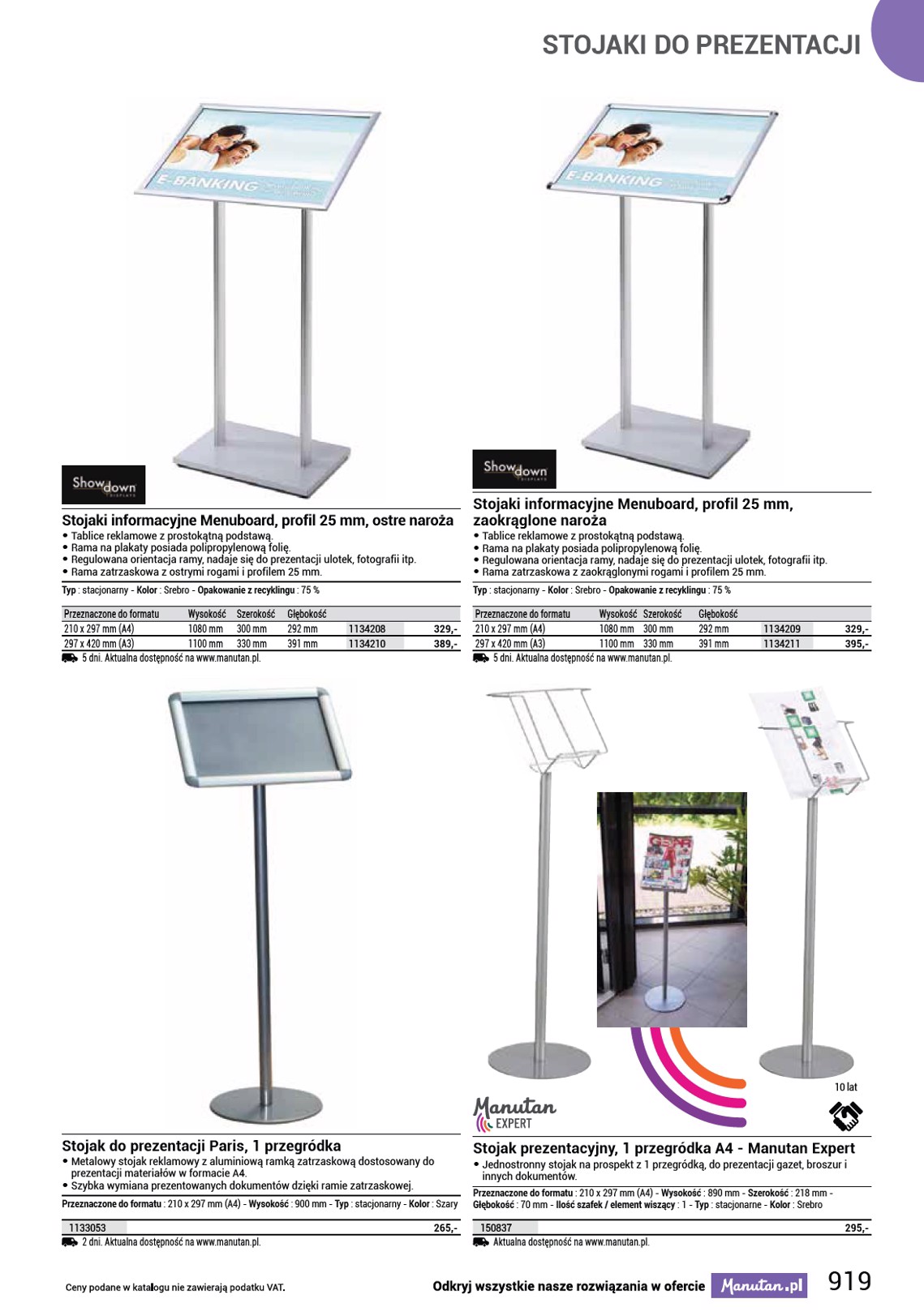 STOJAKI DO PREZENTACJI Stojaki informacyjne Menuboard, profil 25 mm, ostre naroża • Tablice reklamowe z prostokątną podstawą. • Rama na plakaty posiada polipropylenową folię. • Regulowana orientacja ramy, nadaje się do prezentacji ulotek, fotografii itp. • Rama zatrzaskowa z ostrymi rogami i profilem 25 mm. Typ : stacjonarny - Kolor : Srebro - Opakowanie z recyklingu : 75 % Przeznaczone do formatu Wysokość Szerokość 210 x 297 mm (A4) 1080 mm 300 mm 297 x 420 mm (A3) 1100 mm 330 mm 5 dni. Aktualna dostępność na www.manutan.pl. Głębokość 292 mm 391 mm 1134208 1134210 329,- 389,- Stojaki informacyjne Menuboard, profil 25 mm, zaokrąglone naroża • Tablice reklamowe z prostokątną podstawą. • Rama na plakaty posiada polipropylenową folię. • Regulowana orientacja ramy, nadaje się do prezentacji ulotek, fotografii itp. • Rama zatrzaskowa z zaokrąglonymi rogami i profilem 25 mm. Typ : stacjonarny - Kolor : Srebro - Opakowanie z recyklingu : 75 % Przeznaczone do formatu Wysokość Szerokość 210 x 297 mm (A4) 1080 mm 300 mm 297 x 420 mm (A3) 1100 mm 330 mm 5 dni. Aktualna dostępność na www.manutan.pl. Głębokość 292 mm 391 mm 1134209 1134211 329,- 395,- 10 lat Stojak do prezentacji Paris, 1 przegródka • Metalowy stojak reklamowy z aluminiową ramką zatrzaskową dostosowany do prezentacji materiałów w formacie A4. • Szybka wymiana prezentowanych dokumentów dzięki ramie zatrzaskowej. Przeznaczone do formatu : 210 x 297 mm (A4) - Wysokość : 900 mm - Typ : stacjonarny - Kolor : Szary 1133053 2 dni. Aktualna dostępność na www.manutan.pl. 265,- Stojak prezentacyjny, 1 przegródka A4 - Manutan Expert • Jednostronny stojak na prospekt z 1 przegródką, do prezentacji gazet, broszur i innych dokumentów. Przeznaczone do formatu : 210 x 297 mm (A4) - Wysokość : 890 mm - Szerokość : 218 mm - Głębokość : 70 mm - Ilość szafek / element wiszący : 1 - Typ : stacjonarne - Kolor : Srebro 150837 Aktualna dostępność na www.manutan.pl. 295,- 919