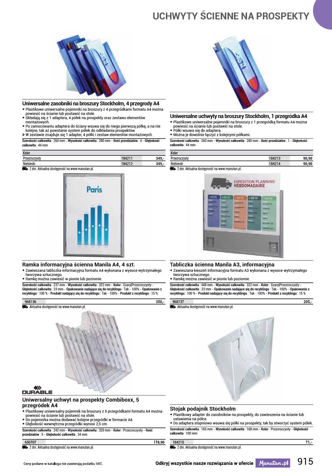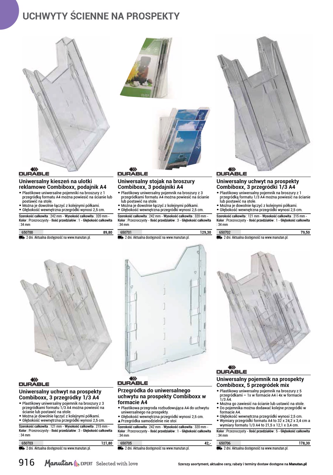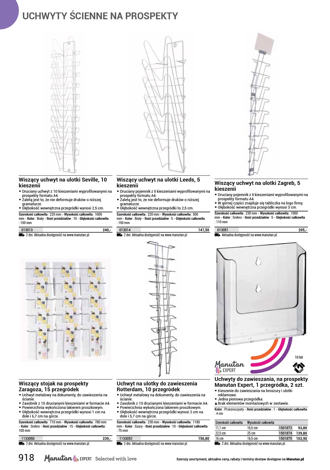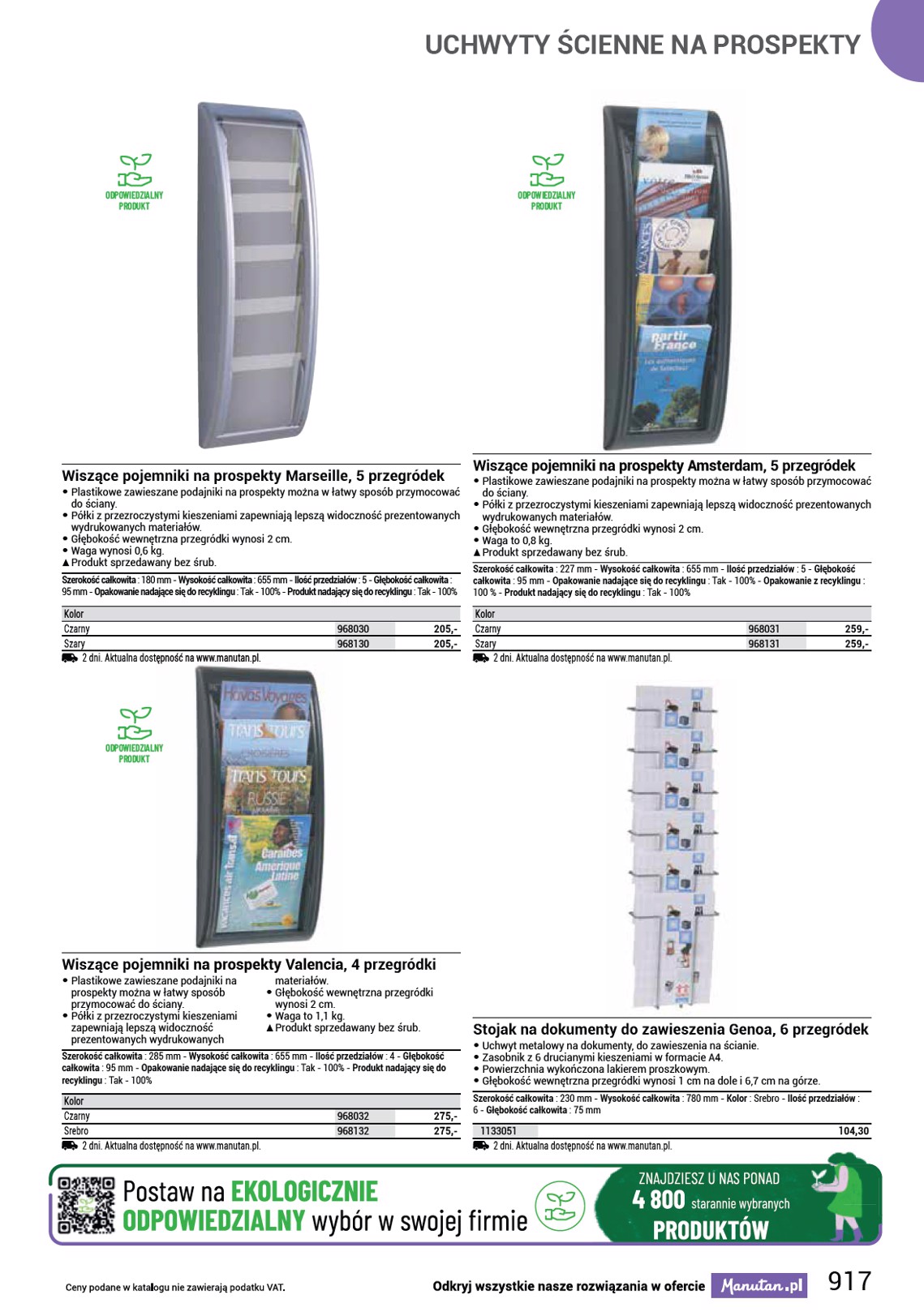 UCHWYTY ŚCIENNE NA PROSPEKTY Wiszący uchwyt na ulotki Seville, 10 kieszenii • Druciany uchwyt z 10 kieszeniami wyprofilowanymi na prospekty formatu A4. • Zaletą jest to, że nie deformuje druków o niższej gramaturze. • Głębokość wewnętrzna przegródki wynosi 2,5 cm. Szerokość całkowita : 220 mm - Wysokość całkowita : 1000 mm - Kolor : Biały - Ilość przedziałów : 10 - Głębokość całkowita : 150 mm 013013 2 dni. Aktualna dostępność na www.manutan.pl. 240,- Wiszący uchwyt na ulotki Leeds, 5 kieszenii • Druciany pojemnik z 5 kieszeniami wyprofilowanymi na prospekty formatu A4. • Zaletą jest to, że nie deformuje druków o niższej gramaturze. • Głębokość wewnętrzna przegródki to 2,5 cm. Szerokość całkowita : 220 mm - Wysokość całkowita : 500 mm - Kolor : Biały - Ilość przedziałów : 5 - Głębokość całkowita : 150 mm 013014 2 dni. Aktualna dostępność na www.manutan.pl. 141,50 Wiszący uchwyt na ulotki Zagreb, 5 kieszenii • Druciany pojemnik z 5 kieszeniami wyprofilowanymi na prospekty formatu A4. • W górnej części znajduje się tabliczka na logo firmy. • Głębokość wewnętrzna przegródki wynosi 3 cm. Szerokość całkowita : 230 mm - Wysokość całkowita : 1000 mm - Kolor : Srebro - Ilość przedziałów : 5 - Głębokość całkowita : 110 mm 013051 Aktualna dostępność na www.manutan.pl. 205,- 10 lat Wiszący stojak na prospekty Zaragoza, 15 przegródek • Uchwyt metalowy na dokumenty, do zawieszenia na ścianie. • Zasobnik z 15 drucianymi kieszeniami w formacie A4. • Powierzchnia wykończona lakierem proszkowym. • Głębokość wewnętrzna przegródki wynosi 1 cm na dole i 6,7 cm na górze. Szerokość całkowita : 710 mm - Wysokość całkowita : 780 mm - Kolor : Srebro - Ilość przedziałów : 15 - Głębokość całkowita : 100 mm 1133050 2 dni. Aktualna dostępność na www.manutan.pl. 239,- Uchwyt na ulotky do zawieszenia Rotterdam, 10 przegródek • Uchwyt metalowy na dokumenty, do zawieszenia na ścianie. • Zasobnik z 10 drucianymi kieszeniami w formacie A4. • Powierzchnia wykończona lakierem proszkowym. • Głębokość wewnętrzna przegródki wynosi 2 cm na dole i 5,7 cm na górze. Szerokość całkowita : 230 mm - Wysokość całkowita : 1180 mm - Kolor : Szary - Ilość przedziałów : 10 - Głębokość całkowita : 75 mm 1133052 2 dni. Aktualna dostępność na www.manutan.pl. 156,80 Uchwyty do zawieszania, na prospekty Manutan Expert, 1 przegródka, 2 szt. • Kieszenie do zawieszania na broszury i ulotki reklamowe. • Jedna pionowa przegródka. SS Brak elementów montażowych w zestawie. Kolor : Przezroczysty - Ilość przedziałów : 1 - Głębokość całkowita : 4 cm Szerokość całkowita Wysokość całkowita 11,1 cm 16,5 cm 1501873 22,5 cm 25 cm 1501874 16 cm 16,5 cm 1501875 2 dni. Aktualna dostępność na www.manutan.pl. 93,80 139,80 103,90 918