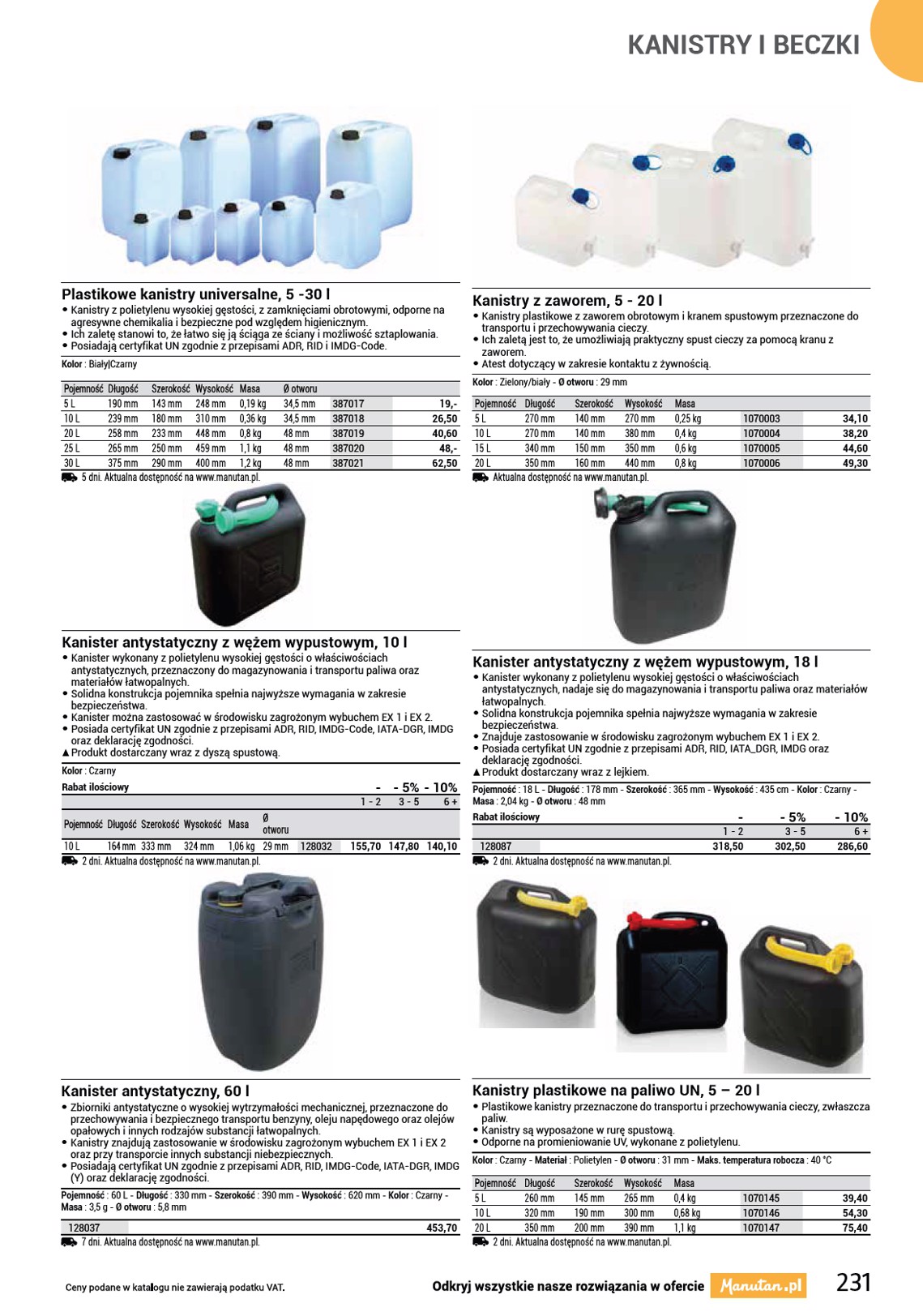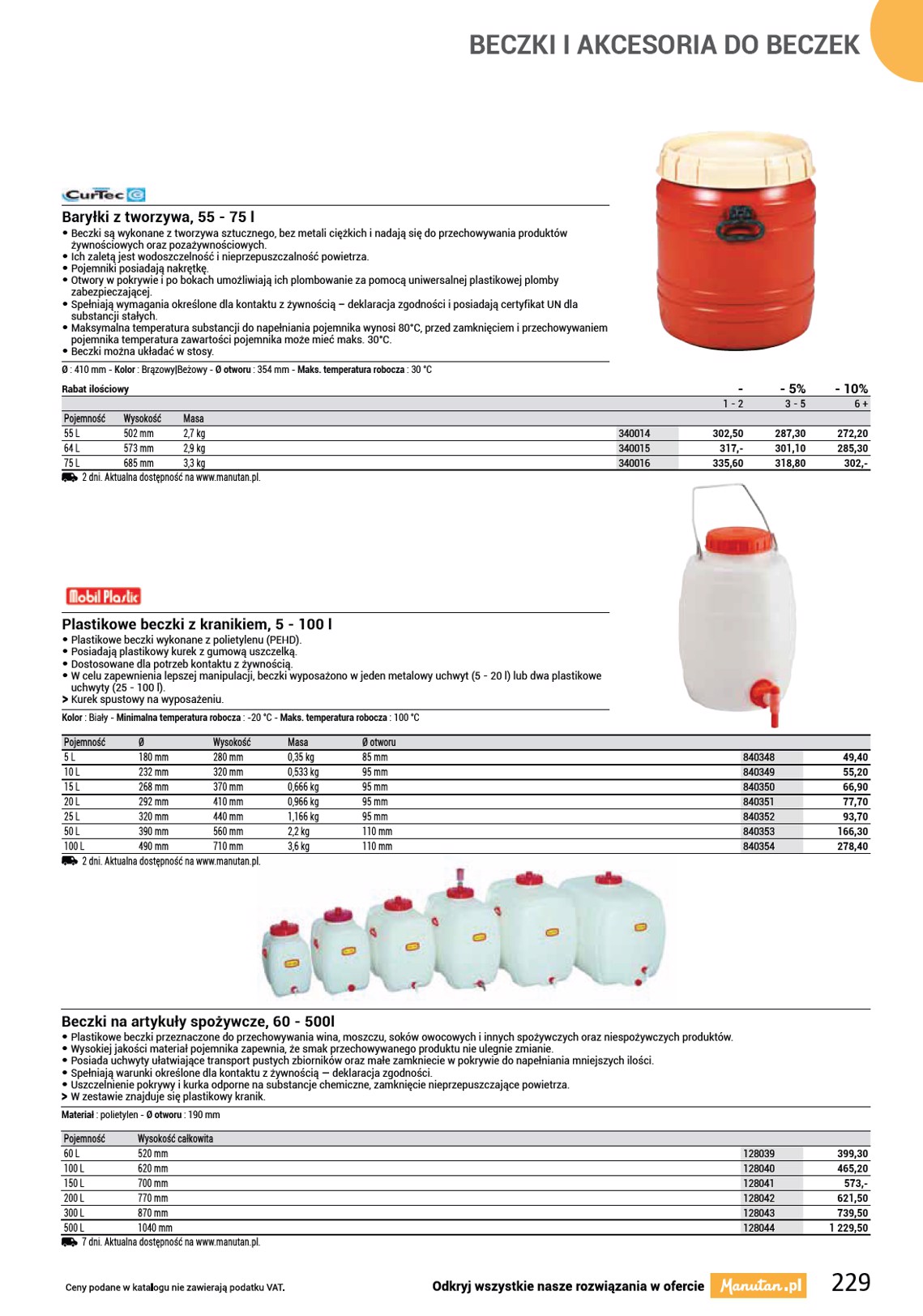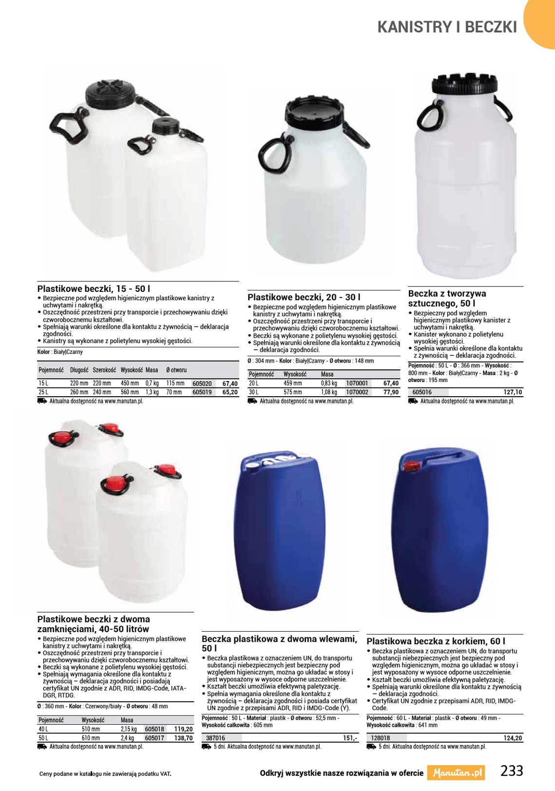 KANISTRY I BECZKI Plastikowe beczki, 15 - 50 l • Bezpieczne pod względem higienicznym plastikowe kanistry z uchwytami i nakrętką. • Oszczędność przestrzeni przy transporcie i przechowywaniu dzięki czworobocznemu kształtowi. • Spełniają warunki określone dla kontaktu z żywnością — deklaracja zgodności. • Kanistry są wykonane z polietylenu wysokiej gęstości. Kolor : Biały|Czarny Pojemność Długość Szerokość Wysokość Masa 15 L 220 mm 220 mm 450 mm 0,7 kg 25 L 260 mm 240 mm 560 mm 1,3 kg Aktualna dostępność na www.manutan.pl. Ø otworu 115 mm 70 mm 605020 605019 67,40 65,20 Plastikowe beczki, 20 - 30 l • Bezpieczne pod względem higienicznym plastikowe kanistry z uchwytami i nakrętką. • Oszczędność przestrzeni przy transporcie i przechowywaniu dzięki czworobocznemu kształtowi. • Beczki są wykonane z polietylenu wysokiej gęstości. • Spełniają warunki określone dla kontaktu z żywnością — deklaracja zgodności. Ø : 304 mm - Kolor : Biały|Czarny - Ø otworu : 148 mm Pojemność Wysokość Masa 20 L 459 mm 0,83 kg 1070001 30 L 575 mm 1,08 kg 1070002 Aktualna dostępność na www.manutan.pl. 67,40 77,90 Beczka z tworzywa sztucznego, 50 l • Bezpieczny pod względem higienicznym plastikowy kanister z uchwytami i nakrętką. • Kanister wykonano z polietylenu wysokiej gęstości. • Spełnia warunki określone dla kontaktu z żywnością — deklaracja zgodności. Pojemność : 50 L - Ø : 366 mm - Wysokość : 800 mm - Kolor : Biały|Czarny - Masa : 2 kg - Ø otworu : 195 mm 605016 127,10 Aktualna dostępność na www.manutan.pl. Plastikowe beczki z dwoma zamknięciami, 40-50 litrów • Bezpieczne pod względem higienicznym plastikowe kanistry z uchwytami i nakrętką. • Oszczędność przestrzeni przy transporcie i przechowywaniu dzięki czworobocznemu kształtowi. • Beczki są wykonane z polietylenu wysokiej gęstości. • Spełniają wymagania określone dla kontaktu z żywnością – deklaracja zgodności i posiadają certyfikat UN zgodnie z ADR, RID, IMDG-Code, IATA- DGR, RTDG. Ø : 360 mm - Kolor : Czerwony/biały - Ø otworu : 48 mm Pojemność Wysokość Masa 40 L 510 mm 2,15 kg 605018 50 L 610 mm 2,4 kg 605017 Aktualna dostępność na www.manutan.pl. 119,20 138,70 Beczka plastikowa z dwoma wlewami, 50 l • Beczka plastikowa z oznaczeniem UN, do transportu substancji niebezpiecznych jest bezpieczny pod względem higienicznym, można go układać w stosy i jest wyposażony w wysoce odporne uszczelnienie. • Kształt beczki umożliwia efektywną paletyzację. • Spełnia wymagania określone dla kontaktu z żywnością – deklaracja zgodności i posiada certyfikat UN zgodnie z przepisami ADR, RID i IMDG-Code (Y). Pojemność : 50 L - Materiał : plastik - Ø otworu : 52,5 mm - Wysokość całkowita : 605 mm 387016 5 dni. Aktualna dostępność na www.manutan.pl. 151,- Plastikowa beczka z korkiem, 60 l • Beczka plastikowa z oznaczeniem UN, do transportu substancji niebezpiecznych jest bezpieczny pod względem higienicznym, można go układać w stosy i jest wyposażony w wysoce odporne uszczelnienie. • Kształt beczki umożliwia efektywną paletyzację. • Spełniają warunki określone dla kontaktu z żywnością — deklaracja zgodności. • Certyfikat UN zgodnie z przepisami ADR, RID, IMDG- Code. Pojemność : 60 L - Materiał : plastik - Ø otworu : 49 mm - Wysokość całkowita : 641 mm 128018 5 dni. Aktualna dostępność na www.manutan.pl. 124,20 233