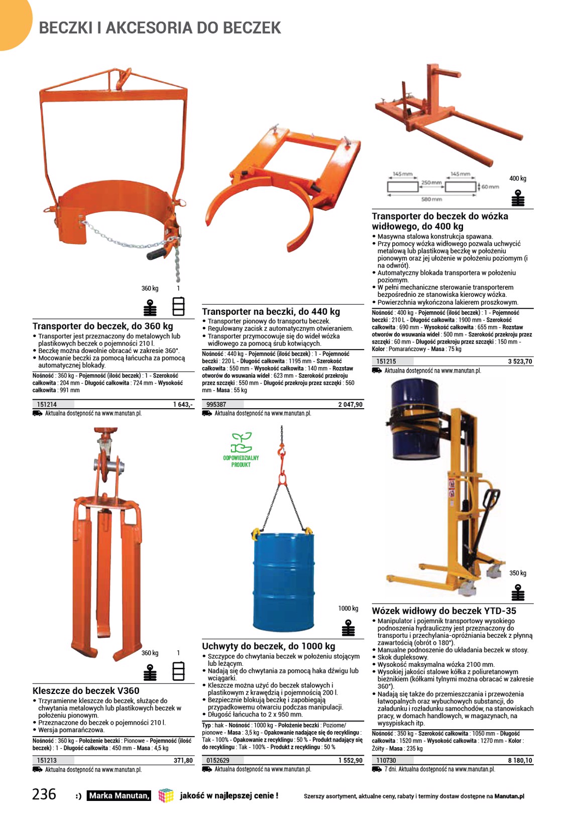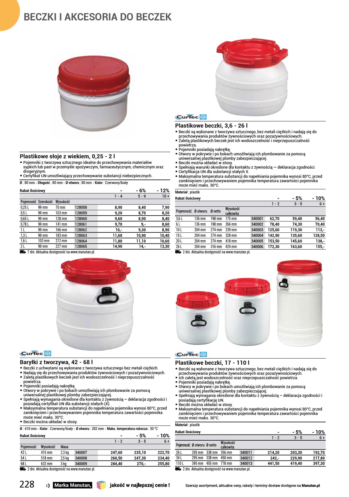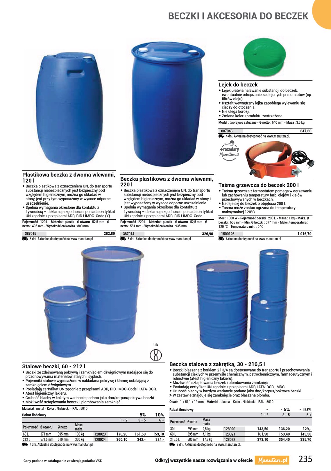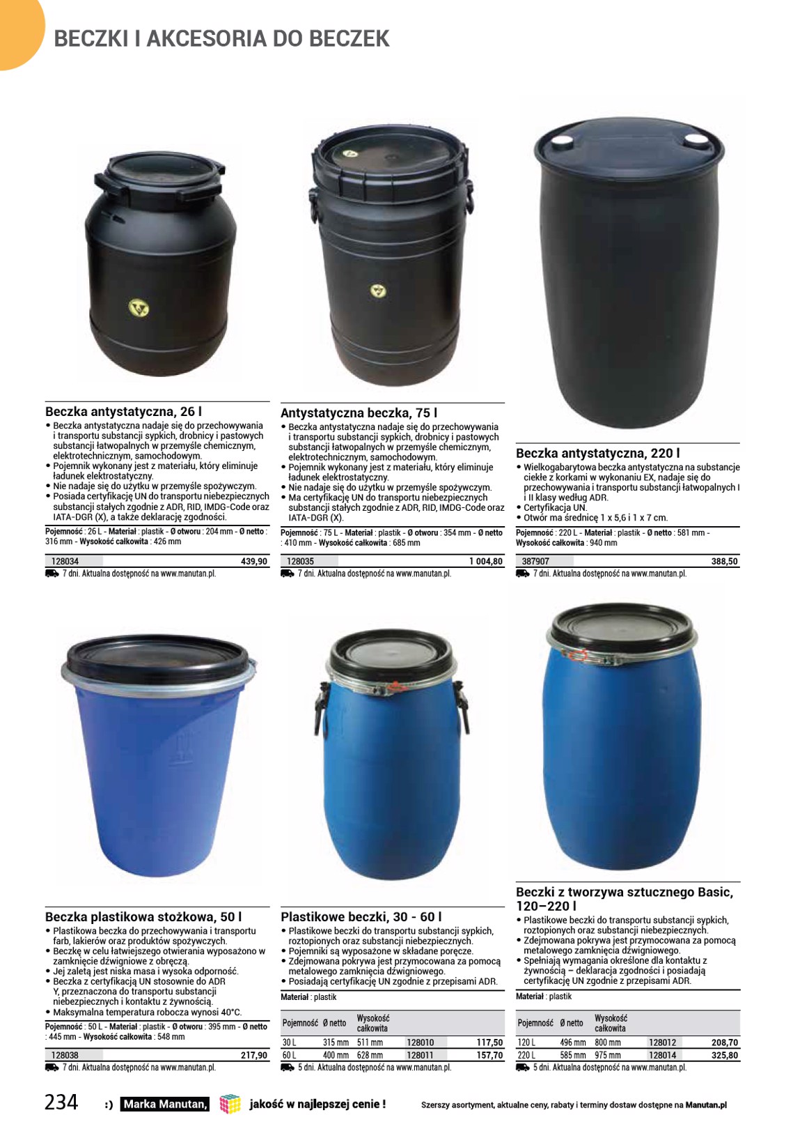 KANISTRY I BECZKI Plastikowe beczki, 15 - 50 l • Bezpieczne pod względem higienicznym plastikowe kanistry z uchwytami i nakrętką. • Oszczędność przestrzeni przy transporcie i przechowywaniu dzięki czworobocznemu kształtowi. • Spełniają warunki określone dla kontaktu z żywnością — deklaracja zgodności. • Kanistry są wykonane z polietylenu wysokiej gęstości. Kolor : Biały|Czarny Pojemność Długość Szerokość Wysokość Masa 15 L 220 mm 220 mm 450 mm 0,7 kg 25 L 260 mm 240 mm 560 mm 1,3 kg Aktualna dostępność na www.manutan.pl. Ø otworu 115 mm 70 mm 605020 605019 67,40 65,20 Plastikowe beczki, 20 - 30 l • Bezpieczne pod względem higienicznym plastikowe kanistry z uchwytami i nakrętką. • Oszczędność przestrzeni przy transporcie i przechowywaniu dzięki czworobocznemu kształtowi. • Beczki są wykonane z polietylenu wysokiej gęstości. • Spełniają warunki określone dla kontaktu z żywnością — deklaracja zgodności. Ø : 304 mm - Kolor : Biały|Czarny - Ø otworu : 148 mm Pojemność Wysokość Masa 20 L 459 mm 0,83 kg 1070001 30 L 575 mm 1,08 kg 1070002 Aktualna dostępność na www.manutan.pl. 67,40 77,90 Beczka z tworzywa sztucznego, 50 l • Bezpieczny pod względem higienicznym plastikowy kanister z uchwytami i nakrętką. • Kanister wykonano z polietylenu wysokiej gęstości. • Spełnia warunki określone dla kontaktu z żywnością — deklaracja zgodności. Pojemność : 50 L - Ø : 366 mm - Wysokość : 800 mm - Kolor : Biały|Czarny - Masa : 2 kg - Ø otworu : 195 mm 605016 127,10 Aktualna dostępność na www.manutan.pl. Plastikowe beczki z dwoma zamknięciami, 40-50 litrów • Bezpieczne pod względem higienicznym plastikowe kanistry z uchwytami i nakrętką. • Oszczędność przestrzeni przy transporcie i przechowywaniu dzięki czworobocznemu kształtowi. • Beczki są wykonane z polietylenu wysokiej gęstości. • Spełniają wymagania określone dla kontaktu z żywnością – deklaracja zgodności i posiadają certyfikat UN zgodnie z ADR, RID, IMDG-Code, IATA- DGR, RTDG. Ø : 360 mm - Kolor : Czerwony/biały - Ø otworu : 48 mm Pojemność Wysokość Masa 40 L 510 mm 2,15 kg 605018 50 L 610 mm 2,4 kg 605017 Aktualna dostępność na www.manutan.pl. 119,20 138,70 Beczka plastikowa z dwoma wlewami, 50 l • Beczka plastikowa z oznaczeniem UN, do transportu substancji niebezpiecznych jest bezpieczny pod względem higienicznym, można go układać w stosy i jest wyposażony w wysoce odporne uszczelnienie. • Kształt beczki umożliwia efektywną paletyzację. • Spełnia wymagania określone dla kontaktu z żywnością – deklaracja zgodności i posiada certyfikat UN zgodnie z przepisami ADR, RID i IMDG-Code (Y). Pojemność : 50 L - Materiał : plastik - Ø otworu : 52,5 mm - Wysokość całkowita : 605 mm 387016 5 dni. Aktualna dostępność na www.manutan.pl. 151,- Plastikowa beczka z korkiem, 60 l • Beczka plastikowa z oznaczeniem UN, do transportu substancji niebezpiecznych jest bezpieczny pod względem higienicznym, można go układać w stosy i jest wyposażony w wysoce odporne uszczelnienie. • Kształt beczki umożliwia efektywną paletyzację. • Spełniają warunki określone dla kontaktu z żywnością — deklaracja zgodności. • Certyfikat UN zgodnie z przepisami ADR, RID, IMDG- Code. Pojemność : 60 L - Materiał : plastik - Ø otworu : 49 mm - Wysokość całkowita : 641 mm 128018 5 dni. Aktualna dostępność na www.manutan.pl. 124,20 233