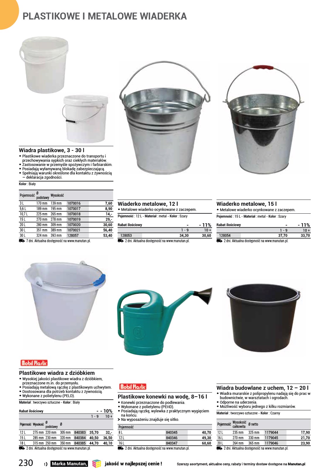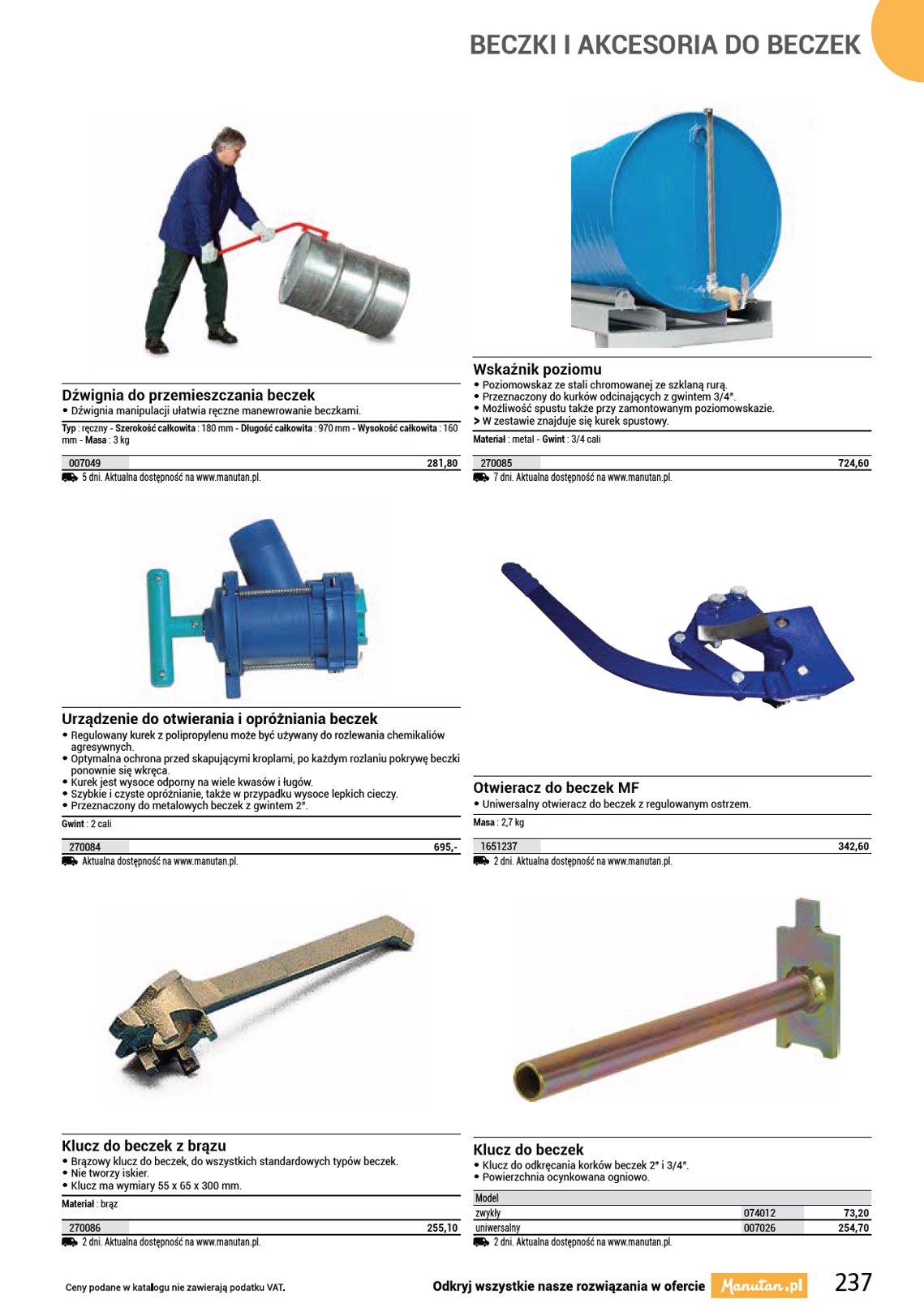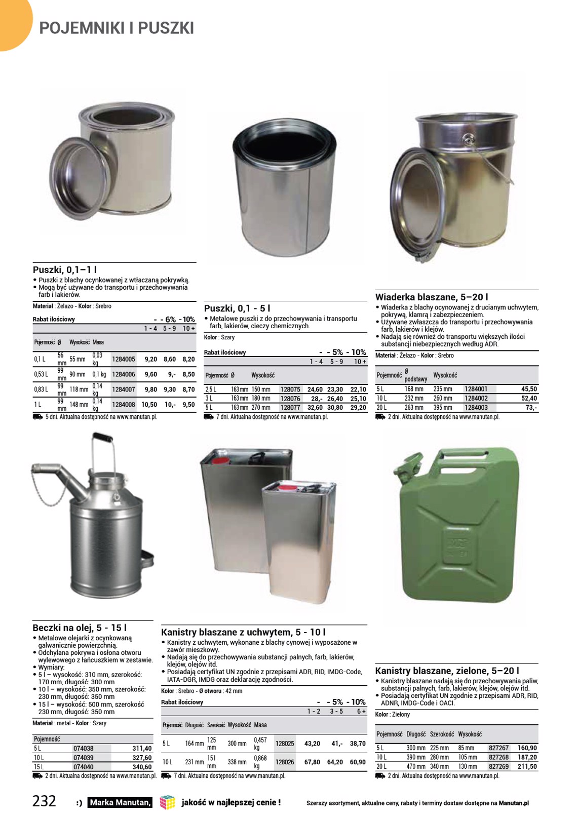POJEMNIKI I PUSZKI Puszki, 0,1–1 l • Puszki z blachy ocynkowanej z wtłaczaną pokrywką. • Mogą być używane do transportu i przechowywania farb i lakierów. Materiał : Żelazo - Kolor : Srebro Rabat ilościowy - - 6% -10% 1 - 4 5 - 9 10 + Pojemność Ø Wysokość Masa 0,1 L 56 55 mm 0,03 1284005 9,20 8,60 8,20 mm kg 0,53 L 99 90 mm 0,1 kg 1284006 9,60 9,- 8,50 mm 0,83 L 99 118 mm 0,14 mm kg 1284007 9,80 9,30 8,70 1 L 99 148 mm 0,14 1284008 10,50 10,- 9,50 mm kg 5 dni. Aktualna dostępność na www.manutan.pl. Puszki, 0,1 - 5 l • Metalowe puszki z do przechowywania i transportu farb, lakierów, cieczy chemicznych. Kolor : Szary Rabat ilościowy - - 5% - 10% 1 - 4 5 - 9 10 + Pojemność Ø Wysokość 2,5 L 163 mm 150 mm 128075 24,60 23,30 3 L 163 mm 180 mm 128076 28,- 26,40 5 L 163 mm 270 mm 128077 32,60 30,80 7 dni. Aktualna dostępność na www.manutan.pl. 22,10 25,10 29,20 Wiaderka blaszane, 5–20 l • Wiaderka z blachy ocynowanej z drucianym uchwytem, pokrywą, klamrą i zabezpieczeniem. • Używane zwłaszcza do transportu i przechowywania farb, lakierów i klejów. • Nadają się również do transportu większych ilości substancji niebezpiecznych według ADR. Materiał : Żelazo - Kolor : Srebro Pojemność Ø Wysokość podstawy 5 L 168 mm 235 mm 1284001 10 L 232 mm 260 mm 1284002 20 L 263 mm 395 mm 1284003 2 dni. Aktualna dostępność na www.manutan.pl. 45,50 52,40 73,- Beczki na olej, 5 - 15 l • Metalowe olejarki z ocynkowaną galwanicznie powierzchnią. • Odchylana pokrywa i osłona otworu wylewowego z łańcuszkiem w zestawie. • Wymiary: • 5 l – wysokość: 310 mm, szerokość: 170 mm, długość: 300 mm • 10 l – wysokość: 350 mm, szerokość: 230 mm, długość: 350 mm • 15 l – wysokość: 500 mm, szerokość 230 mm, długość: 350 mm Materiał : metal - Kolor : Szary Kanistry blaszane z uchwytem, 5 - 10 l • Kanistry z uchwytem, wykonane z blachy cynowej i wyposażone w zawór mieszkowy. • Nadają się do przechowywania substancji palnych, farb, lakierów, klejów, olejów itd. • Posiadają certyfikat UN zgodnie z przepisami ADR, RID, IMDG-Code, IATA-DGR, IMDG oraz deklarację zgodności. Kolor : Srebro - Ø otworu : 42 mm Rabat ilościowy - - 5% - 10% 1-2 3-5 6+ Pojemność Długość Szerokość Wysokość Masa Pojemność 5 L 074038 311,40 10 L 074039 327,60 15 L 074040 340,60 2 dni. Aktualna dostępność na www.manutan.pl. 5 L 164 mm 125 300 mm 0,457 128025 mm kg 10 L 231 mm 151 338 mm 0,868 128026 mm kg 7 dni. Aktualna dostępność na www.manutan.pl. 43,20 41,- 38,70 67,80 64,20 60,90 Kanistry blaszane, zielone, 5–20 l • Kanistry blaszane nadają się do przechowywania paliw, substancji palnych, farb, lakierów, klejów, olejów itd. • Posiadają certyfikat UN zgodnie z przepisami ADR, RID, ADNR, IMDG-Code i OACI. Kolor : Zielony Pojemność Długość Szerokość Wysokość 5 L 300 mm 225 mm 85 mm 827267 10 L 390 mm 280 mm 105 mm 827268 20 L 470 mm 340 mm 130 mm 827269 2 dni. Aktualna dostępność na www.manutan.pl. 160,90 187,20 211,50 232