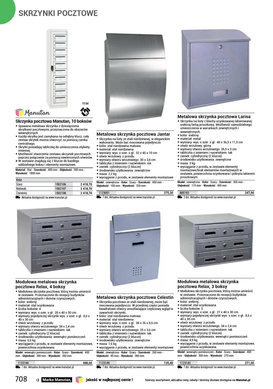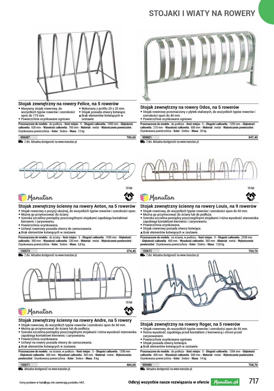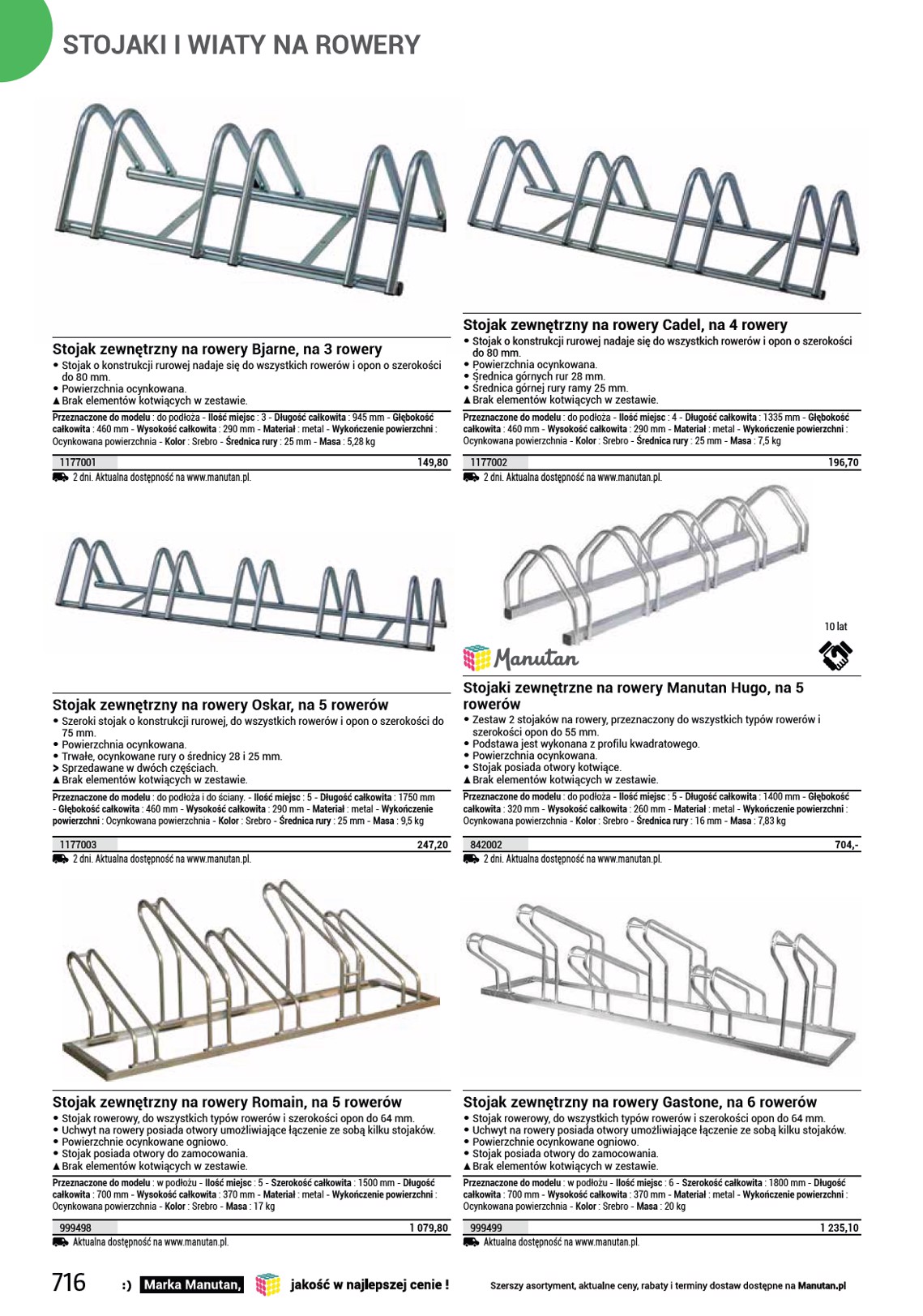 STOJAKI I WIATY NA ROWERY Stojak zewnętrzny na rowery Bjarne, na 3 rowery • Stojak o konstrukcji rurowej nadaje się do wszystkich rowerów i opon o szerokości do 80 mm. • Powierzchnia ocynkowana. SS Brak elementów kotwiących w zestawie. Przeznaczone do modelu : do podłoża - Ilość miejsc : 3 - Długość całkowita : 945 mm - Głębokość całkowita : 460 mm - Wysokość całkowita : 290 mm - Materiał : metal - Wykończenie powierzchni : Ocynkowana powierzchnia - Kolor : Srebro - Średnica rury : 25 mm - Masa : 5,28 kg 1177001 2 dni. Aktualna dostępność na www.manutan.pl. 149,80 Stojak zewnętrzny na rowery Cadel, na 4 rowery • Stojak o konstrukcji rurowej nadaje się do wszystkich rowerów i opon o szerokości do 80 mm. • Powierzchnia ocynkowana. • Średnica górnych rur 28 mm. • Średnica górnej rury ramy 25 mm. SS Brak elementów kotwiących w zestawie. Przeznaczone do modelu : do podłoża - Ilość miejsc : 4 - Długość całkowita : 1335 mm - Głębokość całkowita : 460 mm - Wysokość całkowita : 290 mm - Materiał : metal - Wykończenie powierzchni : Ocynkowana powierzchnia - Kolor : Srebro - Średnica rury : 25 mm - Masa : 7,5 kg 1177002 2 dni. Aktualna dostępność na www.manutan.pl. 196,70 10 lat Stojak zewnętrzny na rowery Oskar, na 5 rowerów • Szeroki stojak o konstrukcji rurowej, do wszystkich rowerów i opon o szerokości do 75 mm. • Powierzchnia ocynkowana. • Trwałe, ocynkowane rury o średnicy 28 i 25 mm. OO Sprzedawane w dwóch częściach. SS Brak elementów kotwiących w zestawie. Przeznaczone do modelu : do podłoża i do ściany. - Ilość miejsc : 5 - Długość całkowita : 1750 mm - Głębokość całkowita : 460 mm - Wysokość całkowita : 290 mm - Materiał : metal - Wykończenie powierzchni : Ocynkowana powierzchnia - Kolor : Srebro - Średnica rury : 25 mm - Masa : 9,5 kg 1177003 2 dni. Aktualna dostępność na www.manutan.pl. 247,20 Stojaki zewnętrzne na rowery Manutan Hugo, na 5 rowerów • Zestaw 2 stojaków na rowery, przeznaczony do wszystkich typów rowerów i szerokości opon do 55 mm. • Podstawa jest wykonana z profilu kwadratowego. • Powierzchnia ocynkowana. • Stojak posiada otwory kotwiące. SS Brak elementów kotwiących w zestawie. Przeznaczone do modelu : do podłoża - Ilość miejsc : 5 - Długość całkowita : 1400 mm - Głębokość całkowita : 320 mm - Wysokość całkowita : 260 mm - Materiał : metal - Wykończenie powierzchni : Ocynkowana powierzchnia - Kolor : Srebro - Średnica rury : 16 mm - Masa : 7,83 kg 842002 2 dni. Aktualna dostępność na www.manutan.pl. 704,- Stojak zewnętrzny na rowery Romain, na 5 rowerów • Stojak rowerowy, do wszystkich typów rowerów i szerokości opon do 64 mm. • Uchwyt na rowery posiada otwory umożliwiające łączenie ze sobą kilku stojaków. • Powierzchnie ocynkowane ogniowo. • Stojak posiada otwory do zamocowania. SS Brak elementów kotwiących w zestawie. Przeznaczone do modelu : w podłożu - Ilość miejsc : 5 - Szerokość całkowita : 1500 mm - Długość całkowita : 700 mm - Wysokość całkowita : 370 mm - Materiał : metal - Wykończenie powierzchni : Ocynkowana powierzchnia - Kolor : Srebro - Masa : 17 kg 999498 Aktualna dostępność na www.manutan.pl. 1 079,80 Stojak zewnętrzny na rowery Gastone, na 6 rowerów • Stojak rowerowy, do wszystkich typów rowerów i szerokości opon do 64 mm. • Uchwyt na rowery posiada otwory umożliwiające łączenie ze sobą kilku stojaków. • Powierzchnie ocynkowane ogniowo. • Stojak posiada otwory do zamocowania. SS Brak elementów kotwiących w zestawie. Przeznaczone do modelu : w podłożu - Ilość miejsc : 6 - Szerokość całkowita : 1800 mm - Długość całkowita : 700 mm - Wysokość całkowita : 370 mm - Materiał : metal - Wykończenie powierzchni : Ocynkowana powierzchnia - Kolor : Srebro - Masa : 20 kg 999499 Aktualna dostępność na www.manutan.pl. 1 235,10 716