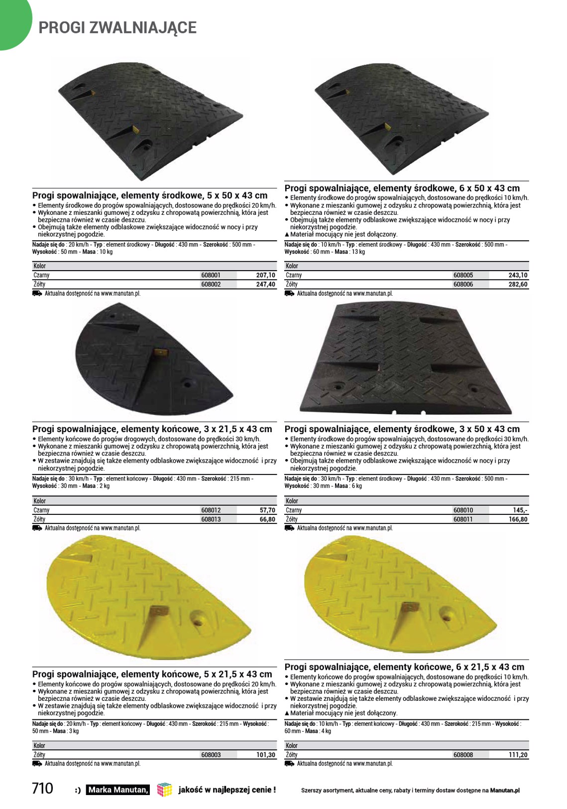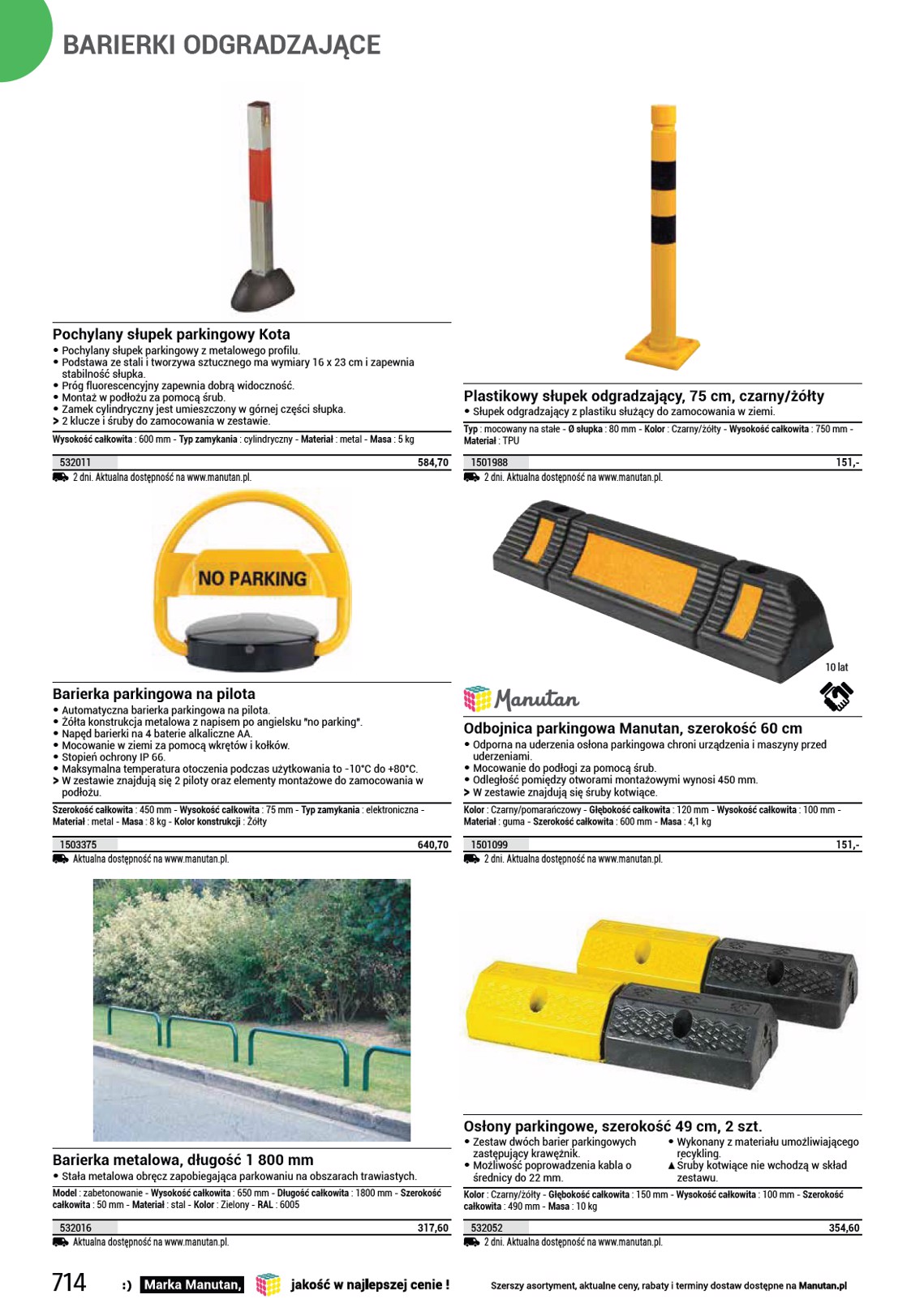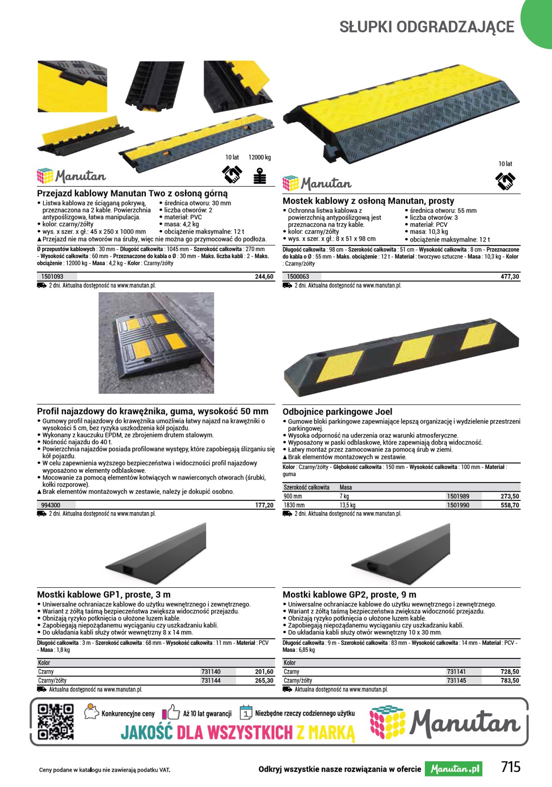SŁUPKI ODGRADZAJĄCE 10 lat 12000 kg 10 lat Przejazd kablowy Manutan Two z osłoną górną • Listwa kablowa ze ściąganą pokrywą, • średnica otworu: 30 mm przeznaczona na 2 kable. Powierzchnia • liczba otworów: 2 antypoślizgowa, łatwa manipulacja. • materiał: PVC • kolor: czarny/żółty • masa: 4,2 kg • wys. x szer. x gł.: 45 x 250 x 1000 mm • obciążenie maksymalne: 12 t SS Przejazd nie ma otworów na śruby, więc nie można go przymocować do podłoża. Ø przepustów kablowych : 30 mm - Długość całkowita : 1045 mm - Szerokość całkowita : 270 mm - Wysokość całkowita : 60 mm - Przeznaczone do kabla o Ø : 30 mm - Maks. liczba kabli : 2 - Maks. obciążenie : 12000 kg - Masa : 4,2 kg - Kolor : Czarny/żółty 1501093 2 dni. Aktualna dostępność na www.manutan.pl. 244,60 Mostek kablowy z osłoną Manutan, prosty • Ochronna listwa kablowa z • średnica otworu: 55 mm powierzchnią antypoślizgową jest • liczba otworów: 3 przeznaczona na trzy kable. • materiał: PCV • kolor: czarny/żółty • masa: 10,3 kg • wys. x szer. x gł.: 8 x 51 x 98 cm • obciążenie maksymalne: 12 t Długość całkowita : 98 cm - Szerokość całkowita : 51 cm - Wysokość całkowita : 8 cm - Przeznaczone do kabla o Ø : 55 mm - Maks. obciążenie : 12 t - Materiał : tworzywo sztuczne - Masa : 10,3 kg - Kolor : Czarny/żółty 1500063 2 dni. Aktualna dostępność na www.manutan.pl. 477,30 Profil najazdowy do krawężnika, guma, wysokość 50 mm • Gumowy profil najazdowy do krawężnika umożliwia łatwy najazd na krawężniki o wysokości 5 cm, bez ryzyka uszkodzenia kół pojazdu. • Wykonany z kauczuku EPDM, ze zbrojeniem drutem stalowym. • Nośność najazdu do 40 t. • Powierzchnia najazdów posiada profilowane występy, które zapobiegają ślizganiu się kół pojazdu. • W celu zapewnienia wyższego bezpieczeństwa i widoczności profil najazdowy wyposażono w elementy odblaskowe. • Mocowanie za pomocą elementów kotwiących w nawierconych otworach (śrubki, kołki rozporowe). SS Brak elementów montażowych w zestawie, należy je dokupić osobno. 994300 2 dni. Aktualna dostępność na www.manutan.pl. 177,20 Odbojnice parkingowe Joel • Gumowe bloki parkingowe zapewniające lepszą organizację i wydzielenie przestrzeni parkingowej. • Wysoka odporność na uderzenia oraz warunki atmosferyczne. • Wyposażony w paski odblaskowe, które zapewniają dobrą widoczność. • Łatwy montaż przez zamocowanie za pomocą śrub w ziemi. SS Brak elementów montażowych w zestawie. Kolor : Czarny/żółty - Głębokość całkowita : 150 mm - Wysokość całkowita : 100 mm - Materiał : guma Szerokość całkowita Masa 900 mm 7 kg 1830 mm 13,5 kg 2 dni. Aktualna dostępność na www.manutan.pl. 1501989 1501990 273,50 558,70 Mostki kablowe GP1, proste, 3 m • Uniwersalne ochraniacze kablowe do użytku wewnętrznego i zewnętrznego. • Wariant z żółtą taśmą bezpieczeństwa zwiększa widoczność przejazdu. • Obniżają ryzyko potknięcia o ułożone luzem kable. • Zapobiegają niepożądanemu wyciąganiu czy uszkadzaniu kabli. • Do układania kabli służy otwór wewnętrzny 8 x 14 mm. Długość całkowita : 3 m - Szerokość całkowita : 68 mm - Wysokość całkowita : 11 mm - Materiał : PCV - Masa : 1,8 kg Kolor Czarny Czarny/żółty Aktualna dostępność na www.manutan.pl. 731140 731144 201,60 265,30 Mostki kablowe GP2, proste, 9 m • Uniwersalne ochraniacze kablowe do użytku wewnętrznego i zewnętrznego. • Wariant z żółtą taśmą bezpieczeństwa zwiększa widoczność przejazdu. • Obniżają ryzyko potknięcia o ułożone luzem kable. • Zapobiegają niepożądanemu wyciąganiu czy uszkadzaniu kabli. • Do układania kabli służy otwór wewnętrzny 10 x 30 mm. Długość całkowita : 9 m - Szerokość całkowita : 83 mm - Wysokość całkowita : 14 mm - Materiał : PCV - Masa : 6,85 kg Kolor Czarny Czarny/żółty Aktualna dostępność na www.manutan.pl. 731141 731145 728,50 783,50 715