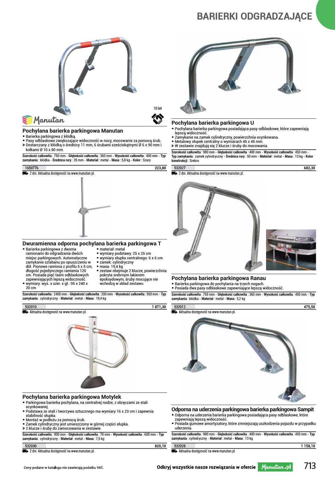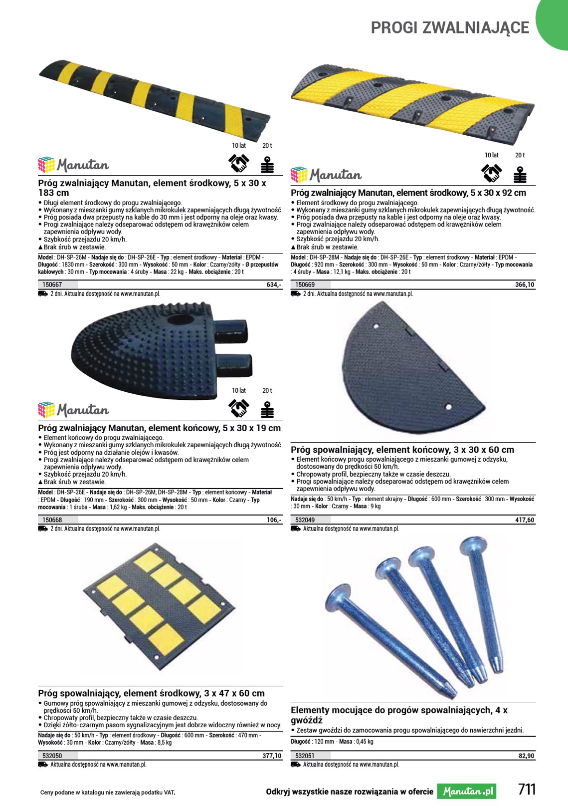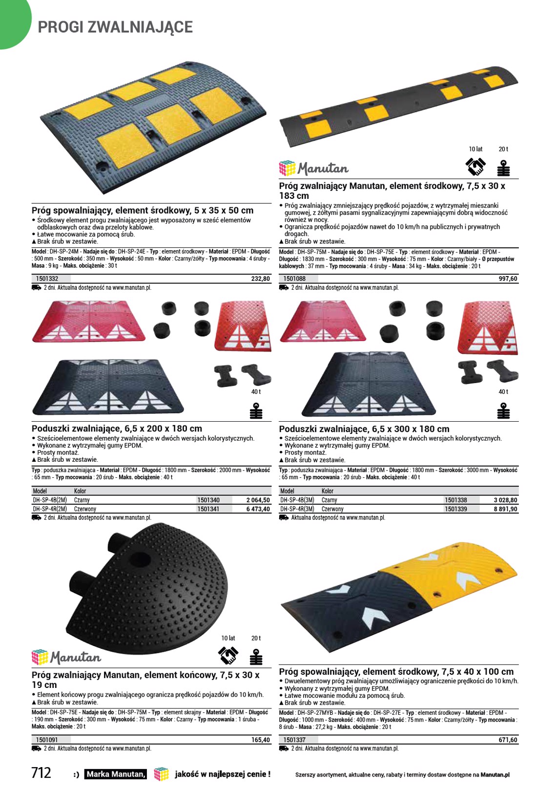 SŁUPKI ODGRADZAJĄCE 10 lat 12000 kg 10 lat Przejazd kablowy Manutan Two z osłoną górną • Listwa kablowa ze ściąganą pokrywą, • średnica otworu: 30 mm przeznaczona na 2 kable. Powierzchnia • liczba otworów: 2 antypoślizgowa, łatwa manipulacja. • materiał: PVC • kolor: czarny/żółty • masa: 4,2 kg • wys. x szer. x gł.: 45 x 250 x 1000 mm • obciążenie maksymalne: 12 t SS Przejazd nie ma otworów na śruby, więc nie można go przymocować do podłoża. Ø przepustów kablowych : 30 mm - Długość całkowita : 1045 mm - Szerokość całkowita : 270 mm - Wysokość całkowita : 60 mm - Przeznaczone do kabla o Ø : 30 mm - Maks. liczba kabli : 2 - Maks. obciążenie : 12000 kg - Masa : 4,2 kg - Kolor : Czarny/żółty 1501093 2 dni. Aktualna dostępność na www.manutan.pl. 244,60 Mostek kablowy z osłoną Manutan, prosty • Ochronna listwa kablowa z • średnica otworu: 55 mm powierzchnią antypoślizgową jest • liczba otworów: 3 przeznaczona na trzy kable. • materiał: PCV • kolor: czarny/żółty • masa: 10,3 kg • wys. x szer. x gł.: 8 x 51 x 98 cm • obciążenie maksymalne: 12 t Długość całkowita : 98 cm - Szerokość całkowita : 51 cm - Wysokość całkowita : 8 cm - Przeznaczone do kabla o Ø : 55 mm - Maks. obciążenie : 12 t - Materiał : tworzywo sztuczne - Masa : 10,3 kg - Kolor : Czarny/żółty 1500063 2 dni. Aktualna dostępność na www.manutan.pl. 477,30 Profil najazdowy do krawężnika, guma, wysokość 50 mm • Gumowy profil najazdowy do krawężnika umożliwia łatwy najazd na krawężniki o wysokości 5 cm, bez ryzyka uszkodzenia kół pojazdu. • Wykonany z kauczuku EPDM, ze zbrojeniem drutem stalowym. • Nośność najazdu do 40 t. • Powierzchnia najazdów posiada profilowane występy, które zapobiegają ślizganiu się kół pojazdu. • W celu zapewnienia wyższego bezpieczeństwa i widoczności profil najazdowy wyposażono w elementy odblaskowe. • Mocowanie za pomocą elementów kotwiących w nawierconych otworach (śrubki, kołki rozporowe). SS Brak elementów montażowych w zestawie, należy je dokupić osobno. 994300 2 dni. Aktualna dostępność na www.manutan.pl. 177,20 Odbojnice parkingowe Joel • Gumowe bloki parkingowe zapewniające lepszą organizację i wydzielenie przestrzeni parkingowej. • Wysoka odporność na uderzenia oraz warunki atmosferyczne. • Wyposażony w paski odblaskowe, które zapewniają dobrą widoczność. • Łatwy montaż przez zamocowanie za pomocą śrub w ziemi. SS Brak elementów montażowych w zestawie. Kolor : Czarny/żółty - Głębokość całkowita : 150 mm - Wysokość całkowita : 100 mm - Materiał : guma Szerokość całkowita Masa 900 mm 7 kg 1830 mm 13,5 kg 2 dni. Aktualna dostępność na www.manutan.pl. 1501989 1501990 273,50 558,70 Mostki kablowe GP1, proste, 3 m • Uniwersalne ochraniacze kablowe do użytku wewnętrznego i zewnętrznego. • Wariant z żółtą taśmą bezpieczeństwa zwiększa widoczność przejazdu. • Obniżają ryzyko potknięcia o ułożone luzem kable. • Zapobiegają niepożądanemu wyciąganiu czy uszkadzaniu kabli. • Do układania kabli służy otwór wewnętrzny 8 x 14 mm. Długość całkowita : 3 m - Szerokość całkowita : 68 mm - Wysokość całkowita : 11 mm - Materiał : PCV - Masa : 1,8 kg Kolor Czarny Czarny/żółty Aktualna dostępność na www.manutan.pl. 731140 731144 201,60 265,30 Mostki kablowe GP2, proste, 9 m • Uniwersalne ochraniacze kablowe do użytku wewnętrznego i zewnętrznego. • Wariant z żółtą taśmą bezpieczeństwa zwiększa widoczność przejazdu. • Obniżają ryzyko potknięcia o ułożone luzem kable. • Zapobiegają niepożądanemu wyciąganiu czy uszkadzaniu kabli. • Do układania kabli służy otwór wewnętrzny 10 x 30 mm. Długość całkowita : 9 m - Szerokość całkowita : 83 mm - Wysokość całkowita : 14 mm - Materiał : PCV - Masa : 6,85 kg Kolor Czarny Czarny/żółty Aktualna dostępność na www.manutan.pl. 731141 731145 728,50 783,50 715