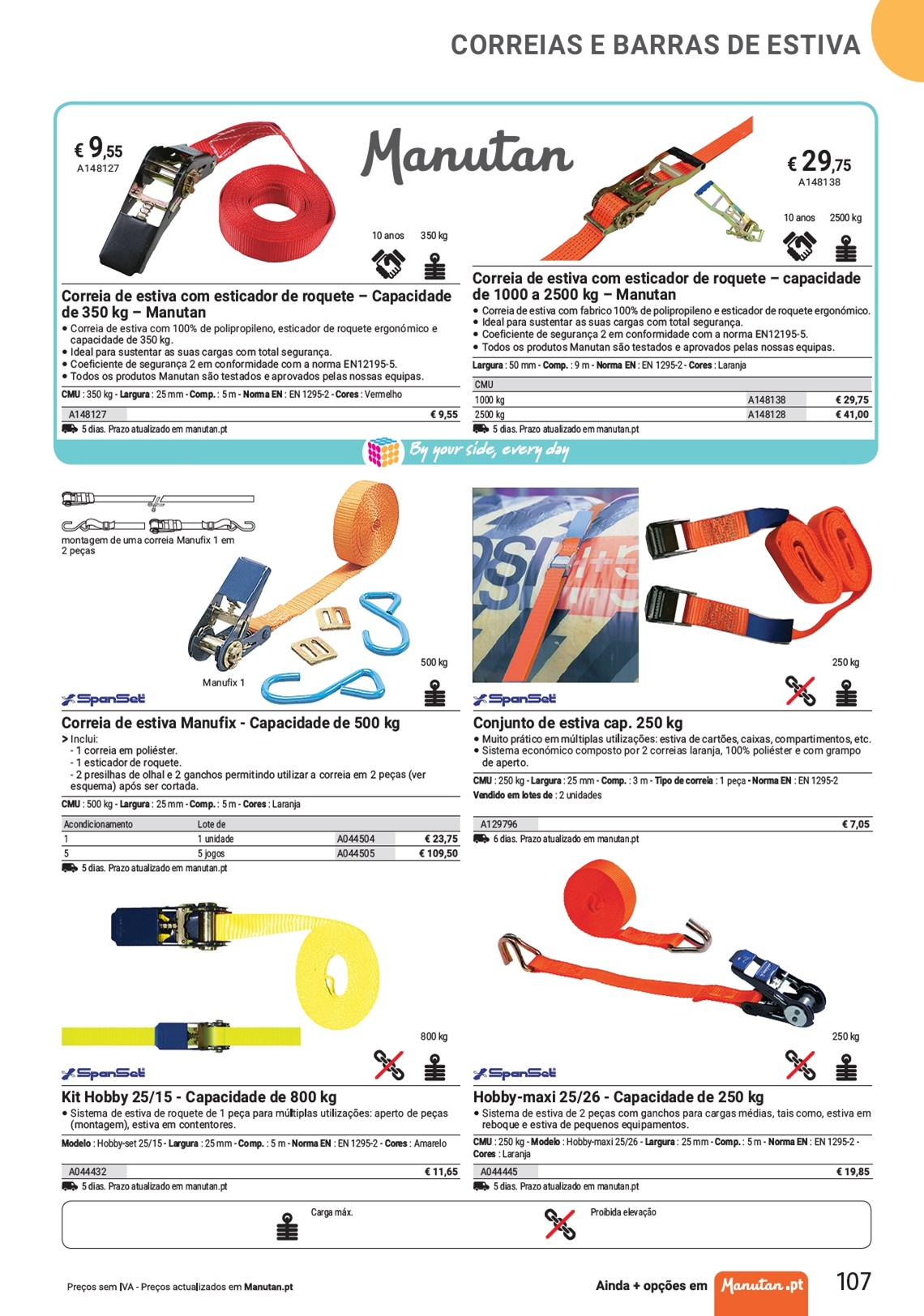 CORREIAS E BARRAS DE ESTIVA 9€ ,55 A148127 10 anos 350 kg € 29,75 A148138 10 anos 2500 kg Correia de estiva com esticador de roquete – Capacidade de 350 kg – Manutan • Correia de estiva com 100% de polipropileno, esticador de roquete ergonómico e capacidade de 350 kg. • Ideal para sustentar as suas cargas com total segur • Coeficiente de segur 2 em conformidade com a norma EN12195-5. • Todos os produtos Manutan são testados e aprovados pelas nossas equipas. CMU : 350 kg - Largura : 25 mm - Comp. : 5 m - Norma EN : EN 1295-2 - Cores : Vermelho A148127 5 dias. Prazo atualizado em manutan.pt € 9,55 Correia de estiva com esticador de roquete – capacidade de 1000 a 2500 kg – Manutan • Correia de estiva com fabrico 100% de polipropileno e esticador de roquete ergonómico. • Ideal para sustentar as suas cargas com total segur • Coeficiente de segur 2 em conformidade com a norma EN12195-5. • Todos os produtos Manutan são testados e aprovados pelas nossas equipas. Largura : 50 mm - Comp. : 9 m - Norma EN : EN 1295-2 - Cores : Laranja CMU 1000 kg 2500 kg 5 dias. Prazo atualizado em manutan.pt A148138 A148128 € 29,75 € 41,00 montagem de uma correia Manufix 1 em 2 Manufix 1 500 kg 250 kg Correia de estiva Manufix - Capacidade de 500 kg O Inclui: - 1 correia em poliéster. - 1 esticador de roquete. - 2 presilhas de olhal e 2 ganchos permitindo utilizar a correia em 2 (ver esquema) após ser cortada. CMU : 500 kg - Largura : 25 mm - Comp. : 5 m - Cores : Laranja Acondicionamento Lote de 1 1 unidade 5 5 jogos 5 dias. Prazo atualizado em manutan.pt A044504 A044505 € 23,75 € 109,50 Conjunto de estiva cap. 250 kg • Muito prático em múltiplas estiva de cartões, caixas, compartimentos, etc. • Sistema económico composto por 2 correias laranja, 100% poliéster e com grampo de aperto. CMU : 250 kg - Largura : 25 mm - Comp. : 3 m - Tipo de correia : 1 Vendido em lotes de : 2 unidades Norma EN : EN 1295-2 A129796 6 dias. Prazo atualizado em manutan.pt € 7,05 800 kg 250 kg Kit Hobby 25/15 - Capacidade de 800 kg • Sistema de estiva de roquete de 1 a (montagem), estiva em contentores. aperto de Modelo : Hobby-set 25/15 - Largura : 25 mm - Comp. : 5 m - Norma EN : EN 1295-2 - Cores : Amarelo A044432 5 dias. Prazo atualizado em manutan.pt € 11,65 Hobby-maxi 25/26 - Capacidade de 250 kg • Sistema de estiva de 2 a cargas médias, tais como, estiva em reboque e estiva de pequenos equipamentos. CMU : 250 kg - Modelo : Hobby-maxi 25/26 - Largura : 25 mm - Comp. : 5 m - Norma EN : EN 1295-2 Cores : Laranja A044445 5 dias. Prazo atualizado em manutan.pt € 19,85 Carga máx. Proibida elev 107