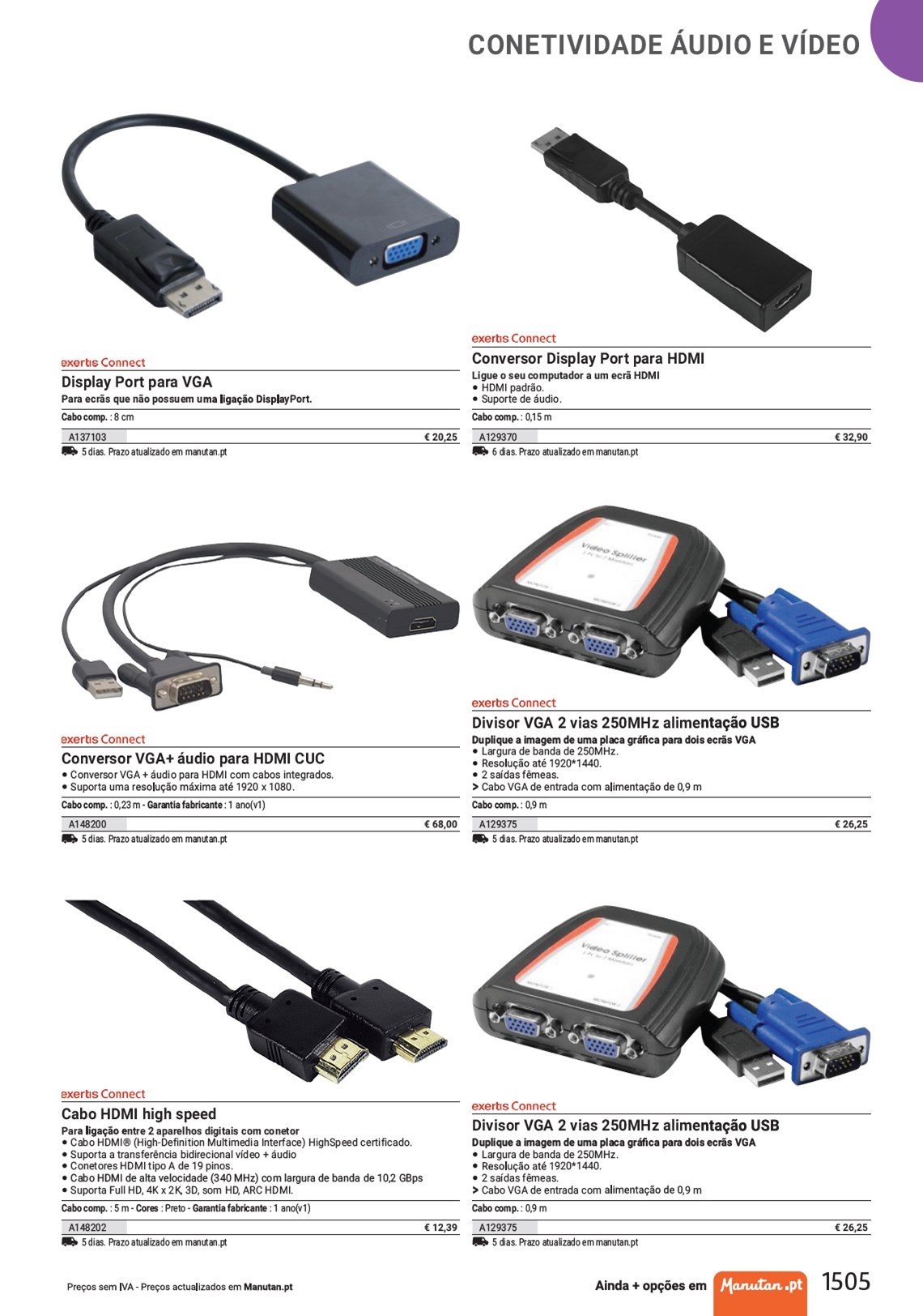 CONETIVIDADE ÁUDIO E VÍDEO Display Port para VGA Para ecrãs que não possuem u Cabo comp. : 8 cm A137103 5 dias. Prazo atualizado em manutan.pt yPort. € 20,25 Conversor Display Port para HDMI Ligue o seu computador a um ecrã HDMI • HDMI padrão. • Suporte de áudio. Cabo comp. : 0,15 m A129370 6 dias. Prazo atualizado em manutan.pt € 32,90 Conversor VGA+ áudio para HDMI CUC • Conversor VGA + áudio para HDMI com cabos integrados. • Suporta uma r 920 x 1080. Cabo comp. : 0,23 m - Garantia fabricante : 1 ano(v1) A148200 5 dias. Prazo atualizado em manutan.pt € 68,00 Divisor VGA 2 vias 250MHz alime Duplique a imagem de uma placa gráfica para dois ecrãs VGA • Largura de banda de 250MHz. • 920*1440. • 2 saídas fêmeas. O Cabo VGA de entrada com ,9 m Cabo comp. : 0,9 m A129375 5 dias. Prazo atualizado em manutan.pt € 26,25 Cabo HDMI high speed Par ntre 2 aparelhos digitais com conetor • Cabo HDMI® (High-Definition Multimedia Interface) HighSpeed certificado. • Suporta a transferência bidirecional vídeo + áudio • Conetores HDMI tipo A de 19 pinos. • Cabo HDMI de alta velocidade (340 MHz) com largura de banda de 10,2 GBps • Suporta Full HD, 4K x 2K, 3D, som HD, ARC HDMI. Cabo comp. : 5 m - Cores : Preto - Garantia fabricante : 1 ano(v1) A148202 5 dias. Prazo atualizado em manutan.pt € 12,39 Divisor VGA 2 vias 250MHz alime Duplique a imagem de uma placa gráfica para dois ecrãs VGA • Largura de banda de 250MHz. • 920*1440. • 2 saídas fêmeas. O Cabo VGA de entrada com ,9 m Cabo comp. : 0,9 m A129375 5 dias. Prazo atualizado em manutan.pt € 26,25 1505