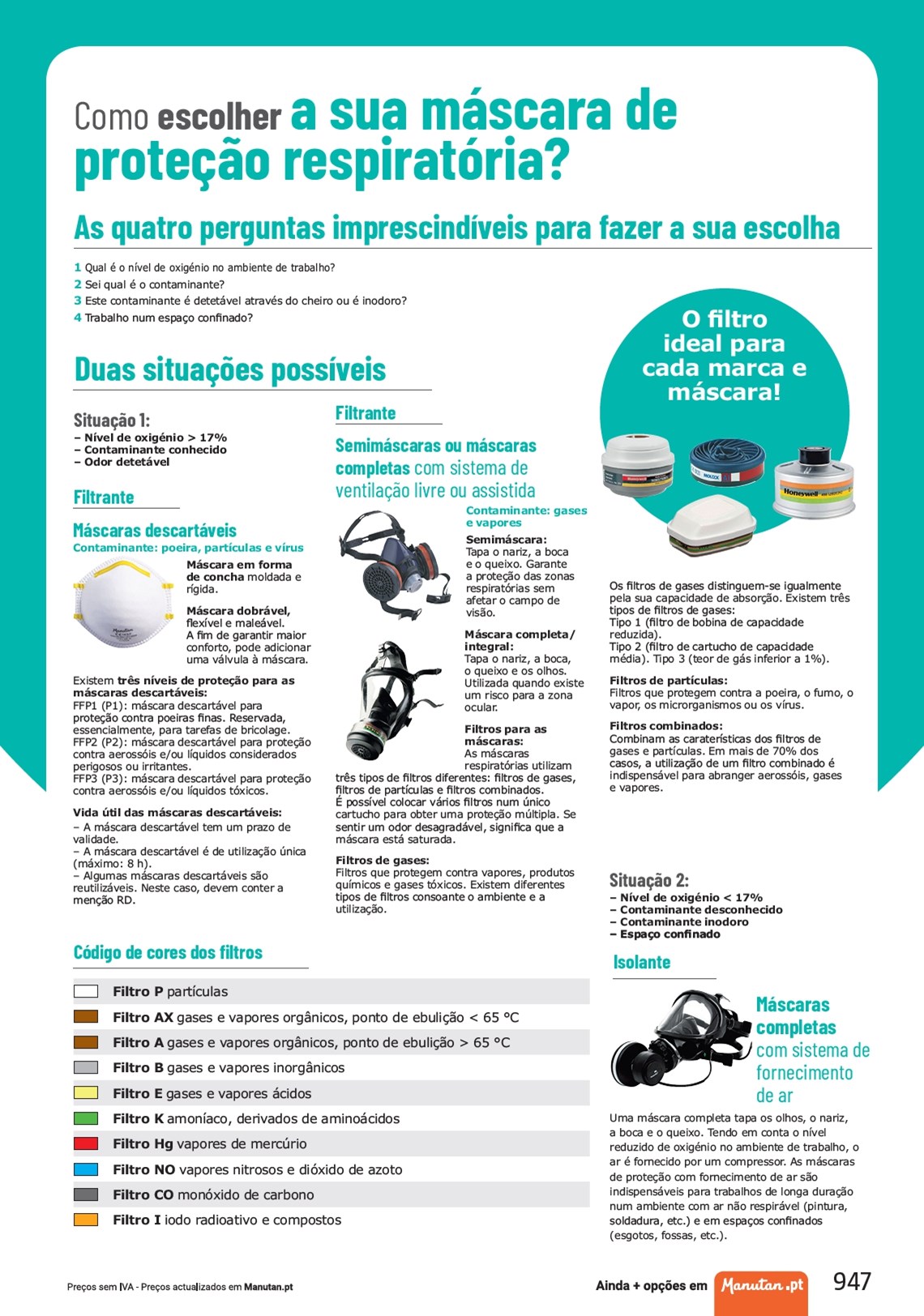 Cpormooteesçcoãlhoerraesspuiaramtóársicaa?ra de As quatro perguntas imprescindíveis para fazer a sua escolha 1 Qual é o nível de oxigénio no ambiente de trabalho? 2 Sei qual é o contaminante? 3 Este contaminante é detetável através do cheiro ou é inodoro? 4 Trabalho num espaço confinado? Duas situações possíveis Situação 1: – Nível de oxigénio > 17% – Contaminante conhecido – Odor detetável Filtrante Máscaras descartáveis Contaminante: poeira, partículas e vírus Máscara em forma de concha moldada e rígida. Máscara dobrável, flexível e maleável. A fim de garantir maior conforto, pode adicionar uma válvula à máscara. Existem três níveis de proteção para as máscaras descartáveis: FFP1 (P1): máscara descartável para proteção contra poeiras finas. Reservada, essencialmente, para tarefas de bricolage. FFP2 (P2): máscara descartável para proteção contra aerossóis e/ou líquidos considerados perigosos ou irritantes. FFP3 (P3): máscara descartável para proteção contra aerossóis e/ou líquidos tóxicos. Vida útil das máscaras descartáveis: – A máscara descartável tem um prazo de validade. – A máscara descartável é de utilização única (máximo: 8 h). – Algumas máscaras descartáveis são reutilizáveis. Neste caso, devem conter a menção RD. Filtrante Semimáscaras ou máscaras completas com sistema de ventilação livre ou assistida Contaminante: gases e vapores Semimáscara: Tapa o nariz, a boca e o queixo. Garante a proteção das zonas respiratórias sem afetar o campo de visão. Máscara completa/ integral: Tapa o nariz, a boca, o queixo e os olhos. Utilizada quando existe um risco para a zona ocular. Filtros para as máscaras: As máscaras respiratórias utilizam três tipos de filtros diferentes: filtros de gases, filtros de partículas e filtros combinados. É possível colocar vários filtros num único cartucho para obter uma proteção múltipla. Se sentir um odor desagradável, significa que a máscara está saturada. Filtros de gases: Filtros que protegem contra vapores, produtos químicos e gases tóxicos. Existem diferentes tipos de filtros consoante o ambiente e a utilização. Código de cores dos filtros Filtro P partículas Filtro AX gases e vapores orgânicos, ponto de ebulição < 65 °C Filtro A gases e vapores orgânicos, ponto de ebulição > 65 °C Filtro B gases e vapores inorgânicos Filtro E gases e vapores ácidos Filtro K amoníaco, derivados de aminoácidos Filtro Hg vapores de mercúrio Filtro NO vapores nitrosos e dióxido de azoto Filtro CO monóxido de carbono Filtro I iodo radioativo e compostos O filtro ideal para cada marca e máscara! Os filtros de gases distinguem-se igualmente pela sua capacidade de absorção. Existem três tipos de filtros de gases: Tipo 1 (filtro de bobina de capacidade reduzida). Tipo 2 (filtro de cartucho de capacidade média). Tipo 3 (teor de gás inferior a 1%). Filtros de partículas: Filtros que protegem contra a poeira, o fumo, o vapor, os microrganismos ou os vírus. Filtros combinados: Combinam as caraterísticas dos filtros de gases e partículas. Em mais de 70% dos casos, a utilização de um filtro combinado é indispensável para abranger aerossóis, gases e vapores. Situação 2: – Nível de oxigénio < 17% – Contaminante desconhecido – Contaminante inodoro – Espaço confinado Isolante Máscaras completas com sistema de fornecimento de ar Uma máscara completa tapa os olhos, o nariz, a boca e o queixo. Tendo em conta o nível reduzido de oxigénio no ambiente de trabalho, o ar é fornecido por um compressor. As máscaras de proteção com fornecimento de ar são indispensáveis para trabalhos de longa duração num ambiente com ar não respirável (pintura, soldadura, etc.) e em espaços confinados (esgotos, fossas, etc.). 947