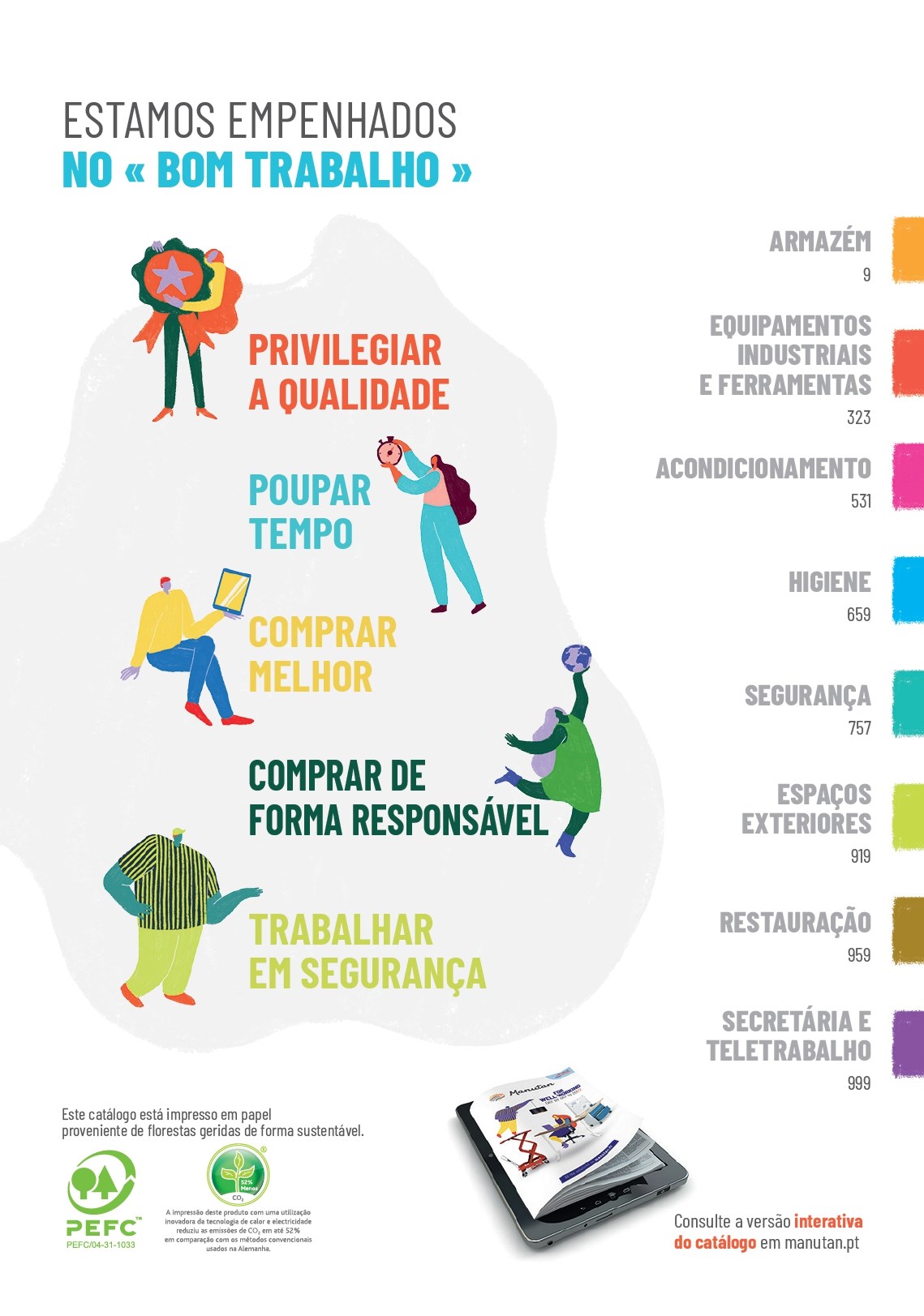 ESTAMOS EMPENHADOS NO « BOM TRABALHO » PRIVILEGIAR A QUALIDADE POUPAR TEMPO COMPRAR MELHOR COMPRAR DE FORMA RESPONSÁVEL TRABALHAR EM SEGURANÇA Este catálogo está impresso em papel proveniente de florestas geridas de forma sustentável. ARMAZÉM 9 EQUIPAMENTOS INDUSTRIAIS E FERRAMENTAS 323 ACONDICIONAMENTO 531 HIGIENE 659 SEGURANÇA 757 ESPAÇOS EXTERIORES 919 RESTAURAÇÃO 959 SECRETÁRIA E TELETRABALHO 999 Consulte a versão interativa do catálogo em manutan.pt