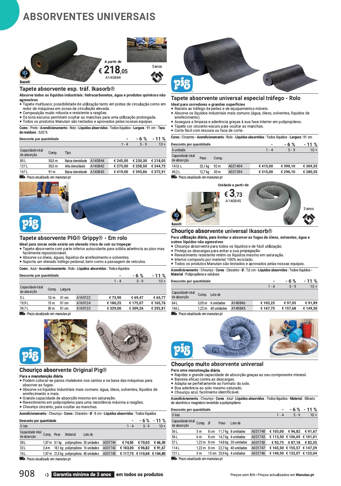 ABSORVENTES UNIVERSAIS Minialmofada absorvente universal Especialmente concebida para a indústria automóvel • Minialmofada par no seu automóvel em caso de pequenos derrames. • Protege as suas superfícies em trabalhos de repar • Gr garrafa de óleo para o motor. Acondicionamento : Almofada - Cores : Cinzento - Comp. : 15 cm - Largura : 15 cm - Tecnologia : Nenhum - Líquidos absorvidos : Todos líquidos Desconto por quantidade - - 6 % - 11 % 1 - 4 5 - 9 10 + A607499 € 1,05 € 0,99 € 0,93 Prazo atualizado em manutan.pt € 4 Unidade a partir de ,13 A140823 3 anos Almofada absorvente universal Ikasorb® Ideal par s de descargas ou fugas industriais • Almofada absorvente para todos os tipos de líquidos não químicos. • Forma flexível, ideal par de difícil acesso. • Absor ápida em locais restritos, por exemplo, por baixo de máquinas. • Todos os produtos Manutan são testados e aprovados pelas nossas equipas. Acondicionamento : Almofada - Cores : Cinzento - Material : Polipropileno e celulose - Taxa de resíduos : 0,02 % - Líquidos absorvidos : Todos líquidos Desconto por quantidade - - 6 % - 11 % 1 - 4 5 - 9 10 + Capacidade total de Comp. Largura Peso Lote de absor 35 L 25 cm 25 cm 5 kg 20 unidades 46 L 45 cm 45 cm 6 kg 10 unidades Prazo atualizado em manutan.pt A140823 A140824 € 92,75 € 82,50 € 87,18 € 77,55 € 82,55 € 73,42 Almofada absorvente universal - Capacidade total de absor Absor ápida de grandes quantidades de líquido • Invólucro de polipropileno. • Almofada absorvente universal concebida para resistir a rasgos. • Produtos incineráveis. SS Perigoso. Respeite as de Acondicionamento : Almofada - Cores : Cinzento - Material : Polipropileno - Taxa de resíduos : 4 % - Líquidos absorvidos : Todos líquidos - Capacidade total de absor : 76 L - Comp. : 25 cm - Largura : 25 cm - Altura : 5 cm - Peso : 10 kg Vendido em lotes de : 40 unidades Desconto por quantidade O lote A002244 Prazo atualizado em manutan.pt - 1 - 4 € 134,25 - 6 % 5 - 9 € 126,19 - 11 % 10 + € 119,48 Absorvente universal de alta visibilidade - Em rolo Ideal para zonas muito movimentadas onde existem riscos de escorregar, tr cair • Absorvente com mensagem de aviso para dupla segur • Permite camuflar ou limpar os líquidos e evita os riscos de escorregar. • As cores de alta visibilidade e o pictograma de segur incitam à vigilância. • Grande capacidade de absor de líquidos industriais não químicos. Acondicionamento : Rolo - Cores : Amarelo fluorescente - Largura : 81 cm - Tecnologia : SM - Líquidos absorvidos : Todos líquidos Desconto por quantidade - - 6 % - 11 % 1 - 4 5 - 9 10 + Comp. Cdeapaabcsiodrade total Peso 46 m 173 L 12,4 kg A140827 € 164,50 € 154,63 € 146,40 91 m 224 L 15 kg A140839 € 275,00 € 258,50 € 244,75 Prazo atualizado em manutan.pt Absorvente universal de alta visibilidade - Em folha Ideal para zonas muito movimentadas onde existem riscos de escorregar, tr cair • Absorvente com mensagem de aviso para dupla segur • Limpa os líquidos e evita os riscos de escorregar. • As cores de alta visibilidade e o pictograma de segur incitam à vigilância. • Grande capacidade de absor de líquidos industriais não químicos. Acondicionamento : Folha - Cores : Amarelo fluorescente - Comp. : 0,46 m - Largura : 41 cm - Tecnologia : SM - Líquidos absorvidos : Todos líquidos Desconto por quantidade - - 6 % - 11 % 1 - 4 5 - 9 10 + Cdeapaabcsiodrade total Peso Lote de 86 L 5,9 kg 100 unidades A140833 € 116,00 € 109,04 € 103,24 112 L 6,3 kg 200 unidades A140837 € 137,75 € 129,48 € 122,60 Prazo atualizado em manutan.pt 909