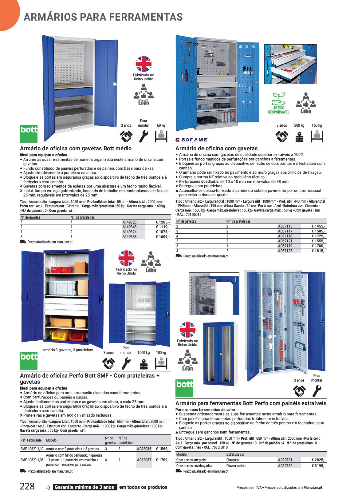 ARMÁRIOS PARA FERRAMENTAS Fabricado no Reino Unido Lean 3 anos Para montar 60 kg Lean 3 anos 500 kg 150 kg Armário de oficina com gavetas Bott médio Ideal para equipar a oficina • Arrume as suas ferramentas de maneira organizada neste armário de oficina com gavetas. • Fundo constituído de painéis perfurados e de painéis com base para caixas. • Ajuste simplesmente a prateleira na altura. • Bloqueie as portas em segur ao dispositivo de fecho de três pontos e à fechadura com canhão. • Gavetas com rolamentos de esferas por uma abertura e um fecho muito flexível. O anizado, bancada de trabalho em contraplacado de faia de 25 mm, reguláveis em intervalos de 25 mm. Tipo : Armário alto - Largura total : 1050 mm - Profundidade total : 55 cm - Altura total : 2000 mm - Porta cor : Azul - Estrutura cor : Cinzento - Carga máx./prateleira : 60 kg - Gaveta carga máx. : 60 kg - N.º de painéis : 2 - Com gaveta : sim Nº de gavetas N.º de prateleiras 3 1 2 1 1 2 6 1 Prazo atualizado em manutan.pt A149325 A149348 A149324 A149338 € 1205,- € 1119,- € 1075,- € 1609,- Armário de oficina com gavetas • Armário de oficina com gavetas de qualidade superior extraíveis a 100%. • Portas e fundo munidos de perfur erramentas. • Bloqueie as portas gr o de fecho de dois pontos e à fechadura com canhão. • O armário pode ser fixado no pavimento e ao muro gr orifícios de • Cumpre a norma NF relativa ao mobiliário técnico. • Perfur adas de 10 x 10 mm em intervalos de 38 mm. O Entregue com prateleiras. SS Aconselha-se colocá-lo fixado à parede ou sobre o pavimento por um profissional para evitar o risco de queda. Tipo : Armário alto - Largura total : 1000 mm - Largura útil : 1000 mm - Prof. útil : 440 mm - Altura total : 1945 mm - Altura útil : 195 cm - Altura Gaveta : 10 cm - Porta cor : Azul - Estrutura cor : Cinzento - Carga máx. : 500 kg - Carga máx./prateleira : 150 kg - Gaveta carga máx. : 50 kg - Com gaveta : sim - RAL : 7015|5015 Nº de gavetas N.º de prateleiras 2 2 3 2 4 2 2 2 3 1 4 2 Prazo atualizado em manutan.pt A067115 A067117 A067116 A067121 A067119 A067125 € 1455,- € 1585,- € 1725,- € 1555,- € 1700,- € 1815,- Fabricado no Reino Unido Lean armário 3 gavetas, 3 prateleiras 3 anos Para montar 1000 kg 100 kg Fabricado no Reino Unido Armário de oficina Perfo Bott SMF - Com prateleiras + gavetas Ideal para equipar a oficina • Armário de oficina para • Com perfur a das suas ferramentas. • Ajuste facilmente as prateleiras e as gavetas em altura, a cada 25 mm. • Bloqueie as portas em segur ao dispositivo de fecho de três pontos e à fechadura com canhão. O Prateleiras e gavetas em anizado incluídas. Tipo : Armário alto - Largura total : 1050 mm - Profundidade total : 650 mm - Altura total : 2000 mm - Porta cor : Azul - Estrutura cor : Cinzento - Carga máx. : 1000 kg - Carga máx./prateleira : 100 kg - Gaveta carga máx. : 75 kg - Com gaveta : sim Ref. Fabricante Modelo SMF-10620-1,10 Armário com 3 prateleiras + 3 gavetas Nº de N.º de gavetas prateleiras 3 3 A033036 € 1569,- Armário com fundo perfurado, 4 gavetas SMF-10620-1,36 + 1 painel + 1 prateleira em madeira + 4 2 painel com encaixes para caixas Prazo atualizado em manutan.pt A033037 € 1709,- Lean 3 anos Para montar Armário para ferramentas Bott Perfo com painéis extraíveis Para as suas ferramentas de valor • Suspenda ordenadamente as suas ferramentas neste armário para ferramentas. • Com painéis para ferramentas perfurados totalmente extraíveis. • Bloqueie as portas gr o de fecho de três pontos e à fechadura com canhão. SS Entregue sem ganchos nem ferramentas. Tipo : Armário alto - Largura útil : 1050 mm - Prof. útil : 650 mm - Altura útil : 2000 mm - Porta cor : Azul - Carga máx. por painel : 150 kg - Nº de gavetas : 0 - N.º de painéis : 4 - N.º de prateleiras : 0 - Com gaveta : não - RAL : 7035|5010 Modelo Estrutura cor Com portas integrais Cinzento Com portas envidr Cinzento claro Prazo atualizado em manutan.pt A032781 A032782 € 2825,- € 3195,- 228