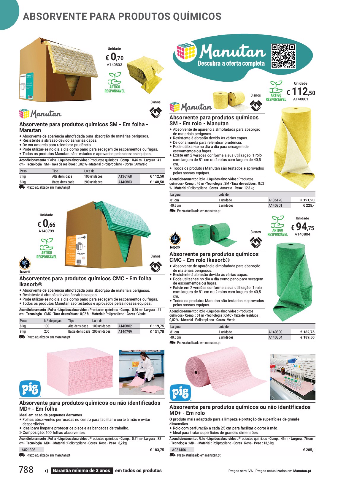 ABSORVENTE PARA PRODUTOS QUÍMICOS € 0 Unidade ,70 A140803 Descubra a oferta completa 3 anos 3 anos 112 Unidade € ,50 A140801 Absorvente para produtos químicos SM - Em folha - Manutan • Absorvente de aparência almofadada para absor • Resistente à abrasão devido às várias capas. • De cor amarela para relembrar prudência. • Pode utilizar-se no dia a dia como pano para secagem de escoamentos ou fugas. • Todos os produtos Manutan são testados e aprovados pelas nossas equipas. Acondicionamento : Folha - Líquidos absorvidos : Productos químicos - Comp. : 0,46 m - Largura : 41 cm - Tecnologia : SM - Taxa de resíduos : 0,02 % - Material : Polipropileno - Cores : Amarelo Peso Tipo 7 kg Alta densidade 8 kg Baixa densidade Prazo atualizado em manutan.pt Lote de 100 unidades 200 unidades A136168 A140803 € 112,50 € 140,50 € 0 Unidade ,66 A140799 Absorvente para produtos químicos SM - Em rolo - Manutan • Absorvente de aparência almofadada para absor de materiais perigosos. • Resistente à abrasão devido às várias capas. • De cor amarela para relembrar prudência. • Pode utilizar-se no dia a dia para secagem de escoamentos ou fugas. • Existe em 2 v rolo com largura de 81 cm ou 2 rolos com largura de 40,5 cm. • Todos os produtos Manutan são testados e aprovados pelas nossas equipas. Acondicionamento : Rolo - Líquidos absorvidos : Productos químicos - Comp. : 46 m - Tecnologia : SM - Taxa de resíduos : 0,02 % - Material : Polipropileno - Cores : Amarelo - Peso : 12,3 kg Largura Lote de 81 cm 1 unidade 40,5 cm 2 unidades Prazo atualizado em manutan.pt A136170 A140801 3 anos € 191,90 € 225,- 94 Unidade € ,75 A140804 3 anos Absorventes para produtos químicos CMC - Em folha Ikasorb® • Absorvente de aparência almofadada para absor • Resistente à abrasão devido às várias capas. • Pode utilizar-se no dia a dia como pano para secagem de escoamentos ou fugas. • Todos os produtos Manutan são testados e aprovados pelas nossas equipas. Acondicionamento : Folha - Líquidos absorvidos : Productos químicos - Comp. : 0,46 m - Largura : 41 cm - Tecnologia : CMC - Taxa de resíduos : 0,02 % - Material : Polipropileno - Cores : Verde Peso N.º Tipo 8 kg 100 Alta densidade 9 kg 200 Baixa densidade Prazo atualizado em manutan.pt Lote de 100 unidades 200 unidades A140802 A140799 € 119,75 € 131,75 Absorvente para produtos químicos CMC - Em rolo Ikasorb® • Absorvente de aparência almofadada para absor de materiais perigosos. • Resistente à abrasão devido às várias capas. • Pode utilizar-se no dia a dia como pano para secagem de escoamentos ou fugas. • Existe em 2 v rolo com largura de 81 cm ou 2 rolos com largura de 40,5 cm. • Todos os produtos Manutan são testados e aprovados pelas nossas equipas. Acondicionamento : Rolo - Líquidos absorvidos : Productos químicos - Comp. : 61 m - Tecnologia : CMC - Taxa de resíduos : 0,02 % - Material : Polipropileno - Cores : Verde Largura Lote de 81 cm 1 unidade 40,5 cm 2 unidades Prazo atualizado em manutan.pt A140800 A140804 € 182,75 € 189,50 Absorvente para produtos químicos ou não identificados MD+ - Em folha Ideal em caso de pequenos derrames • Folhas absorventes perfuradas no centro para facilitar o corte à mão e evitar desperdícios. • Ideal para limpar e proteger os pisos e as bancadas de trabalho. O 00 folhas absorventes. Acondicionamento : Folha - Líquidos absorvidos : Productos químicos - Comp. : 0,51 m - Largura : 38 cm - Tecnologia : MD+ - Material : Polipropileno - Cores : Rosa - Peso : 8,2 kg A021398 Prazo atualizado em manutan.pt € 183,75 Absorvente para produtos químicos ou não identificados MD+ - Em rolo O produto mais adaptado para a limpeza e pr superfícies de grande dimensões • Rolo com perfur a cada 25 cm para facilitar o corte à mão. • Ideal para tratar superfícies de grandes dimensões. Acondicionamento : Rolo - Líquidos absorvidos : Productos químicos - Comp. : 46 m - Largura : 76 cm - Tecnologia : MD+ - Material : Polipropileno - Cores : Rosa - Peso : 13,6 kg A021406 Prazo atualizado em manutan.pt € 285,- 788