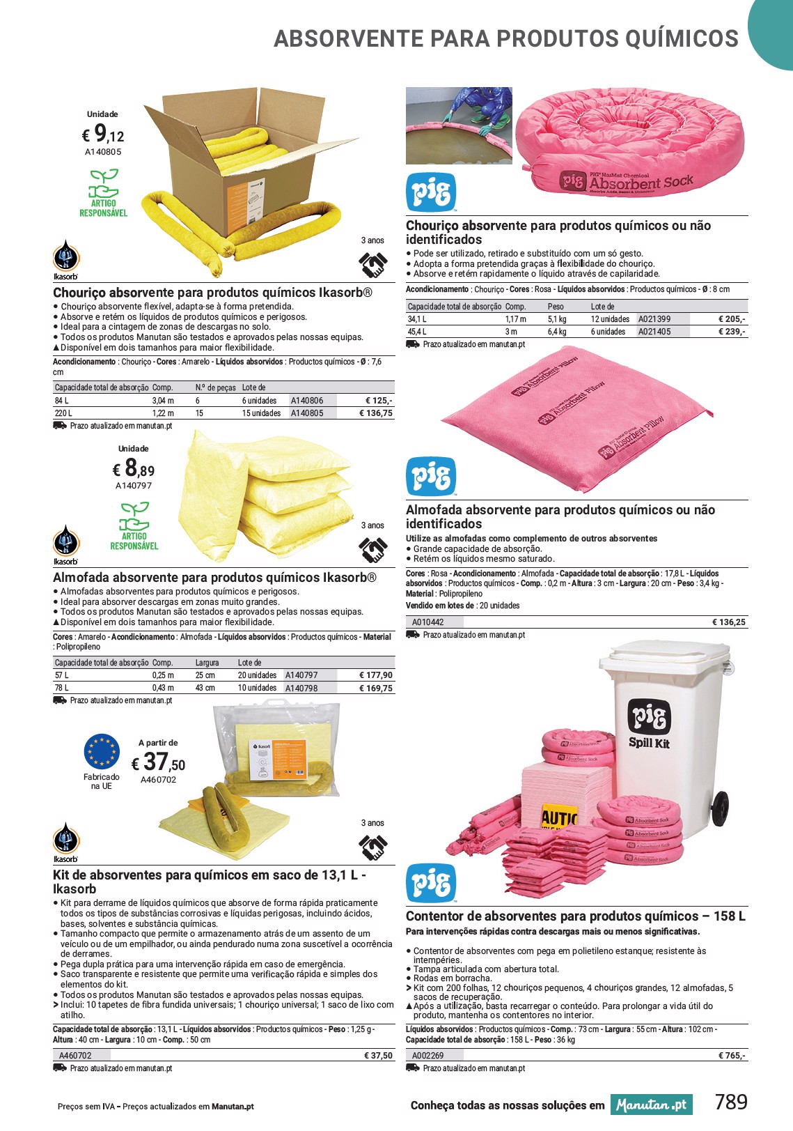 € 9 Unidade ,12 A140805 ABSORVENTE PARA PRODUTOS QUÍMICOS 3 anos vente para produtos químicos Ikasorb® • absorvente flexível, adapta-se à forma pretendida. • Absorve e retém os líquidos de produtos químicos e perigosos. • Ideal para a cintagem de zonas de descargas no solo. • Todos os produtos Manutan são testados e aprovados pelas nossas equipas. SS Disponível em dois tamanhos para maior flexibilidade. Acondicionamento cm - Cores : Amarelo - Líquidos absorvidos : Productos químicos - Ø : 7,6 Capacidade total de absor Comp. N.º 84 L 3,04 m 6 220 L 1,22 m 15 Prazo atualizado em Lote de 6 unidades 15 unidades A140806 A140805 € 125,- € 136,75 € 8 Unidade ,89 A140797 3 anos Almofada absorvente para produtos químicos Ikasorb® • Almofadas absorventes para produtos químicos e perigosos. • Ideal para absorver descargas em zonas muito grandes. • Todos os produtos Manutan são testados e aprovados pelas nossas equipas. SS Disponível em dois tamanhos para maior flexibilidade. Cores : Amarelo - Acondicionamento : Almofada - Líquidos absorvidos : Productos químicos - Material : Polipropileno Capacidade total de absor Comp. 57 L 0,25 m 78 L 0,43 m Prazo atualizado em manutan.pt Largura 25 cm 43 cm Lote de 20 unidades 10 unidades A140797 A140798 € 177,90 € 169,75 vente para produtos químicos ou não identificados • Pode ser utilizado, retirado e substituído com um só gesto. • Adopta a forma pretendida gr à • Absorve e retém rapidamente o líquido através de capilaridade. Acondicionamento - Cores : Rosa - Líquidos absorvidos : Productos químicos - Ø : 8 cm Capacidade total de absor Comp. 34,1 L 1,17 m 45,4 L 3 m Prazo atualizado em manutan.pt Peso 5,1 kg 6,4 kg Lote de 12 unidades 6 unidades A021399 A021405 € 205,- € 239,- Almofada absorvente para produtos químicos ou não identificados Utilize as almofadas como complemento de outros absorventes • Grande capacidade de absor • Retém os líquidos mesmo saturado. Cores : Rosa - Acondicionamento : Almofada - Capacidade total de absor : 17,8 L - Líquidos absorvidos : Productos químicos - Comp. : 0,2 m - Altura : 3 cm - Largura : 20 cm - Peso : 3,4 kg - Material : Polipropileno Vendido em lotes de : 20 unidades A010442 Prazo atualizado em manutan.pt € 136,25 Fabricado na UE € 37 A partir de ,50 A460702 3 anos Kit de absorventes para químicos em saco de 13,1 L - Ikasorb • Kit para derrame de líquidos químicos que absorve de forma rápida praticamente todos os tipos de substâncias corrosivas e líquidas perigosas, incluindo ácidos, bases, solventes e substância químicas. • Tamanho compacto que permite o armazenamento atrás de um assento de um veículo ou de um empilhador, ou ainda pendurado numa zona suscetível a ocorrência de derrames. • Pega dupla prática para uma interv rápida em caso de emergência. • Saco transparente e resistente que permite uma v rápida e simples dos elementos do kit. • Todos os produtos Manutan são testados e aprovados pelas nossas equipas. O Inclui: 10 tapetes de fibra fundida universais; 1 ersal; 1 saco de lixo com atilho. Capacidade total de absor : 13,1 L - Líquidos absorvidos : Productos químicos - Peso : 1,25 g - Altura : 40 cm - Largura : 10 cm - Comp. : 50 cm A460702 Prazo atualizado em manutan.pt € 37,50 Contentor de absorventes para produtos químicos – 158 L Para interve s rápidas contra descargas mais ou menos significativas. • Contentor de absorventes com pega em polietileno estanque; resistente às intempéries. • Tampa articulada com abertura total. • Rodas em borracha. O Kit com 200 folhas, 12 pequenos, 4 andes, 12 almofadas, 5 sacos de recuper SS Após a basta recarregar o conteúdo. Para prolongar a vida útil do produto, mantenha os contentores no interior. Líquidos absorvidos : Productos químicos - Comp. : 73 cm - Largura : 55 cm - Altura : 102 cm - Capacidade total de absor : 158 L - Peso : 36 kg A002269 Prazo atualizado em manutan.pt € 765,- 789