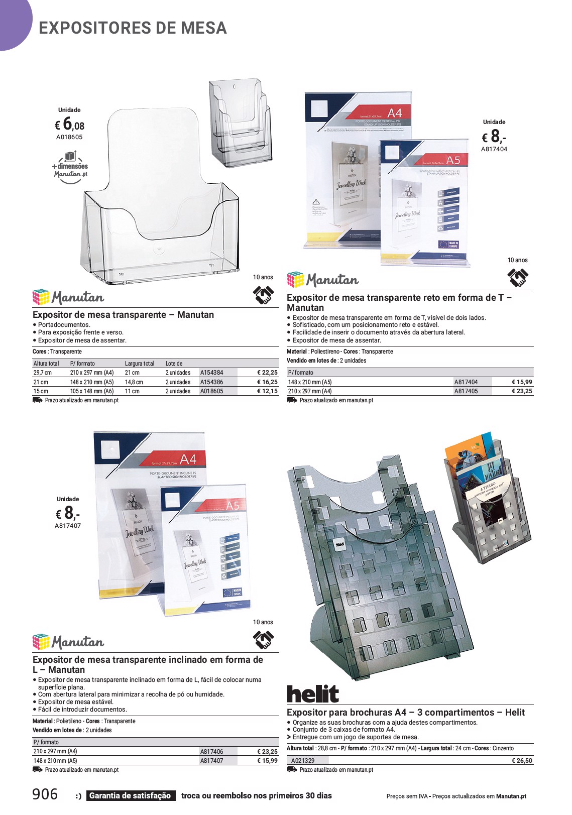 EXPOSITORES DE MESA Unidade 6 € ,08 A018605 Unidade 8 € ,- A817404 Expositor de mesa transparente – Manutan • Portadocumentos. • Par ente e verso. • Expositor de mesa de assentar. Cores : Transparente Altura total P/ formato 29,7 cm 210 x 297 mm (A4) 21 cm 148 x 210 mm (A5) 15 cm 105 x 148 mm (A6) Prazo atualizado em manutan.pt Largura total 21 cm 14,8 cm 11 cm Lote de 2 unidades 2 unidades 2 unidades A154384 A154386 A018605 10 anos 10 anos € 22,25 € 16,25 € 12,15 Expositor de mesa transparente reto em forma de T – Manutan • Expositor de mesa transparente em forma de T, visível de dois lados. • Sofisticado, com um posicionamento reto e estável. • Facilidade de inserir o documento através da abertura lateral. • Expositor de mesa de assentar. Material : Poliestireno - Cores : Transparente Vendido em lotes de : 2 unidades P/ formato 148 x 210 mm (A5) 210 x 297 mm (A4) Prazo atualizado em manutan.pt A817404 A817405 € 15,99 € 23,25 Unidade 8 € ,- A817407 10 anos Expositor de mesa transparente inclinado em forma de L – Manutan • Expositor de mesa transparente inclinado em forma de L, fácil de colocar numa superfície plana. • Com abertura lateral para minimizar a recolha de pó ou humidade. • Expositor de mesa estável. • Fácil de introduzir documentos. Material : Polietileno - Cores : Transparente Vendido em lotes de : 2 unidades P/ formato 210 x 297 mm (A4) 148 x 210 mm (A5) Prazo atualizado em manutan.pt A817406 A817407 € 23,25 € 15,99 Expositor para brochuras A4 – 3 compartimentos – Helit • Organize as suas brochuras com a ajuda destes compartimentos. • Conjunto de 3 caixas de formato A4. O Entregue com um jogo de suportes de mesa. Altura total : 28,8 cm - P/ formato : 210 x 297 mm (A4) - Largura total : 24 cm - Cores : Cinzento A021329 Prazo atualizado em manutan.pt € 26,50 906