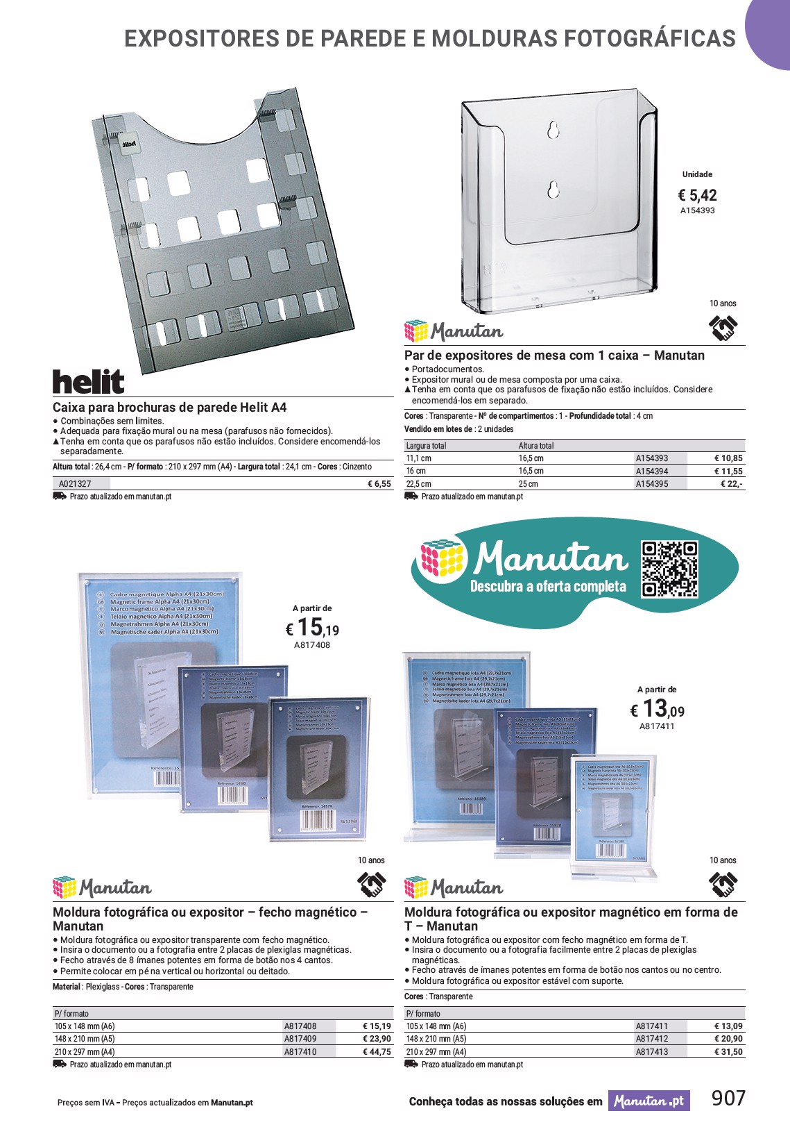 EXPOSITORES DE PAREDE E MOLDURAS FOTOGRÁFICAS Unidade € 5,42 A154393 10 anos Caixa para brochuras de parede Helit A4 • • Adequada para mural ou na mesa (parafusos não fornecidos). SS Tenha em conta que os parafusos não estão incluídos. Considere encomendá-los separadamente. Altura total : 26,4 cm - P/ formato : 210 x 297 mm (A4) - Largura total : 24,1 cm - Cores : Cinzento A021327 Prazo atualizado em manutan.pt € 6,55 Par de expositores de mesa com 1 caixa – Manutan • Portadocumentos. • Expositor mural ou de mesa composta por uma caixa. SS Tenha em conta que os parafusos de não estão incluídos. Considere encomendá-los em separado. Cores : Transparente - Nº de compartimentos : 1 - Profundidade total : 4 cm Vendido em lotes de : 2 unidades Largura total Altura total 11,1 cm 16,5 cm 16 cm 16,5 cm 22,5 cm 25 cm Prazo atualizado em manutan.pt A154393 A154394 A154395 € 10,85 € 11,55 € 22,- A partir de 15 € ,19 A817408 Descubra a oferta completa A partir de 13 € ,09 A817411 10 anos 10 anos Moldura fotográfica ou expositor – fecho magnético – Manutan • Moldura fotográfica ou expositor transparente com fecho magnético. • Insira o documento ou a fotografia entre 2 placas de plexiglas magnéticas. • Fecho através de 8 ímanes potentes em forma de botão nos 4 cantos. • Permite colocar em pé na vertical ou horizontal ou deitado. Material : Plexiglass - Cores : Transparente P/ formato 105 x 148 mm (A6) 148 x 210 mm (A5) 210 x 297 mm (A4) Prazo atualizado em manutan.pt A817408 A817409 A817410 € 15,19 € 23,90 € 44,75 Moldura fotográfica ou expositor magnético em forma de T – Manutan • Moldura fotográfica ou expositor com fecho magnético em forma de T. • Insira o documento ou a fotografia facilmente entre 2 placas de plexiglas magnéticas. • Fecho através de ímanes potentes em forma de botão nos cantos ou no centro. • Moldura fotográfica ou expositor estável com suporte. Cores : Transparente P/ formato 105 x 148 mm (A6) 148 x 210 mm (A5) 210 x 297 mm (A4) Prazo atualizado em manutan.pt A817411 A817412 A817413 € 13,09 € 20,90 € 31,50 907