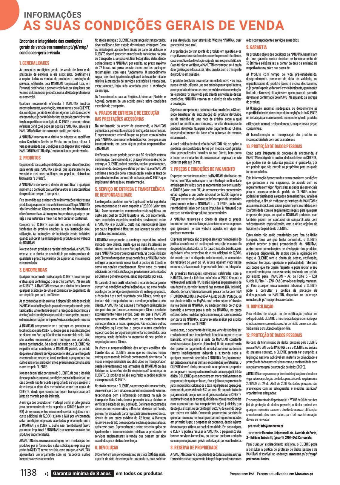 INFORMA ES AS SUAS Encontre a integridade das condições gerais de venda em manutan.pt/pt/map/ condicoes-gerais-venda 1. GENERALIDADES As presentes condições gerais de venda de bens e de prestação de serviços a ela associados, destinam-se a regular todas as vendas de produtos e prestação de serviços, efetuadas pela MANUTAN, Unipessoal, Lda., em Portugal, destinadas a pessoas coletivas ou singulares que visem a utilização dos produtos numa atividade profissional ou comercial. Qualquer encomenda efetuada à MANUTAN implica, necessariamente, a aceitação, sem reservas, pelo CLIENTE, das condições gerais de venda em vigor na data da respetiva encomenda, cujo conteúdo declara ter prévio conhecimento. Nenhum pedido ou condição do CLIENTE que contrarie as referidas condições pode ser oposta à MANUTAN, salvo se a MANUTAN o/a tiver formalmente aceite por escrito. A MANUTAN reserva-se o direito de adaptar ou modificar estas Condições Gerais de Venda em qualquer altura. A versão atualizada das Condições está disponível no website MANUTAN (MANUTAN.pt/pt/map/condicoes-gerais-venda). 2. PRODUTOS Dependendo da sua disponibilidade, os produtos oferecidos para venda pela MANUTAN são os que aparecem no seu website e nos seus catálogos em papel ou eletrónicos (doravante “a Oferta”). A MANUTAN reserva-se o direito de modificar a qualquer momento o conteúdo da sua Oferta e/ou as características dos produtos de que é composta. Fica entendido que as descrições e informações relativas aos produtos que aparecem no website e nos catálogos MANUTAN são fornecidas ao Cliente apenas para fins informativos e não são exaustivas. As imagens dos produtos, qualquer que seja a sua natureza e meio, não têm carácter contratual. Compete ao CLIENTE cumprir as recomendações do fabricante do produto relativas à sua instalação e/ou utilização. As instruções de instalação estão incluídas, quando aplicável, na embalagem do produto ou no website da MANUTAN. No caso de um produto se revelar indisponível, a MANUTAN reserva-se o direito de o substituir por outro produto de qualidade e preço equivalente ou superior ao inicialmente encomendado. 3. ENCOMENDAS Qualquer encomenda realizada pelo CLIENTE só se tem por efetiva após confirmação por escrito da MANUTAN enviada ao CLIENTE. A MANUTAN reserva-se o direito de submeter qualquer aceitação de uma encomenda ao pagamento de um depósito por parte do Cliente. As encomendas estão sujeitas à disponibilidade do stock da MANUTAN ou à indicação do prazo de entrega fornecido pelos fabricantes. Este entende-se com a receção da encomenda, a aceitação das condições apresentadas na respetiva proposta e demais informações indispensáveis à aceitação da mesma. A MANUTAN compromete-se a entregar os produtos no local indicado pelo CLIENTE, desde que as suas instalações se situem em Portugal Continental e ao nível do solo. Não são aceites encomendas para entregas em apartados, nem à consignação. Se o local indicado pelo CLIENTE não respeitar estas condições, a MANUTAN poderá, a pedido daquele e a titulo de serviço acessório, efetuar a entrega da encomenda no respetivo local, mediante o pagamento dos custos adicionais daí decorrentes, previamente comunicados e aceites pelo CLIENTE. No caso de omissão por parte do CLIENTE, de que o local de descarga não cumpre as condições supra indicadas, ou no caso de este não ter aceite a proposta do serviço acessório de entrega, o risco das mercadorias corre por conta do CLIENTE, desde que as mesmas sejam transportadas até junto da morada por ele indicada. A entrega dos produtos em Portugal continental é gratuita para encomendas de valor superior a 120,00€ (valor sem IVA). As remanescentes encomendas estão sujeitas a um custo adicional de 12,00€ (sujeito a IVA), por encomenda, salvo condições especiais acordadas previamente entre a MANUTAN e o CLIENTE, custo não reembolsável (salvo por causa imputável à MANUTAN) que acresce ao valor dos produtos encomendados. A MANUTAN não assume a montagem, nem a instalação dos produtos por si fornecidos, salvo solicitação expressa por parte do CLIENTE nesse sentido, caso em que, a MANUTAN apresentará um orçamento com os respetivos custos inerentes a essas operações. ES GERAIS DE VENDA No ato da entrega, o CLIENTE, na presença do transportador, deve verificar o bom estado dos volumes entregues. Caso as embalagens apresentem sinais de dano ou violação, o CLIENTE deverá proceder ao registo de tais factos na guia de transporte, e, se possível, tirar fotografias, deles dando conhecimento à MANUTAN, por escrito, no prazo máximo de 72 horas, sob pena de não serem aceites quaisquer reclamações, com esse fundamento. O procedimento supra referido é igualmente aplicável à desconformidade relativa à prestação de serviços acessórios à venda que, eventualmente, haja sido acordada para a efetivação da entrega. Os fornecimentos para as Regiões Autónomas (Madeira e Açores), carecem de um acordo prévio sobre condições especiais de transporte . 4. PRAZOS DE ENTREGA E DE EXECUÇÃO DAS PRESTAÇÕES ACESSÓRIAS N a confirmação da ordem de encomenda, a MANUTAN comunicará, por escrito, o prazo de entrega das encomendas. É expressamente entendido que os prazos comunicados pela MANUTAN, são meramente indicativos, pelo que, o seu incumprimento, em caso algum poderá responsabilizar a MANUTAN. Verificando-se um período superior a 30 dias úteis entre a confirmação da encomenda e o prazo previsto ou efetivo de entrega, o CLIENTE poderá cancelar, total ou parcialmente, a encomenda, desde que o efetue por escrito, e a MANUTAN confirme a receção de tal comunicação, e não se trate de produtos fornecidos por medida indicada pelo CLIENTE, que impliquem fabricação ou transformação. 5. SERVIÇO DE ENTREGA E TRANSFERÊNCIA DE RESPONSABILIDADE A entrega dos produtos em Portugal continental é gratu