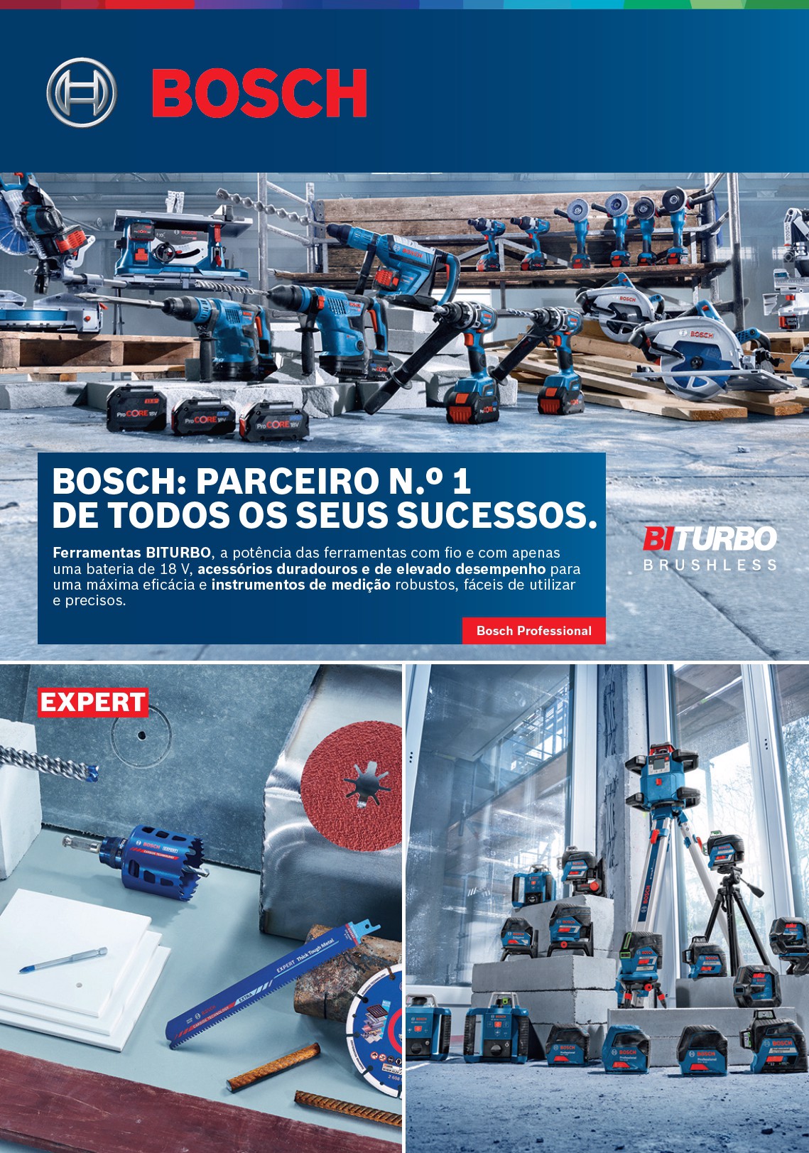 BOSCH: PARCEIRO N.º 1 DE TODOS OS SEUS SUCESSOS. Ferramentas BITURBO , a potência das ferramentas com fio e com apenas uma bateria de 18 V, acessórios duradouros e de elevado desempenho para uma máxima eficácia e instrumentos de medição robustos, fáceis de utilizar e precisos. Bosch Professional