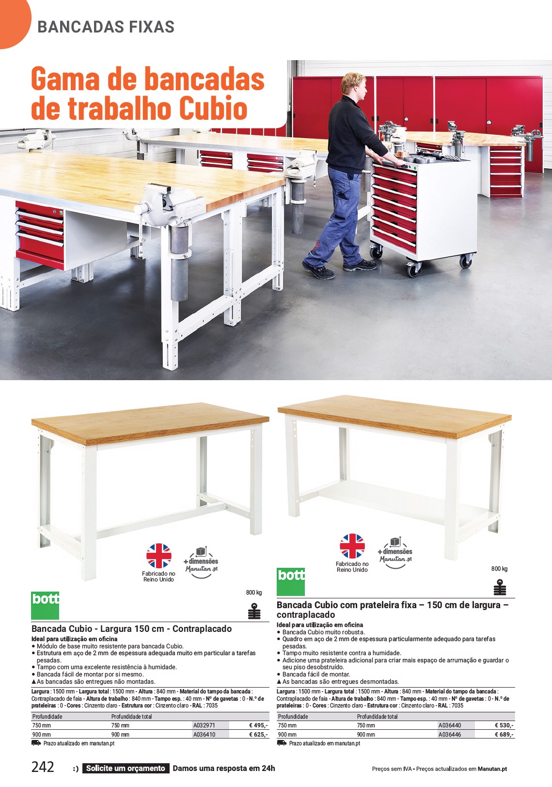 BANCADAS FIXAS Gama de bancadas de trabalho Cubio Fabricado no Reino Unido 800 kg Bancada Cubio - Largura 150 cm - Contraplacado Ideal par • Módulo de base muito resistente para bancada Cubio. • Estrutura em de 2 mm de espessura adequada muito em particular a tarefas pesadas. • Tampo com uma excelente resistência à humidade. • Bancada fácil de montar por si mesmo. SS As bancadas são entregues não montadas. Largura : 1500 mm - Largura total : 1500 mm - Altura : 840 mm - Material do tampo da bancada : Contraplacado de faia - Altura de trabalho : 840 mm - Tampo esp. : 40 mm - Nº de gavetas : 0 - N.º de prateleiras : 0 - Cores : Cinzento claro - Estrutura cor : Cinzento claro - RAL : 7035 Profundidade Profundidade total 750 mm 750 mm 900 mm 900 mm Prazo atualizado em manutan.pt A032971 A036410 € 495,- € 625,- Fabricado no Reino Unido 800 kg Bancada Cubio com prateleira fixa – 150 cm de largura – contraplacado Ideal par • Bancada Cubio muito robusta. • Quadr mm de espessura particularmente adequado para tarefas pesadas. • Tampo muito resistente contra a humidade. • Adicione uma prateleira adicional par dar o seu piso desobstruído. • Bancada fácil de montar. SS As bancadas são entregues desmontadas. Largura : 1500 mm - Largura total : 1500 mm - Altura : 840 mm - Material do tampo da bancada : Contraplacado de faia - Altura de trabalho : 840 mm - Tampo esp. : 40 mm - Nº de gavetas : 0 - N.º de prateleiras : 0 - Cores : Cinzento claro - Estrutura cor : Cinzento claro - RAL : 7035 Profundidade Profundidade total 750 mm 750 mm 900 mm 900 mm Prazo atualizado em manutan.pt A036440 A036446 € 530,- € 689,- 242