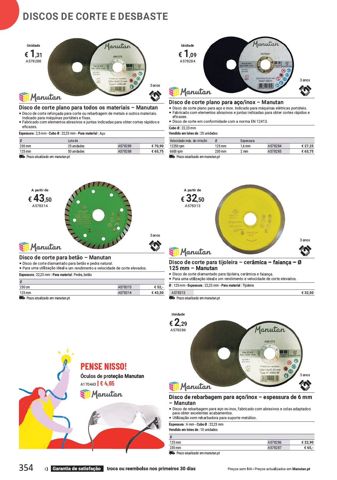DISCOS DE CORTE E DESBASTE € 1 Unidade ,31 A578288 € 1 Unidade ,09 A578284 3 anos 3 anos Disco de corte plano para todos os materiais – Manutan • Disco de corte refor para corte ou rebarbagem de metais e outros materiais. Indicado para máquinas portáteis e fixas. • Fabricado com elementos abrasivos e juntas indicadas para obter cortes rápidos e eficazes. Espessura : 2,5 mm - Cubo Ø : 22,23 mm - Para material Ø Lote de 230 mm 25 unidades 125 mm 50 unidades Prazo atualizado em manutan.pt A578289 A578288 € 70,90 € 65,75 Disco de corte plano par inox – Manutan • Disco de corte plano par e inox. Indicado para máquinas elétricas portáteis. • Fabricado com elementos abrasivos e juntas indicadas para obter cortes rápidos e eficazes. • Disco de corte em conformidade com a norma EN 12413. Cubo Ø : 22,23 mm Vendido em lotes de : 25 unidades Velocidade máx. de r Ø 12250 rpm 125 mm 6600 rpm 230 mm Prazo atualizado em manutan.pt Espessura 1,6 mm 2 mm A578284 A578285 € 27,25 € 63,75 € 43 A partir de ,50 A578314 € 32 A partir de ,50 A578313 3 anos 3 anos Disco de corte para betão – Manutan • Disco de corte diamantado para betão e pedra natural. • Par e um rendimento e velocidade de corte elevados. Espessura : 22,23 mm - Para material : Pedra, betão Ø 230 cm 125 mm Prazo atualizado em manutan.pt A578315 A578314 € 52,- € 43,50 Disco de corte para tijoleira – cer 125 mm – Manutan • Disco de corte diamantado para tijoleira, cerâmica e • Par e um rendimento e velocidade de corte elevados. Ø : 125 mm - Espessura : 22,23 mm - Para material : Tijoleira A578313 Prazo atualizado em manutan.pt € 32,50 € 2 Unidade ,29 A578286 354 PENSE NISSO! Óculos de pr A170443 | € 4,65 3 anos Disco de rebarbagem par – Manutan inox – espessura de 6 mm • Disco de rebarbagem par inox, fabricado com abrasivos e colas adaptados para obter excelentes acabamentos. • ebarbadora para suporte metálico. Espessura : 6 mm - Cubo Ø : 22,23 mm Vendido em lotes de : 10 unidades Ø 125 mm 230 mm Prazo atualizado em manutan.pt A578286 A578287 € 22,90 € 65,-
