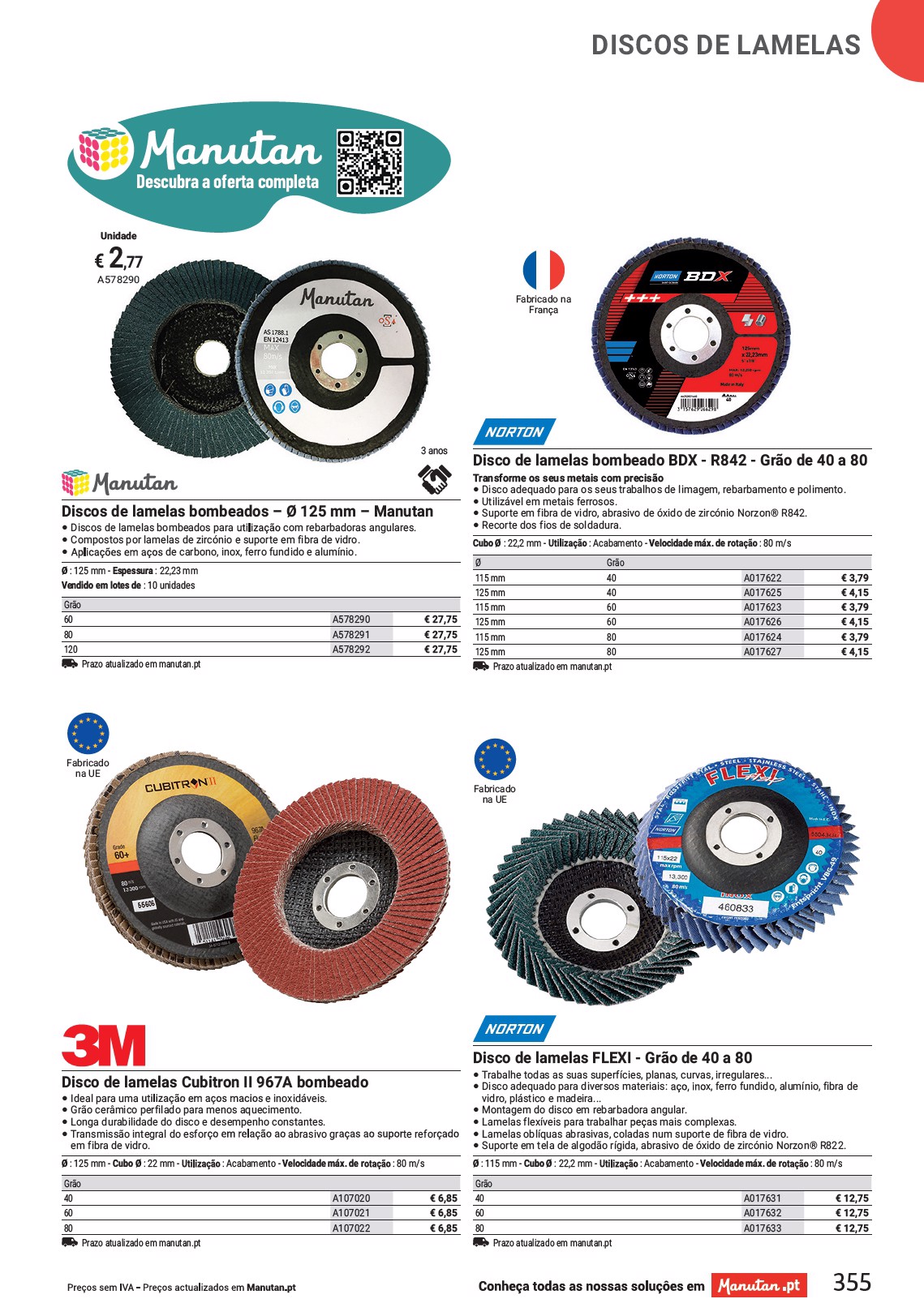 Descubra a oferta completa € 2 Unidade ,77 A578290 DISCOS DE LAMELAS Fabricado na Fr 3 anos Discos de lamelas bombeados – Ø 125 mm – Manutan • Discos de lamelas bombeados para com rebarbadoras angulares. • Compostos por lamelas de zircónio e suporte em fibra de vidro. • de carbono, inox, ferro fundido e alumínio. Ø : 125 mm - Espessura : 22,23 mm Vendido em lotes de : 10 unidades Grão 60 80 120 Prazo atualizado em manutan.pt A578290 A578291 A578292 € 27,75 € 27,75 € 27,75 Disco de lamelas bombeado BDX - R842 - Grão de 40 a 80 Transforme os seus metais com precisão • Disco adequado para os seus trabalhos de limagem, rebarbamento e polimento. • Utilizável em metais ferrosos. • Suporte em fibra de vidro, abrasivo de óxido de zircónio Norzon® R842. • Recorte dos fios de soldadura. Cubo Ø : 22,2 mm - : Acabamento - Velocidade máx. de r : 80 m/s Ø Grão 115 mm 40 125 mm 40 115 mm 60 125 mm 60 115 mm 80 125 mm 80 Prazo atualizado em manutan.pt A017622 A017625 A017623 A017626 A017624 A017627 € 3,79 € 4,15 € 3,79 € 4,15 € 3,79 € 4,15 Fabricado na UE Fabricado na UE Disco de lamelas Cubitron II 967A bombeado • Ideal para uma e inoxidáveis. • Grão cerâmico perfilado para menos aquecimento. • Longa durabilidade do disco e desempenho constantes. • Transmissão integral do esfor abrasivo gr em fibra de vidro. Ø : 125 mm - Cubo Ø : 22 mm - : Acabamento - Velocidade máx. de r Grão 40 60 80 Prazo atualizado em manutan.pt A107020 A107021 A107022 te refor : 80 m/s € 6,85 € 6,85 € 6,85 Disco de lamelas FLEXI - Grão de 40 a 80 • Trabalhe todas as suas superfícies, planas, curvas, irregulares. • Disco adequado para diversos materiais: x, ferro fundido, alumínio, fibra de vidro, plástico e madeira. • Montagem do disco em rebarbadora angular. • Lamelas flexíveis para trabalhar mais complexas. • Lamelas oblíquas abrasivas, coladas num suporte de fibra de vidro. • Suporte em tela de algodão rígida, abrasivo de óxido de zircónio Norzon® R822. Ø : 115 mm - Cubo Ø : 22,2 mm - : Acabamento - Velocidade máx. de r : 80 m/s Grão 40 60 80 Prazo atualizado em manutan.pt A017631 A017632 A017633 € 12,75 € 12,75 € 12,75 355
