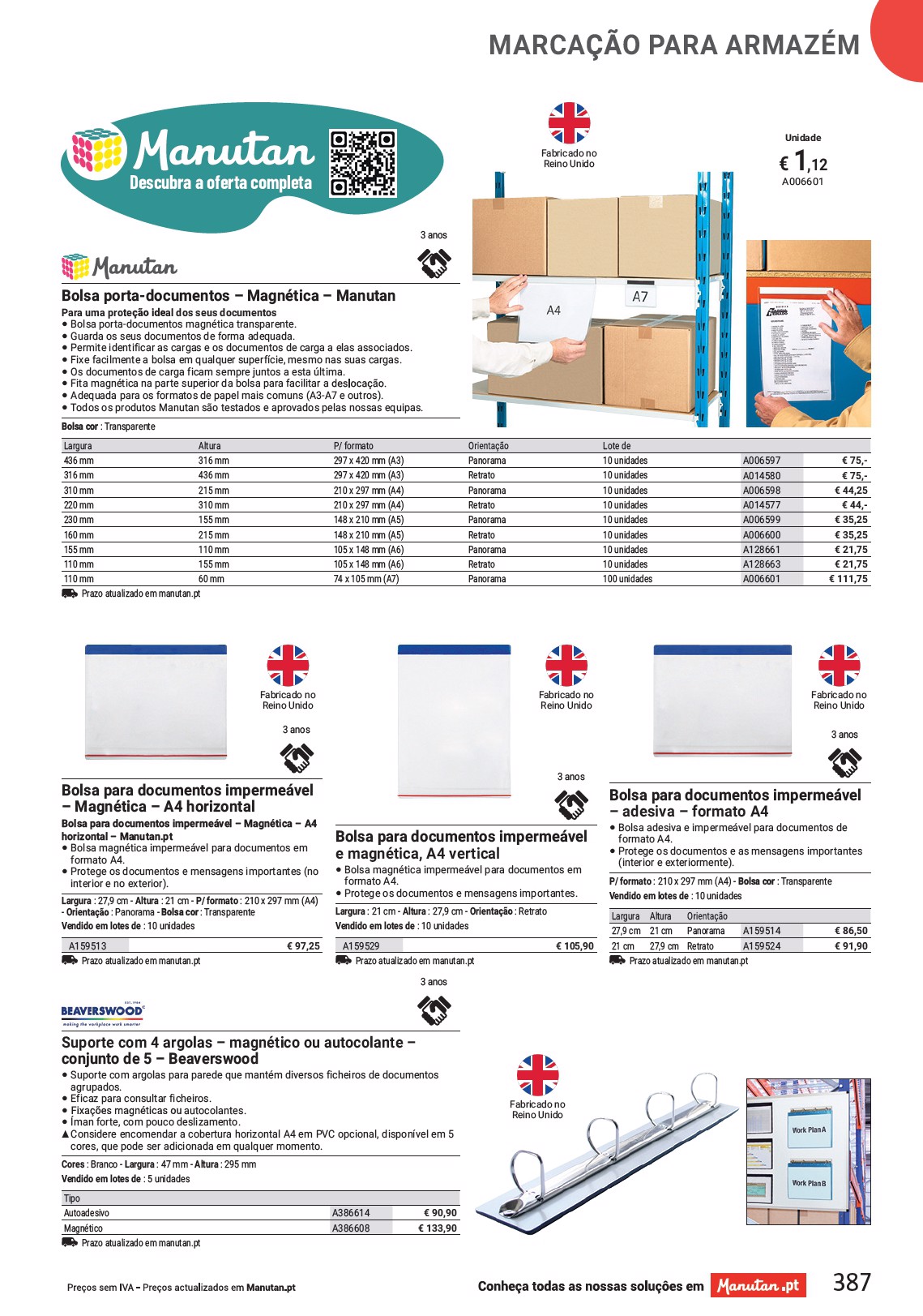 MARCA O PARA ARMAZÉM Descubra a oferta completa 3 anos Fabricado no Reino Unido Bolsa porta-documentos – Magnética – Manutan Para uma prote al dos seus documentos • Bolsa porta-documentos magnética transparente. • Guarda os seus documentos de forma adequada. • Permite identificar as cargas e os documentos de carga a elas associados. • Fixe facilmente a bolsa em qualquer superfície, mesmo nas suas cargas. • Os documentos de carga ficam sempre juntos a esta última. • Fita magnética na parte superior da bolsa para facilitar a • Adequada para os formatos de papel mais comuns (A3-A7 e outros). • Todos os produtos Manutan são testados e aprovados pelas nossas equipas. Bolsa cor : Transparente Largura Altura 436 mm 316 mm 316 mm 436 mm 310 mm 215 mm 220 mm 310 mm 230 mm 155 mm 160 mm 215 mm 155 mm 110 mm 110 mm 155 mm 110 mm 60 mm Prazo atualizado em manutan.pt P/ formato 297 x 420 mm (A3) 297 x 420 mm (A3) 210 x 297 mm (A4) 210 x 297 mm (A4) 148 x 210 mm (A5) 148 x 210 mm (A5) 105 x 148 mm (A6) 105 x 148 mm (A6) 74 x 105 mm (A7) O Panorama Retrato Panorama Retrato Panorama Retrato Panorama Retrato Panorama Lote de 10 unidades 10 unidades 10 unidades 10 unidades 10 unidades 10 unidades 10 unidades 10 unidades 100 unidades € 1 Unidade ,12 A006601 A006597 A014580 A006598 A014577 A006599 A006600 A128661 A128663 A006601 € 75,- € 75,- € 44,25 € 44,- € 35,25 € 35,25 € 21,75 € 21,75 € 111,75 Fabricado no Reino Unido 3 anos Fabricado no Reino Unido Fabricado no Reino Unido 3 anos Bolsa para documentos impermeável – Magnética – A4 horizontal Bolsa para documentos impermeável – Magnética – A4 horizontal – Manutan.pt • Bolsa magnética impermeável para documentos em formato A4. • Protege os documentos e mensagens importantes (no interior e no exterior). Largura : 27,9 cm - Altura : 21 cm - P/ formato : 210 x 297 mm (A4) - Orie : Panorama - Bolsa cor : Transparente Vendido em lotes de : 10 unidades A159513 Prazo atualizado em manutan.pt € 97,25 3 anos Bolsa para documentos impermeável e magnética, A4 vertical • Bolsa magnética impermeável para documentos em formato A4. • Protege os documentos e mensagens importantes. Largura : 21 cm - Altura : 27,9 cm - Orie Vendido em lotes de : 10 unidades : Retrato A159529 Prazo atualizado em manutan.pt € 105,90 3 anos Bolsa para documentos impermeável – adesiva – formato A4 • Bolsa adesiva e impermeável para documentos de formato A4. • Protege os documentos e as mensagens importantes (interior e exteriormente). P/ formato : 210 x 297 mm (A4) - Bolsa cor : Transparente Vendido em lotes de : 10 unidades Largura Altura O 27,9 cm 21 cm Panorama A159514 21 cm 27,9 cm Retrato A159524 Prazo atualizado em manutan.pt € 86,50 € 91,90 Suporte com 4 argolas – magnético ou autocolante – conjunto de 5 – Beaverswood • Suporte com argolas para parede que mantém diversos ficheiros de documentos agrupados. • Eficaz para consultar ficheiros. • autocolantes. • Íman forte, com pouco deslizamento. SS Considere encomendar a cobertura horizontal A4 em PVC opcional, disponível em 5 cores, que pode ser adicionada em qualquer momento. Cores : Branco - Largura : 47 mm - Altura : 295 mm Vendido em lotes de : 5 unidades Tipo Autoadesivo Magnético Prazo atualizado em manutan.pt A386614 A386608 € 90,90 € 133,90 Fabricado no Reino Unido 387