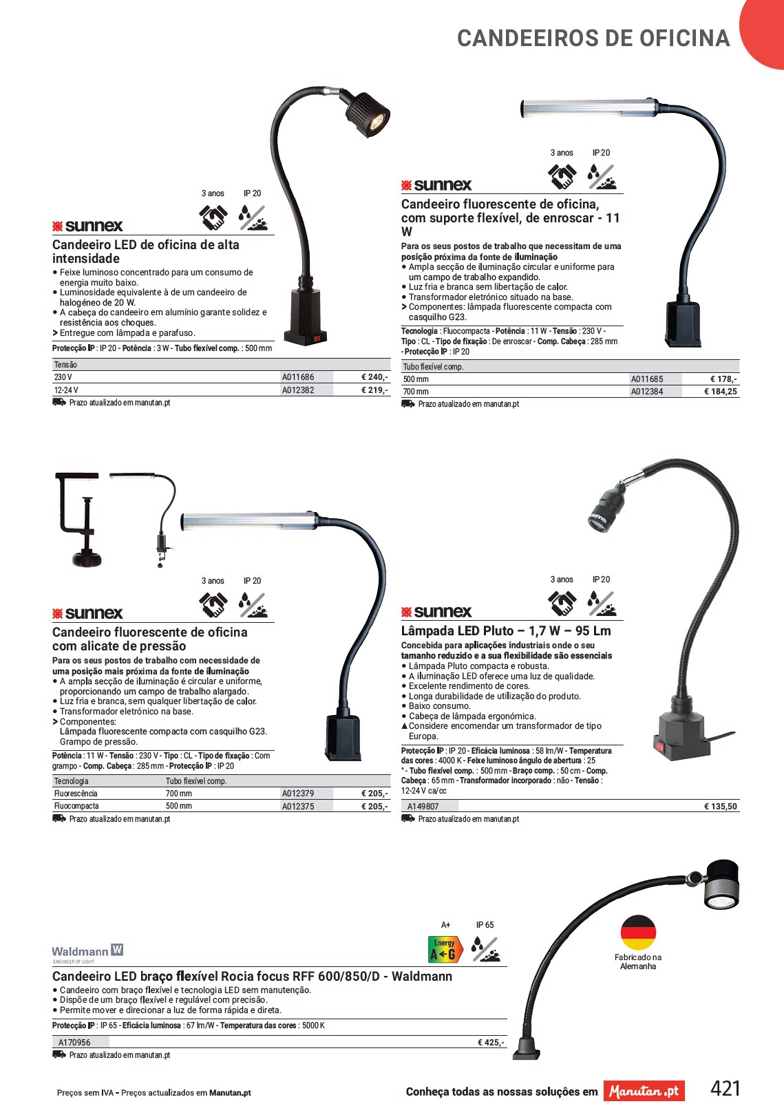CANDEEIROS DE OFICINA 3 anos IP 20 Candeeiro LED de oficina de alta intensidade • Feixe luminoso concentrado para um consumo de energia muito baixo. • Luminosidade equivalente à de um candeeiro de halogéneo de 20 W. • A candeeiro em alumínio garante solidez e resistência aos choques. O Entregue com lâmpada e parafuso. Prote P : IP 20 - Potência : 3 W - Tubo flexível comp. : 500 mm Tensão 230 V 12-24 V Prazo atualizado em manutan.pt A011686 A012382 3 anos IP 20 € 240,- € 219,- Candeeiro fluorescente de oficina, com suporte flexível, de enroscar - 11 W Para os seus postos de trabalho que necessitam de uma óxima da fonte de • Ampla cular e uniforme para um campo de trabalho expandido. • Luz fria e branca sem liber . • Transformador eletrónico situado na base. O Componentes: lâmpada fluorescente compacta com casquilho G23. Tecnologia : Fluocompacta - Potência : 11 W - Tensão : 230 V - Tipo : CL - Tipo de : De enroscar - Comp. Cabe : 285 mm - Prote P : IP 20 Tubo flexível comp. 500 mm 700 mm Prazo atualizado em manutan.pt A011685 A012384 € 178,- € 184,25 3 anos IP 20 Candeeiro fluorescente de oficina com alicate de pressão Para os seus postos de trabalho com necessidade de óxima da fonte • A circular e uniforme, proporcionando um campo de trabalho alargado. • Luz fria e branca, sem qualquer liber . • Transformador eletrónico na base. O Componentes: Lâmpada fluorescente compacta com casquilho G23. Grampo de pressão. Potência : 11 W - Tensão : 230 V - Tipo : CL - Tipo de grampo - Comp. Cabe : 285 mm - Prote P : IP 20 : Com Tecnologia Tubo flexível comp. Fluorescência 700 mm Fluocompacta 500 mm Prazo atualizado em manutan.pt A012379 A012375 3 anos IP 20 € 205,- € 205,- Lâmpada LED Pluto – 1,7 W – 95 Lm Concebida par striais onde o seu tamanho reduzido e a sua flexibilidade são essenciais • Lâmpada Pluto compacta e robusta. • A erece uma luz de qualidade. • Excelente rendimento de cores. • Longa durabilidade de do produto. • Baixo consumo. • de lâmpada ergonómica. SS Considere encomendar um transformador de tipo Europa. Prote P : IP 20 - Eficácia luminosa : 58 lm/W - Temperatura das cores : 4000 K - Feixe luminoso ângulo de abertura : 25 ° - Tubo flexível comp. : 500 mm - Br : 50 cm - Comp. Cabe : 65 mm - Transformador incorporado : não - Tensão : 12-24 V ca/cc A149807 Prazo atualizado em manutan.pt € 135,50 A+ IP 65 Candeeiro LED br xível Rocia focus RFF 600/850/D - Waldmann • Candeeiro com br el e tecnologia LED • Dispõe de um br el e regulável com precisão. • Permite mover e direcionar a luz de forma rápida e direta. Prote P : IP 65 - Eficácia luminosa : 67 lm/W - Temperatura das cores : 5000 K A170956 Prazo atualizado em manutan.pt € 425,- Fabricado na Alemanha 421