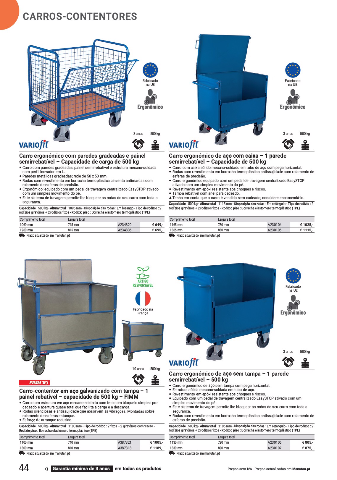 CARROS-CONTENTORES Fabricado na UE Fabricado na UE 3 anos 500 kg 3 anos 500 kg Carro ergonómico com paredes gradeadas e painel semirrebatível – Capacidade de carga de 500 kg • Carro com paredes gradeadas, painel semirrebatível e estrutura mecano-soldada com perfil inovador em L. • Paredes metálicas gradeadas; rede de 50 x 50 mm. • Rodas com revestimento em borracha termoplástica cinzenta antimarcas com rolamento de esferas de precisão. • Ergonómico: equipado com um pedal de travagem centralizado EasySTOP ativado com um simples movimento do pé. • Este sistema de travagem permite-lhe bloquear as rodas do seu carro com toda a segur Capacidade : 500 kg - Altura total : 1095 mm - odas : Em losango - Tipo de rodízio : 2 rodízios giratórios + 2 rodízios fixos - Rodízio piso : Borracha elastómero termoplástico (TPE) Comprimento total Largura total 1060 mm 715 mm 1260 mm 815 mm Prazo atualizado em manutan.pt A234820 A234835 € 649,- € 695,- Carro ergonómico de ede semirrebatível – Capacidade de 500 kg • Carro com caixa sólido mecano-soldado em tubo pega horizontal. • Rodas com revestimento em borracha termoplástica antissujidade com rolamento de esferas de precisão. • Carro ergonómico equipado com um pedal de travagem centralizado EasySTOP ativado com um simples movimento do pé. • Revestimento em epóxi resistente aos choques e riscos. • Tampa rebatível com anel para cadeado. SS Tenha em conta que o carro é vendido sem cadeado; considere encomendá-lo. Capacidade : 500 kg - Altura total : 1115 mm - odas : Em retângulo - Tipo de rodízio : 2 rodízios giratórios + 2 rodízios fixos - Rodízio piso : Borracha elastómero termoplástico (TPE) Comprimento total Largura total 1165 mm 730 mm 1365 mm 830 mm Prazo atualizado em manutan.pt A230104 A230105 € 1025,- € 1115,- Fabricado na Fr Fabricado na UE 3 anos 500 kg 10 anos 500 kg Carro-content anizado com tampa – 1 painel rebatível – capacidade de 500 kg – FIMM • Carro com estrutur mecano-soldado com teto com bloqueio simples por cadeado e abertura quase total que facilita a carga e a descarga. • Rodas silenciosas e antissujidade que absorvem as vibr sobre rolamento de esferas estanque. • Esfor de arranque reduzido. Capacidade : 500 kg - Altura total : 1100 mm - Tipo de rodízio : 2 fixos + 2 giratórios com travão - Rodízio piso : Borracha elastómero termoplástico (TPE) Comprimento total Largura total 1100 mm 710 mm 1300 mm 810 mm Prazo atualizado em manutan.pt A387321 A387318 € 1005,- € 1189,- Carro ergonómico de m tampa – 1 parede semirrebatível – 500 kg • Carro ergonómico de sem tampa com pega horizontal. • Estrutura sólida mecano-soldada em tubo • Revestimento em epóxi resistente aos choques e riscos. • Equipado com um pedal de travagem centralizado EasySTOP ativado com um simples movimento do pé. • Este sistema de travagem permite-lhe bloquear as rodas do seu carro com toda a segur • Rodas com revestimento em borracha termoplástica antissujidade com rolamento de esferas de precisão. Capacidade : 500 kg - Altura total : 1105 mm - odas : Em retângulo - Tipo de rodízio : 2 rodízios giratórios + 2 rodízios fixos - Rodízio piso : Borracha elastómero termoplástico (TPE) Comprimento total Largura total 1130 mm 720 mm 1330 mm 820 mm Prazo atualizado em manutan.pt A230106 A230107 € 805,- € 875,- 44