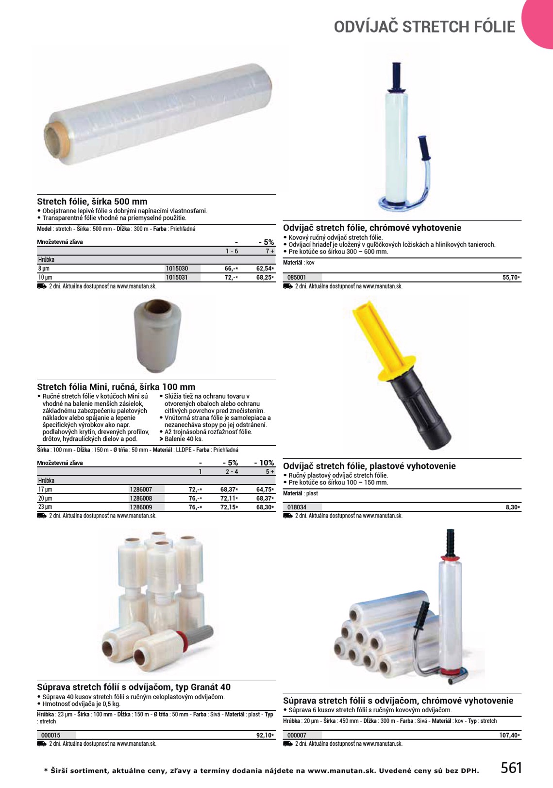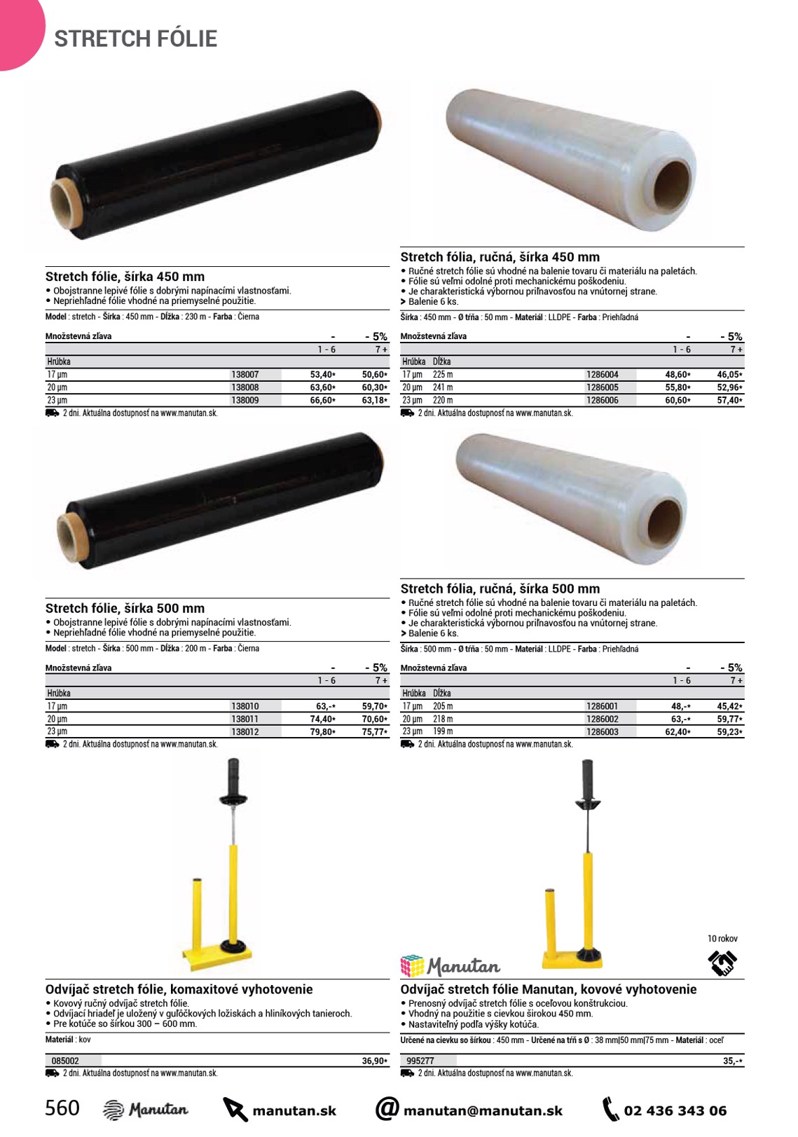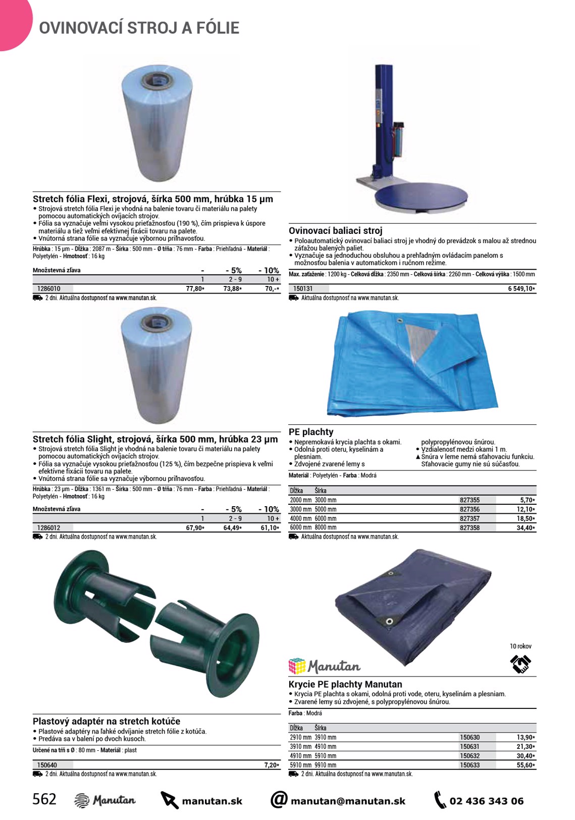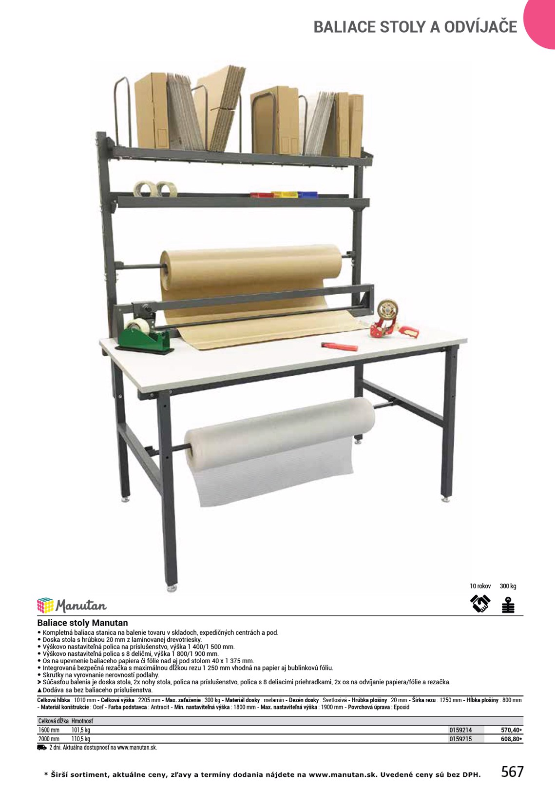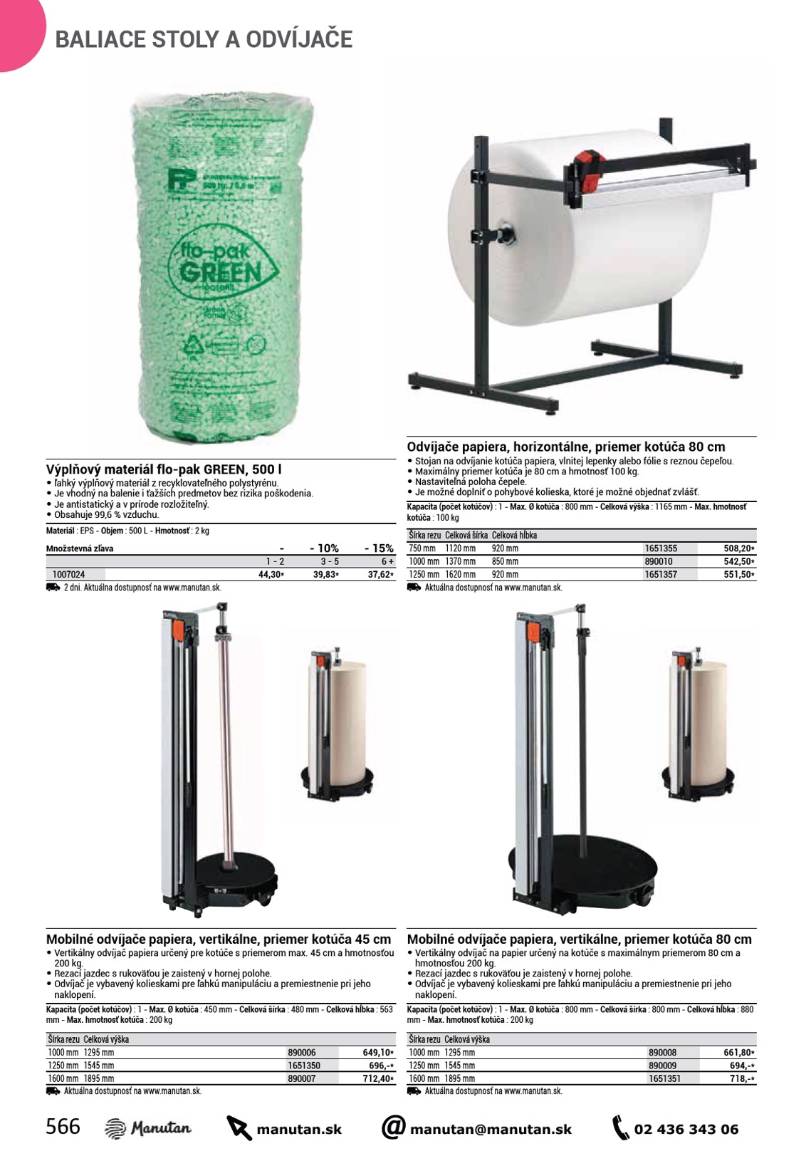 BALIACE STOLY A ODVÍJAČE Výplňový materiál flo-pak GREEN, 500 l • ľahký výplňový materiál z recyklovateľného polystyrénu. • Je vhodný na balenie i ťažších predmetov bez rizika poškodenia. • Je antistatický a v prírode rozložiteľný. • Obsahuje 99,6 % vzduchu. Materiál : EPS - Objem : 500 L - Hmotnosť : 2 kg Množstevná zľava 1007024 2 dni. Aktuálna dostupnosť na www.manutan.sk. - 1 - 2 44,30* - 10% 3 - 5 39,83* - 15% 6 + 37,62* Odvíjače papiera, horizontálne, priemer kotúča 80 cm • Stojan na odvíjanie kotúča papiera, vlnitej lepenky alebo fólie s reznou čepeľou. • Maximálny priemer kotúča je 80 cm a hmotnosť 100 kg. • Nastaviteľná poloha čepele. • Je možné doplniť o pohybové kolieska, ktoré je možné objednať zvlášť. Kapacita (počet kotúčov) : 1 - Max. Ø kotúča : 800 mm - Celková výška : 1165 mm - Max. hmotnosť kotúča : 100 kg Šírka rezu Celková šírka Celková hĺbka 750 mm 1120 mm 920 mm 1000 mm 1370 mm 850 mm 1250 mm 1620 mm 920 mm Aktuálna dostupnosť na www.manutan.sk. 1651355 890010 1651357 508,20* 542,50* 551,50* Mobilné odvíjače papiera, vertikálne, priemer kotúča 45 cm • Vertikálny odvíjač papiera určený pre kotúče s priemerom max. 45 cm a hmotnosťou 200 kg. • Rezací jazdec s rukoväťou je zaistený v hornej polohe. • Odvíjač je vybavený kolieskami pre ľahkú manipuláciu a premiestnenie pri jeho naklopení. Kapacita (počet kotúčov) : 1 - Max. Ø kotúča : 450 mm - Celková šírka : 480 mm - Celková hĺbka : 563 mm - Max. hmotnosť kotúča : 200 kg Šírka rezu Celková výška 1000 mm 1295 mm 1250 mm 1545 mm 1600 mm 1895 mm Aktuálna dostupnosť na www.manutan.sk. 890006 1651350 890007 649,10* 696,-* 712,40* Mobilné odvíjače papiera, vertikálne, priemer kotúča 80 cm • Vertikálny odvíjač na papier určený na kotúče s maximálnym priemerom 80 cm a hmotnosťou 200 kg. • Rezací jazdec s rukoväťou je zaistený v hornej polohe. • Odvíjač je vybavený kolieskami pre ľahkú manipuláciu a premiestnenie pri jeho naklopení. Kapacita (počet kotúčov) : 1 - Max. Ø kotúča : 800 mm - Celková šírka : 800 mm - Celková hĺbka : 880 mm - Max. hmotnosť kotúča : 200 kg Šírka rezu Celková výška 1000 mm 1295 mm 1250 mm 1545 mm 1600 mm 1895 mm Aktuálna dostupnosť na www.manutan.sk. 890008 890009 1651351 661,80* 694,-* 718,-* 566 PDQXWDQVN # PDQXWDQ#PDQXWDQVN