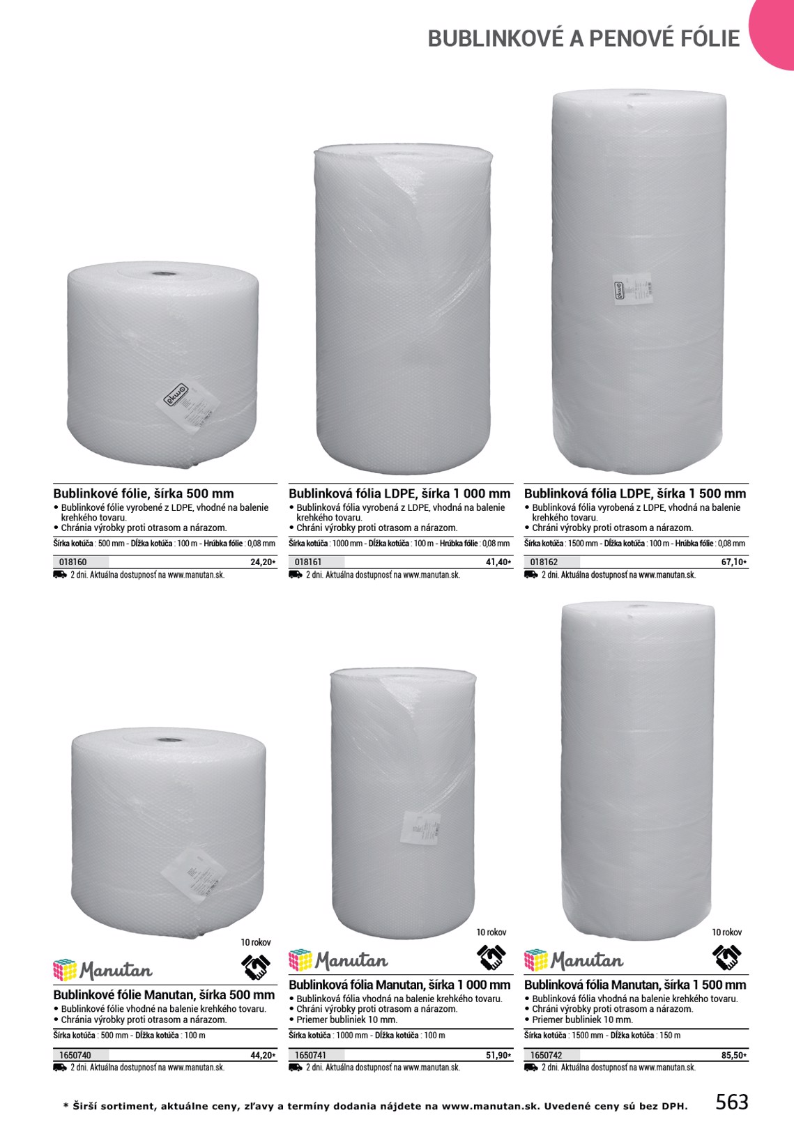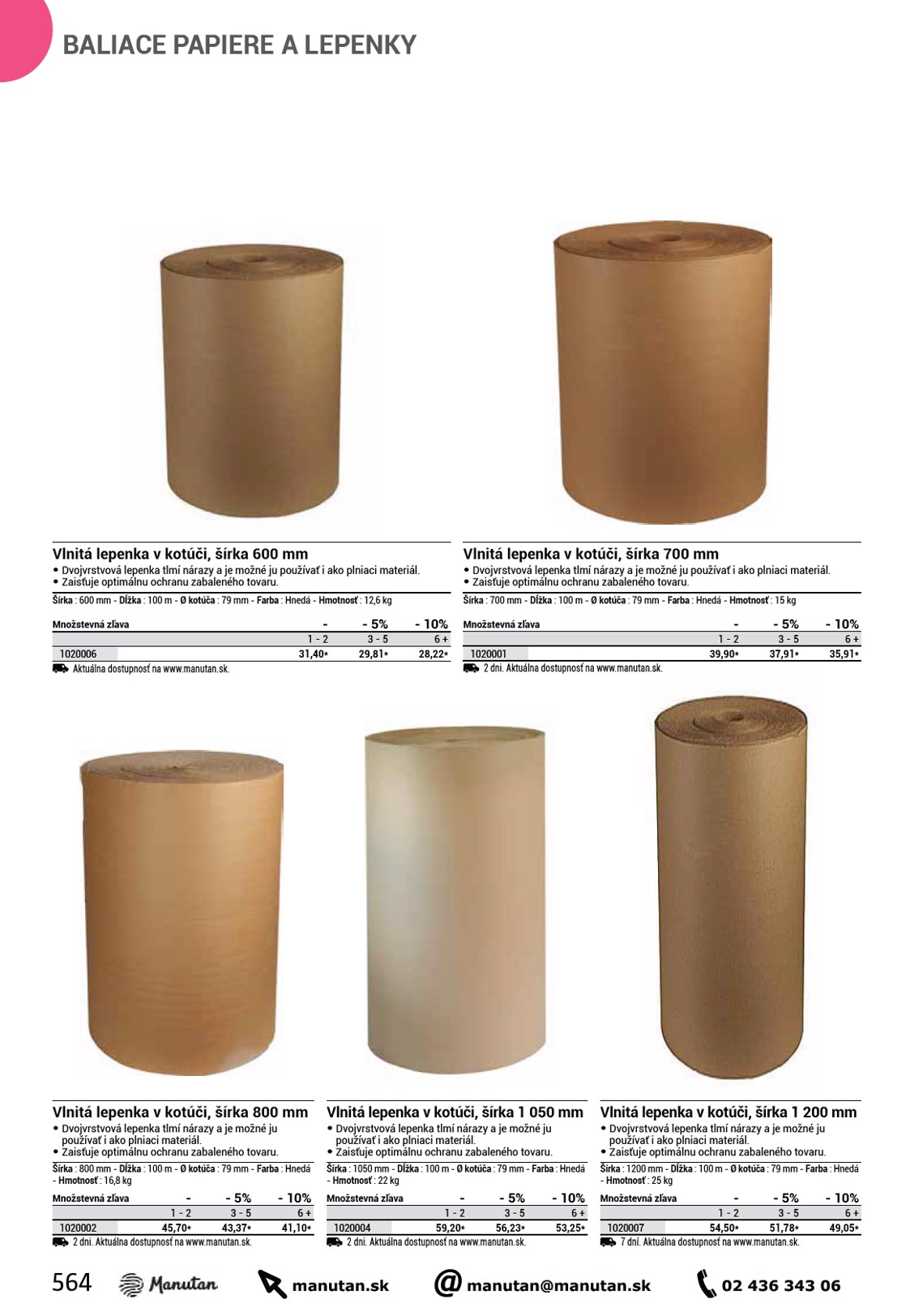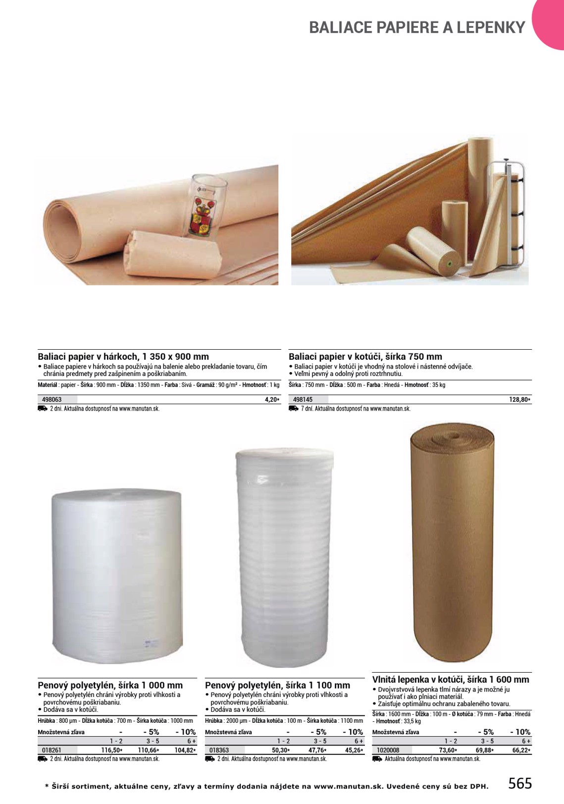 BALIACE PAPIERE A LEPENKY Baliaci papier v hárkoch, 1 350 x 900 mm • Baliace papiere v hárkoch sa používajú na balenie alebo prekladanie tovaru, čím chránia predmety pred zašpinením a poškriabaním. Materiál : papier - Šírka : 900 mm - Dĺžka : 1350 mm - Farba : Sivá - Gramáž : 90 g/m² - Hmotnosť : 1 kg 498063 2 dni. Aktuálna dostupnosť na www.manutan.sk. 4,20* Baliaci papier v kotúči, šírka 750 mm • Baliaci papier v kotúči je vhodný na stolové i nástenné odvíjače. • Veľmi pevný a odolný proti roztrhnutiu. Šírka : 750 mm - Dĺžka : 500 m - Farba : Hnedá - Hmotnosť : 35 kg 498145 7 dní. Aktuálna dostupnosť na www.manutan.sk. 128,80* Penový polyetylén, šírka 1 000 mm • Penový polyetylén chráni výrobky proti vlhkosti a povrchovému poškriabaniu. • Dodáva sa v kotúči. Hrúbka : 800 µm - Dĺžka kotúča : 700 m - Šírka kotúča : 1000 mm Množstevná zľava - - 5% 1 - 2 3 - 5 018261 116,50* 110,66* 2 dni. Aktuálna dostupnosť na www.manutan.sk. - 10% 6 + 104,82* Penový polyetylén, šírka 1 100 mm • Penový polyetylén chráni výrobky proti vlhkosti a povrchovému poškriabaniu. • Dodáva sa v kotúči. Hrúbka : 2000 µm - Dĺžka kotúča : 100 m - Šírka kotúča : 1100 mm Množstevná zľava - - 5% 1 - 2 3 - 5 018363 50,30* 47,76* 2 dni. Aktuálna dostupnosť na www.manutan.sk. - 10% 6 + 45,26* Vlnitá lepenka v kotúči, šírka 1 600 mm • Dvojvrstvová lepenka tlmí nárazy a je možné ju používať i ako plniaci materiál. • Zaisťuje optimálnu ochranu zabaleného tovaru. Šírka : 1600 mm - Dĺžka : 100 m - Ø kotúča : 79 mm - Farba : Hnedá - Hmotnosť : 33,5 kg Množstevná zľava - - 5% - 10% 1 - 2 3 - 5 6 + 1020008 73,60* 69,88* 66,22* Aktuálna dostupnosť na www.manutan.sk. âLUãtVRUWLPHQWDNWXiOQHFHQ\]ĐDY\DWHUPtQ\GRGDQLDQiMGHWHQDZZZPDQXWDQVN8YHGHQpFHQ\V~EH]'3+ 565