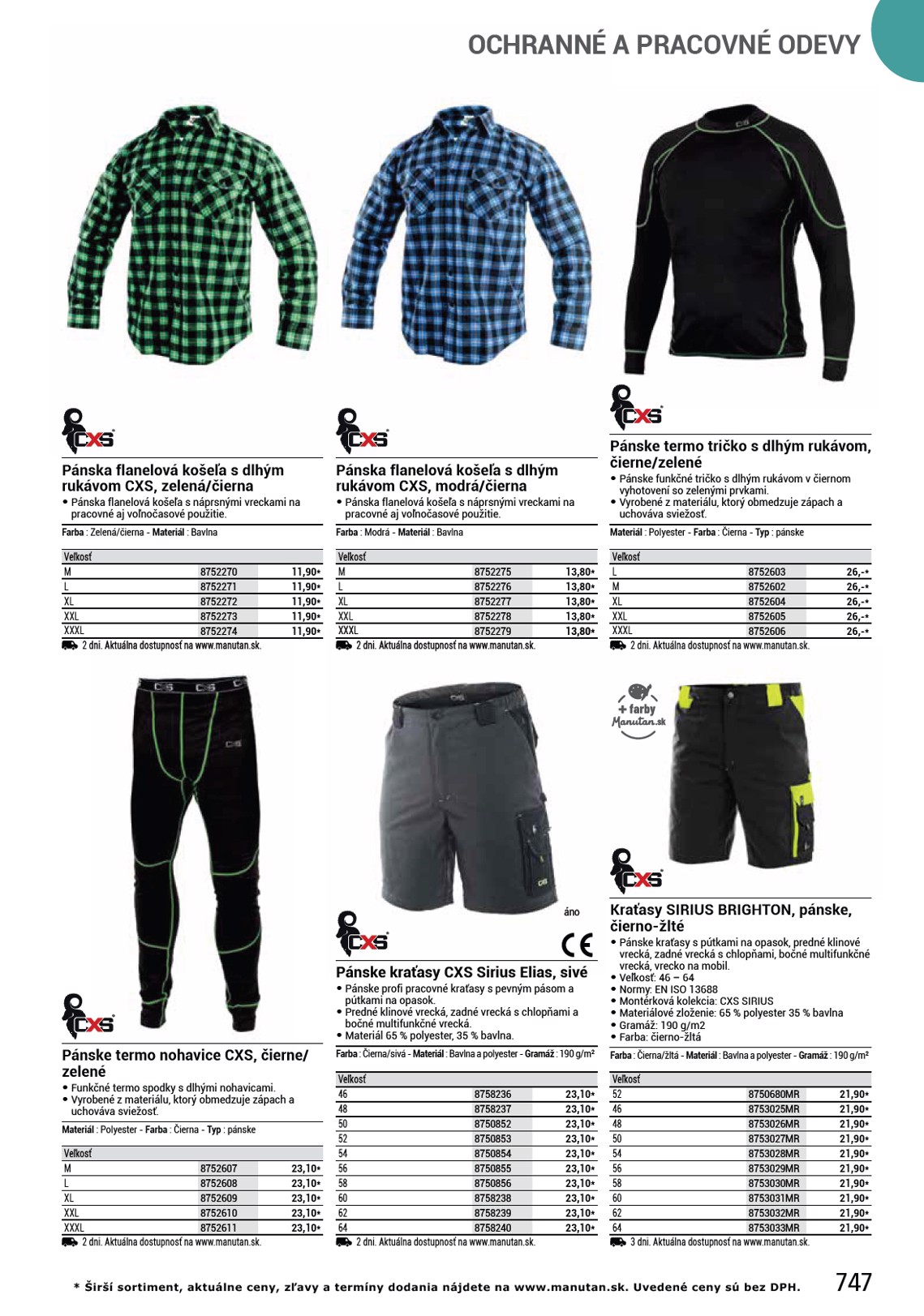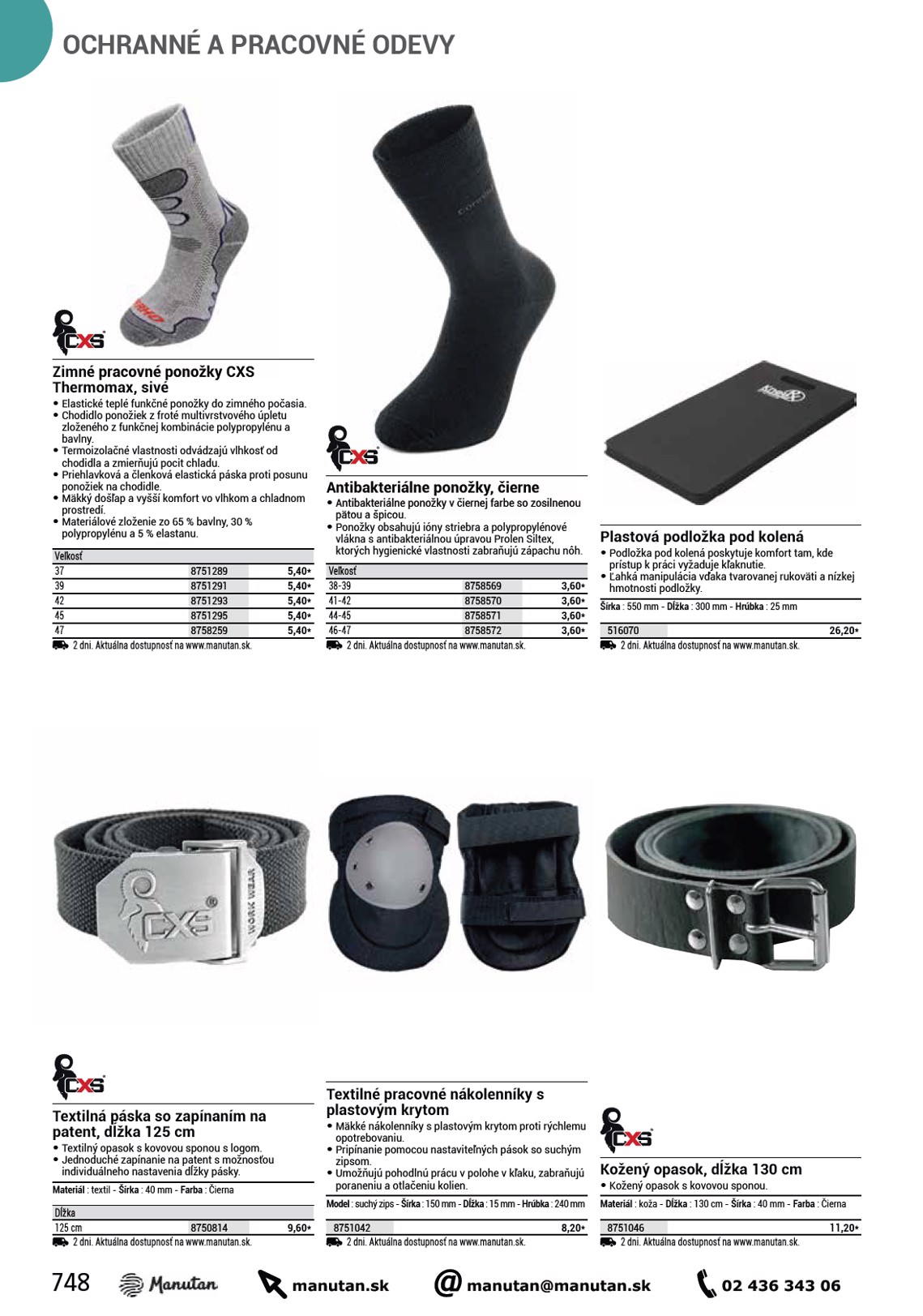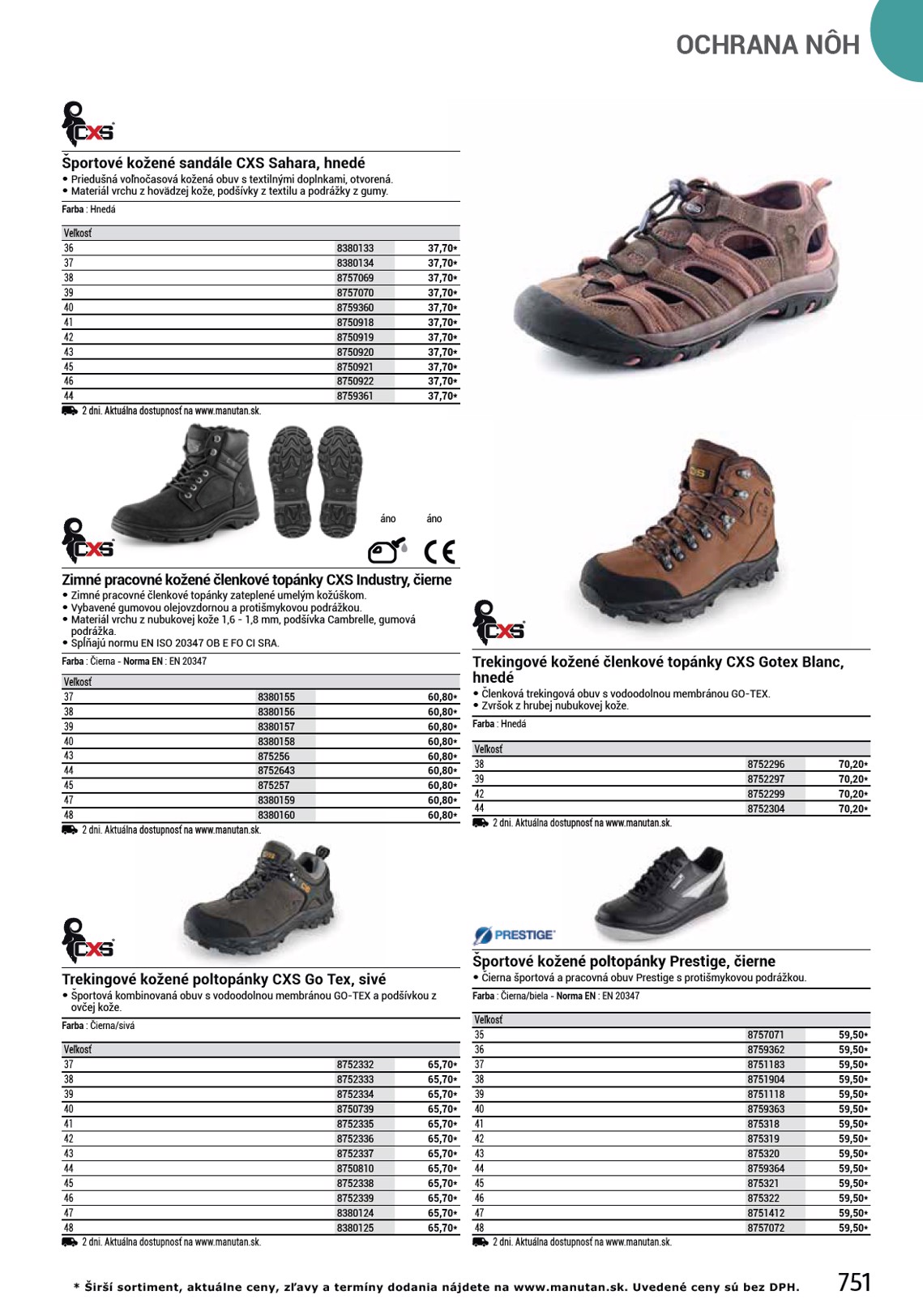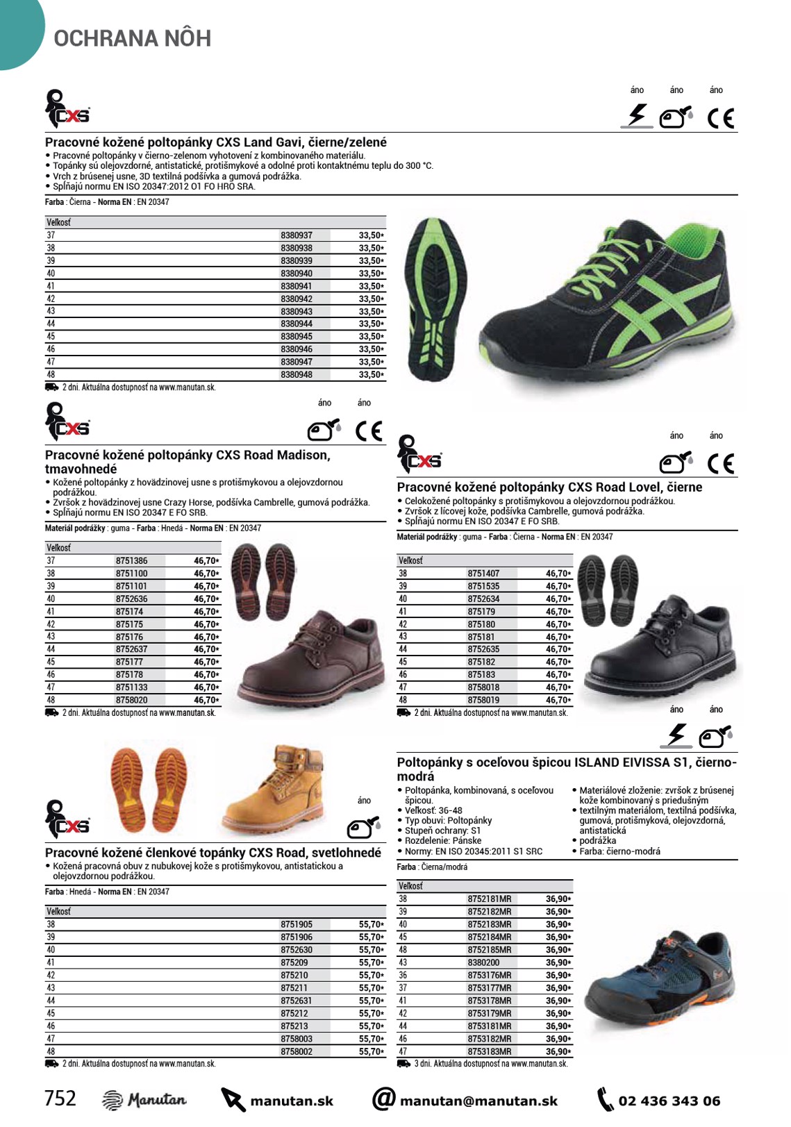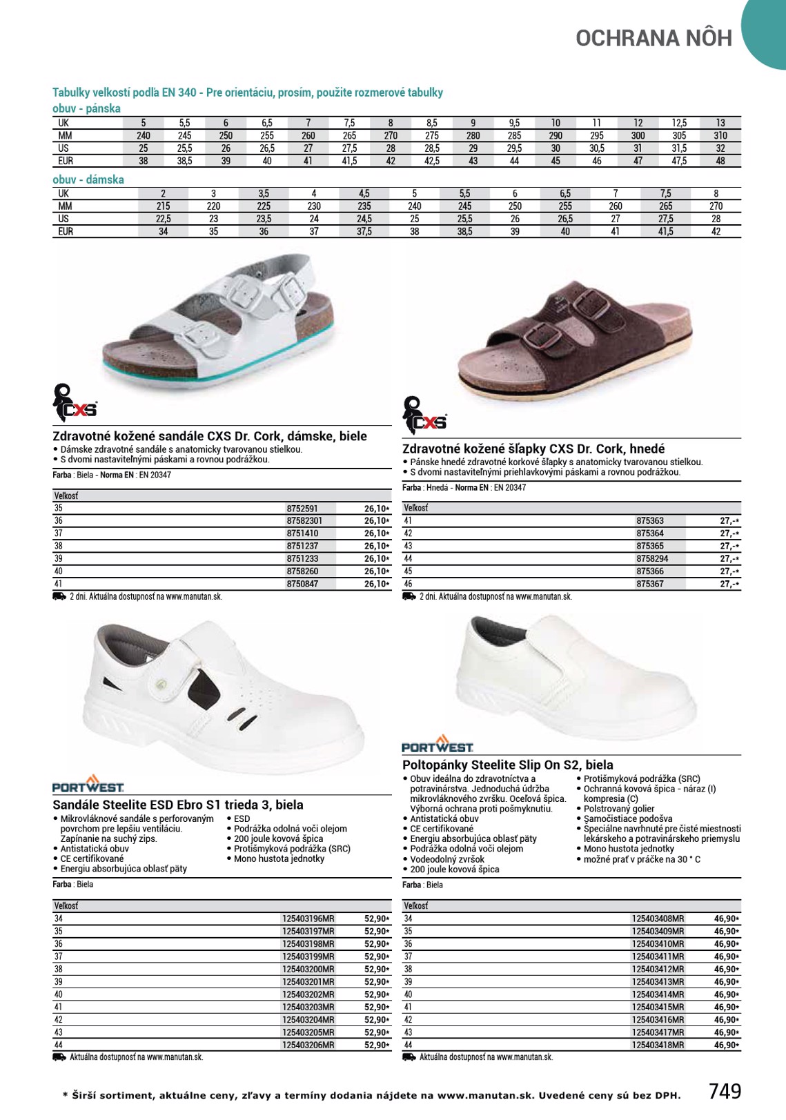 OCHRANA NÔH Tabuľky veľkostí podľa EN 340 - Pre orientáciu, prosím, použite rozmerové tabuľky obuv - pánska UK 5 5,5 6 6,5 7 7,5 8 8,5 9 9,5 10 11 12 12,5 13 MM 240 245 250 255 260 265 270 275 280 285 290 295 300 305 310 US 25 25,5 26 26,5 27 27,5 28 28,5 29 29,5 30 30,5 31 31,5 32 EUR 38 38,5 39 40 41 41,5 42 42,5 43 44 45 46 47 47,5 48 obuv - dámska UK 2 3 3,5 4 4,5 5 5,5 6 6,5 7 7,5 8 MM 215 220 225 230 235 240 245 250 255 260 265 270 US 22,5 23 23,5 24 24,5 25 25,5 26 26,5 27 27,5 28 EUR 34 35 36 37 37,5 38 38,5 39 40 41 41,5 42 Zdravotné kožené sandále CXS Dr. Cork, dámske, biele • Dámske zdravotné sandále s anatomicky tvarovanou stielkou. • S dvomi nastaviteľnými páskami a rovnou podrážkou. Farba : Biela - Norma EN : EN 20347 Veľkosť 35 36 37 38 39 40 41 2 dni. Aktuálna dostupnosť na www.manutan.sk. 8752591 87582301 8751410 8751237 8751233 8758260 8750847 26,10* 26,10* 26,10* 26,10* 26,10* 26,10* 26,10* Zdravotné kožené šľapky CXS Dr. Cork, hnedé • Pánske hnedé zdravotné korkové šľapky s anatomicky tvarovanou stielkou. • S dvomi nastaviteľnými priehlavkovými páskami a rovnou podrážkou. Farba : Hnedá - Norma EN : EN 20347 Veľkosť 41 42 43 44 45 46 2 dni. Aktuálna dostupnosť na www.manutan.sk. 875363 875364 875365 8758294 875366 875367 27,-* 27,-* 27,-* 27,-* 27,-* 27,-* Sandále Steelite ESD Ebro S1 trieda 3, biela • Mikrovláknové sandále s perforovaným • ESD povrchom pre lepšiu ventiláciu. • Podrážka odolná voči olejom Zapínanie na suchý zips. • 200 joule kovová špica • Antistatická obuv • Protišmyková podrážka (SRC) • CE certifikované • Mono hustota jednotky • Energiu absorbujúca oblasť päty Farba : Biela Veľkosť 34 35 36 37 38 39 40 41 42 43 44 Aktuálna dostupnosť na www.manutan.sk. 125403196MR 125403197MR 125403198MR 125403199MR 125403200MR 125403201MR 125403202MR 125403203MR 125403204MR 125403205MR 125403206MR 52,90* 52,90* 52,90* 52,90* 52,90* 52,90* 52,90* 52,90* 52,90* 52,90* 52,90* Poltopánky Steelite Slip On S2, biela • Obuv ideálna do zdravotníctva a • Protišmyková podrážka (SRC) potravinárstva. Jednoduchá údržba • Ochranná kovová špica - náraz (I) mikrovláknového zvršku. Oceľová špica. kompresia (C) Výborná ochrana proti pošmyknutiu. • Polstrovaný golier • Antistatická obuv • Samočistiace podošva • CE certifikované • Špeciálne navrhnuté pre čisté miestnosti • Energiu absorbujúca oblasť päty lekárskeho a potravinárskeho priemyslu • Podrážka odolná voči olejom • Mono hustota jednotky • Vodeodolný zvršok • možné prať v práčke na 30 ° C • 200 joule kovová špica Farba : Biela Veľkosť 34 35 36 37 38 39 40 41 42 43 44 Aktuálna dostupnosť na www.manutan.sk. 125403408MR 125403409MR 125403410MR 125403411MR 125403412MR 125403413MR 125403414MR 125403415MR 125403416MR 125403417MR 125403418MR 46,90* 46,90* 46,90* 46,90* 46,90* 46,90* 46,90* 46,90* 46,90* 46,90* 46,90* âLUãtVRUWLPHQWDNWXiOQHFHQ\]ĐDY\DWHUPtQ\GRGDQLDQiMGHWHQDZZZPDQXWDQVN8YHGHQpFHQ\V~EH]'3+ 749