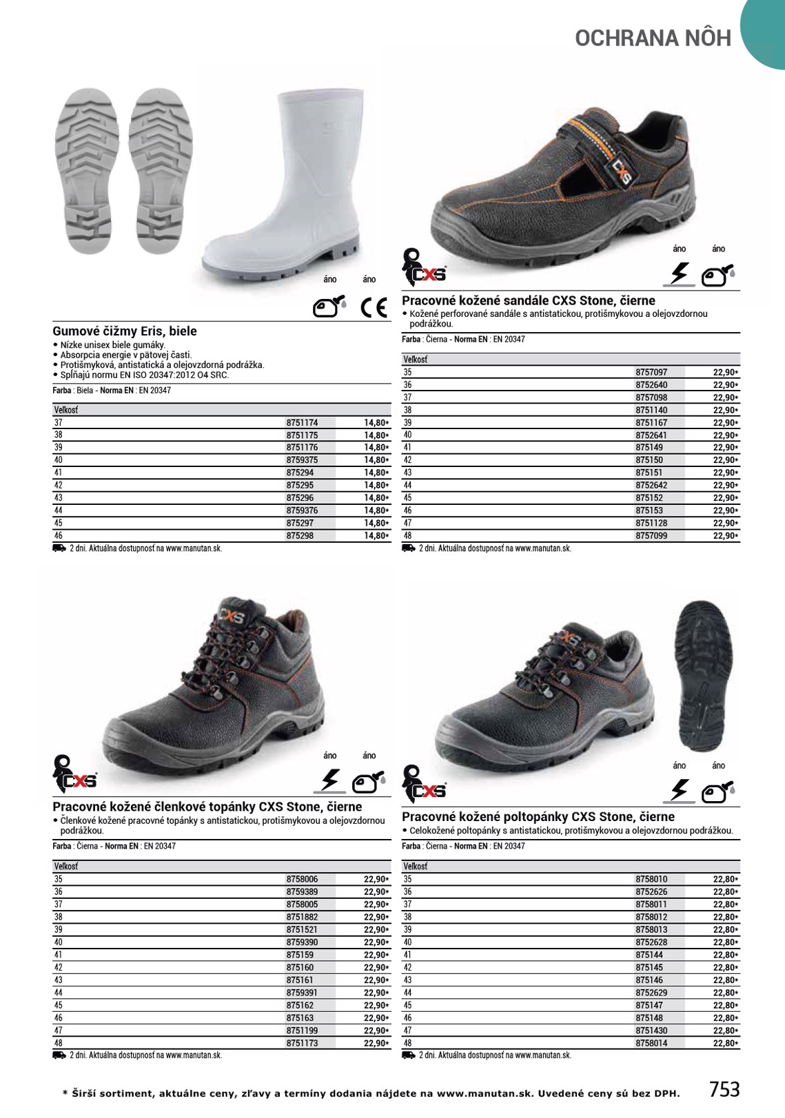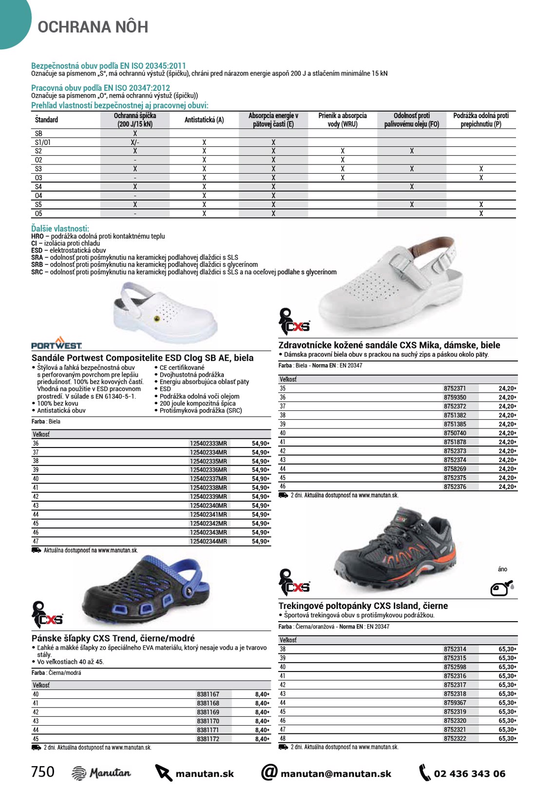 OCHRANA NÔH Bezpečnostná obuv podľa EN ISO 20345:2011 Označuje sa písmenom „S“, má ochrannú výstuž (špičku), chráni pred nárazom energie aspoň 200 J a stlačením minimálne 15 kN Pracovná obuv podľa EN ISO 20347:2012 Označuje sa písmenom „O“, nemá ochrannú výstuž (špičku)) Prehľad vlastností bezpečnostnej aj pracovnej obuvi: Štandard Ochranná špička (200 J/15 kN) Antistatická (A) SB X S1/O1 X/- X S2 X X O2 - X S3 X X O3 - X S4 X X O4 - X S5 X X O5 - X Absorpcia energie v pätovej časti (E) X X X X X X X X X Prienik a absorpcia vody (WRU) Odolnosť proti palivovému oleju (FO) X X X X X X X X Ďalšie vlastnosti: HRO – podrážka odolná proti kontaktnému teplu CI – izolácia proti chladu ESD – elektrostatická obuv SRA – odolnosť proti pošmyknutiu na keramickej podlahovej dlaždici s SLS SRB – odolnosť proti pošmyknutiu na keramickej podlahovej dlaždici s glycerínom SRC – odolnosť proti pošmyknutiu na keramickej podlahovej dlaždici s SLS a na oceľovej podlahe s glycerínom Podrážka odolná proti prepichnutiu (P) X X X X Sandále Portwest Compositelite ESD Clog SB AE, biela • Štýlová a ľahká bezpečnostná obuv • CE certifikované s perforovaným povrchom pre lepšiu • Dvojhustotná podrážka priedušnosť. 100% bez kovových častí. • Energiu absorbujúca oblasť päty Vhodná na použitie v ESD pracovnom • ESD prostredí. V súlade s EN 61340-5-1. • Podrážka odolná voči olejom • 100% bez kovu • 200 joule kompozitná špica • Antistatická obuv • Protišmyková podrážka (SRC) Farba : Biela Veľkosť 36 37 38 39 40 41 42 43 44 45 46 47 Aktuálna dostupnosť na www.manutan.sk. 125402333MR 125402334MR 125402335MR 125402336MR 125402337MR 125402338MR 125402339MR 125402340MR 125402341MR 125402342MR 125402343MR 125402344MR 54,90* 54,90* 54,90* 54,90* 54,90* 54,90* 54,90* 54,90* 54,90* 54,90* 54,90* 54,90* Zdravotnícke kožené sandále CXS Mika, dámske, biele • Dámska pracovní biela obuv s prackou na suchý zips a páskou okolo päty. Farba : Biela - Norma EN : EN 20347 Veľkosť 35 36 37 38 39 40 41 42 43 44 45 46 2 dni. Aktuálna dostupnosť na www.manutan.sk. 8752371 8759350 8752372 8751382 8751385 8750740 8751878 8752373 8752374 8758269 8752375 8752376 24,20* 24,20* 24,20* 24,20* 24,20* 24,20* 24,20* 24,20* 24,20* 24,20* 24,20* 24,20* áno Pánske šľapky CXS Trend, čierne/modré • Ľahké a mäkké šľapky zo špeciálneho EVA materiálu, ktorý nesaje vodu a je tvarovo stály. • Vo veľkostiach 40 až 45. Farba : Čierna/modrá Veľkosť 40 41 42 43 44 45 2 dni. Aktuálna dostupnosť na www.manutan.sk. 8381167 8381168 8381169 8381170 8381171 8381172 8,40* 8,40* 8,40* 8,40* 8,40* 8,40* Trekingové poltopánky CXS Island, čierne • Športová trekingová obuv s protišmykovou podrážkou. Farba : Čierna/oranžová - Norma EN : EN 20347 Veľkosť 38 39 40 41 42 43 44 45 46 47 48 2 dni. Aktuálna dostupnosť na www.manutan.sk. 8752314 8752315 8752598 8752316 8752317 8752318 8759367 8752319 8752320 8752321 8752322 65,30* 65,30* 65,30* 65,30* 65,30* 65,30* 65,30* 65,30* 65,30* 65,30* 65,30* 750 PDQXWDQVN # PDQXWDQ#PDQXWDQVN