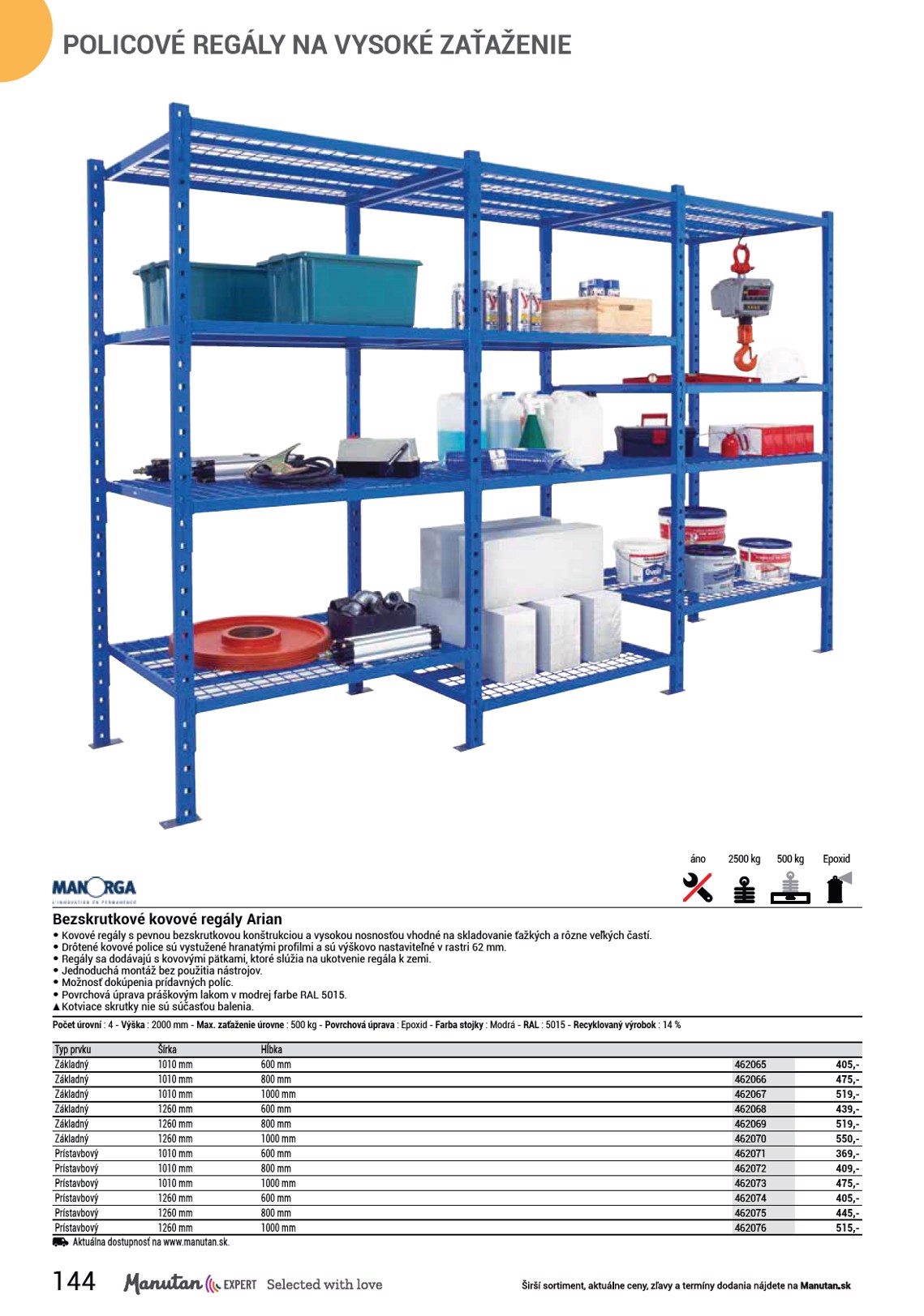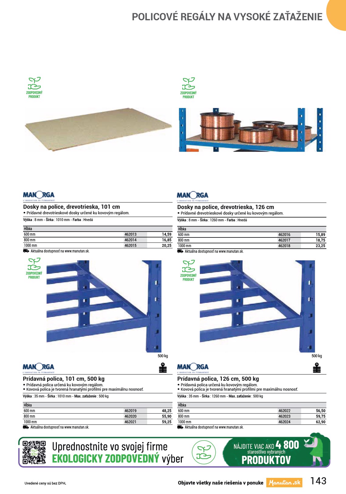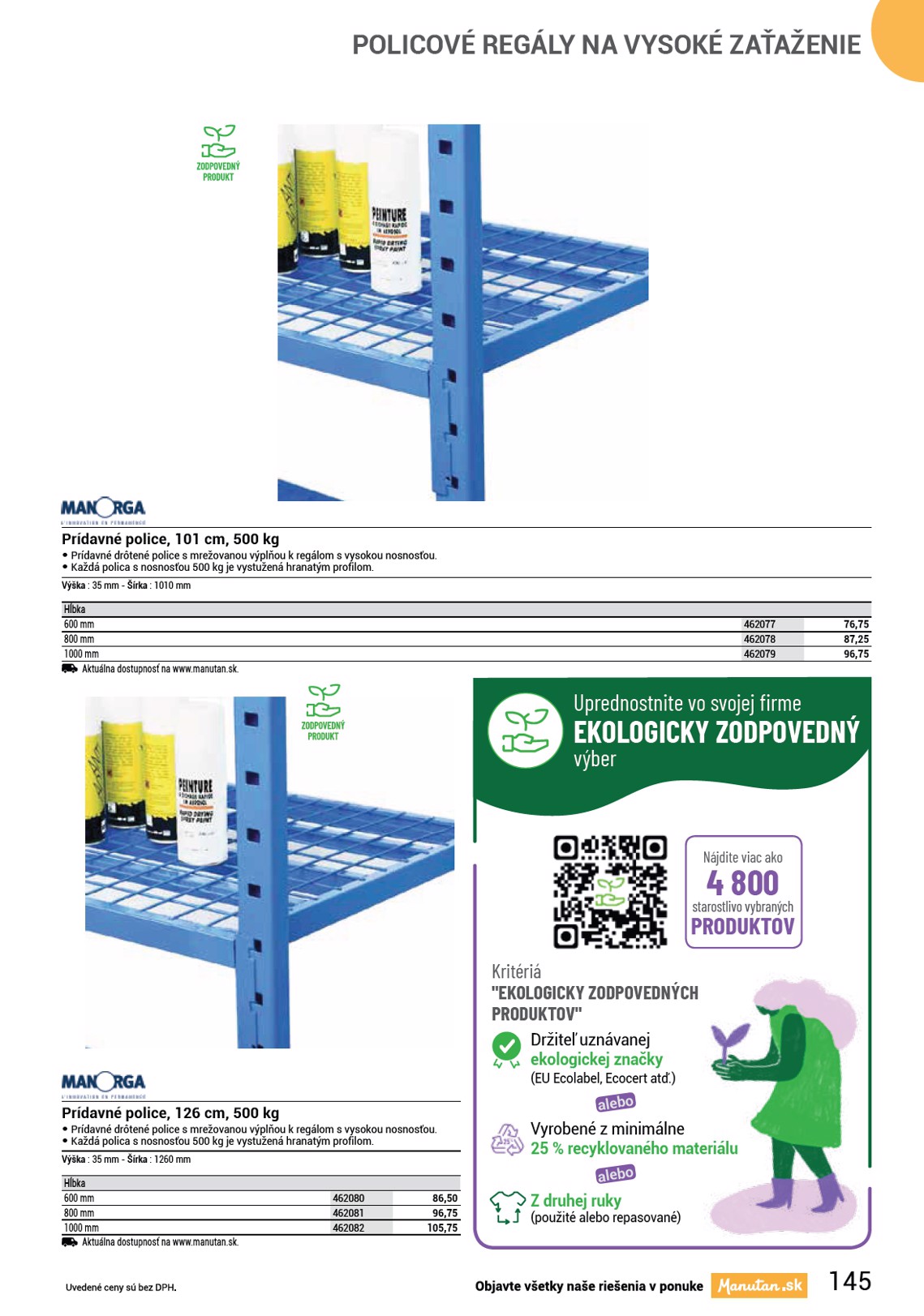 POLICOVÉ REGÁLY NA VYSOKÉ ZAŤAŽENIE Prídavné police, 101 cm, 500 kg • Prídavné drôtené police s mrežovanou výplňou k regálom s vysokou nosnosťou. • Každá polica s nosnosťou 500 kg je vystužená hranatým profilom. Výška : 35 mm - Šírka : 1010 mm Hĺbka 600 mm 800 mm 1000 mm Aktuálna dostupnosť na www.manutan.sk. 462077 462078 462079 76,75 87,25 96,75 Uprednostnite vo svojej firme EKOLOGICKY ZODPOVEDNÝ výber Prídavné police, 126 cm, 500 kg • Prídavné drôtené police s mrežovanou výplňou k regálom s vysokou nosnosťou. • Každá polica s nosnosťou 500 kg je vystužená hranatým profilom. Výška : 35 mm - Šírka : 1260 mm Hĺbka 600 mm 800 mm 1000 mm Aktuálna dostupnosť na www.manutan.sk. 462080 462081 462082 86,50 96,75 105,75 Nájdite viac ako 4 800 starostlivo vybraných PRODUKTOV Kritériá "EKOLOGICKY ZODPOVEDNÝCH PRODUKTOV" Držiteľ uznávanej ekologickej značky (EU Ecolabel, Ecocert atď.) alebo Vyrobené z minimálne 25 % recyklovaného materiálu alebo Z druhej ruky (použité alebo repasované) 145