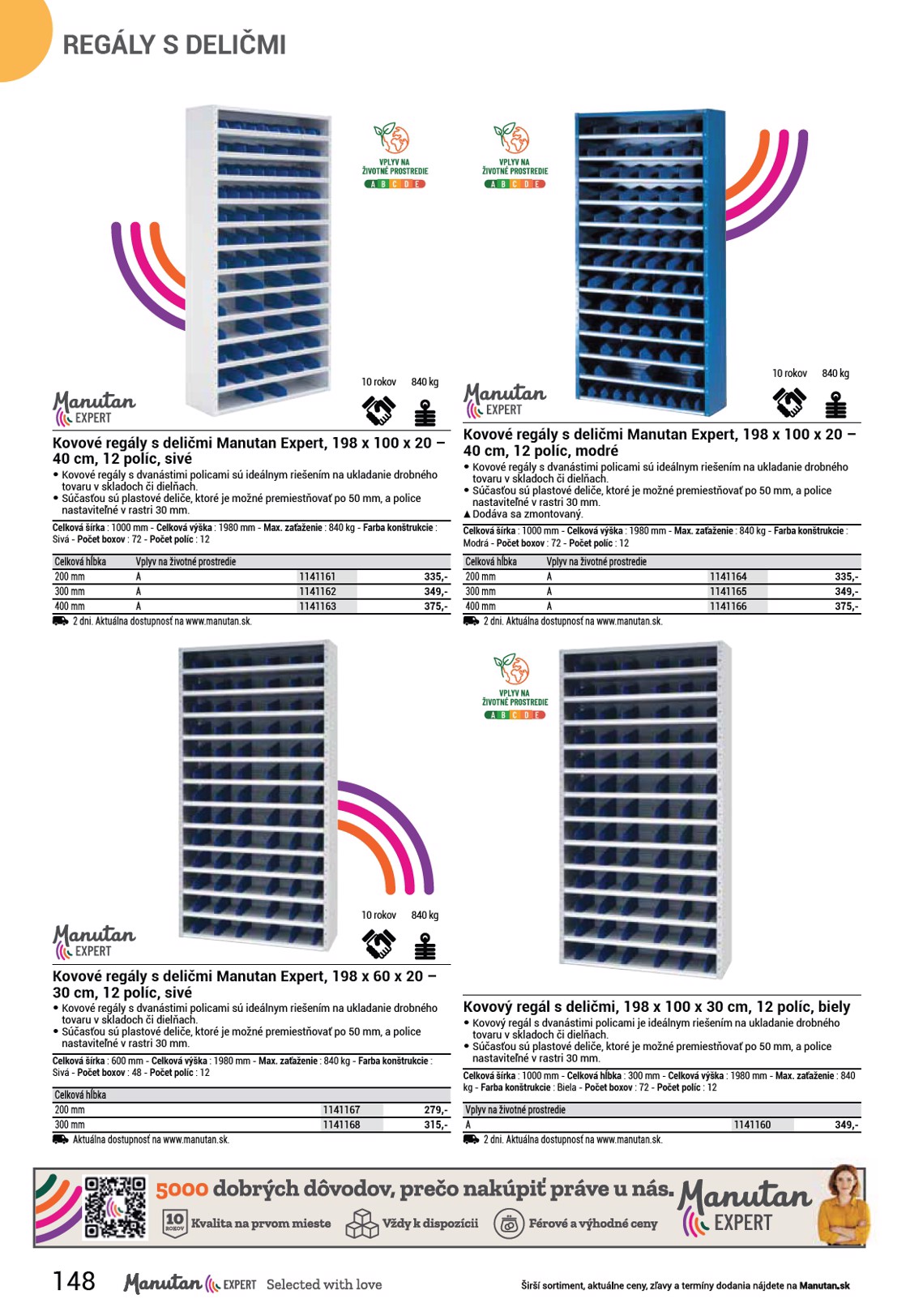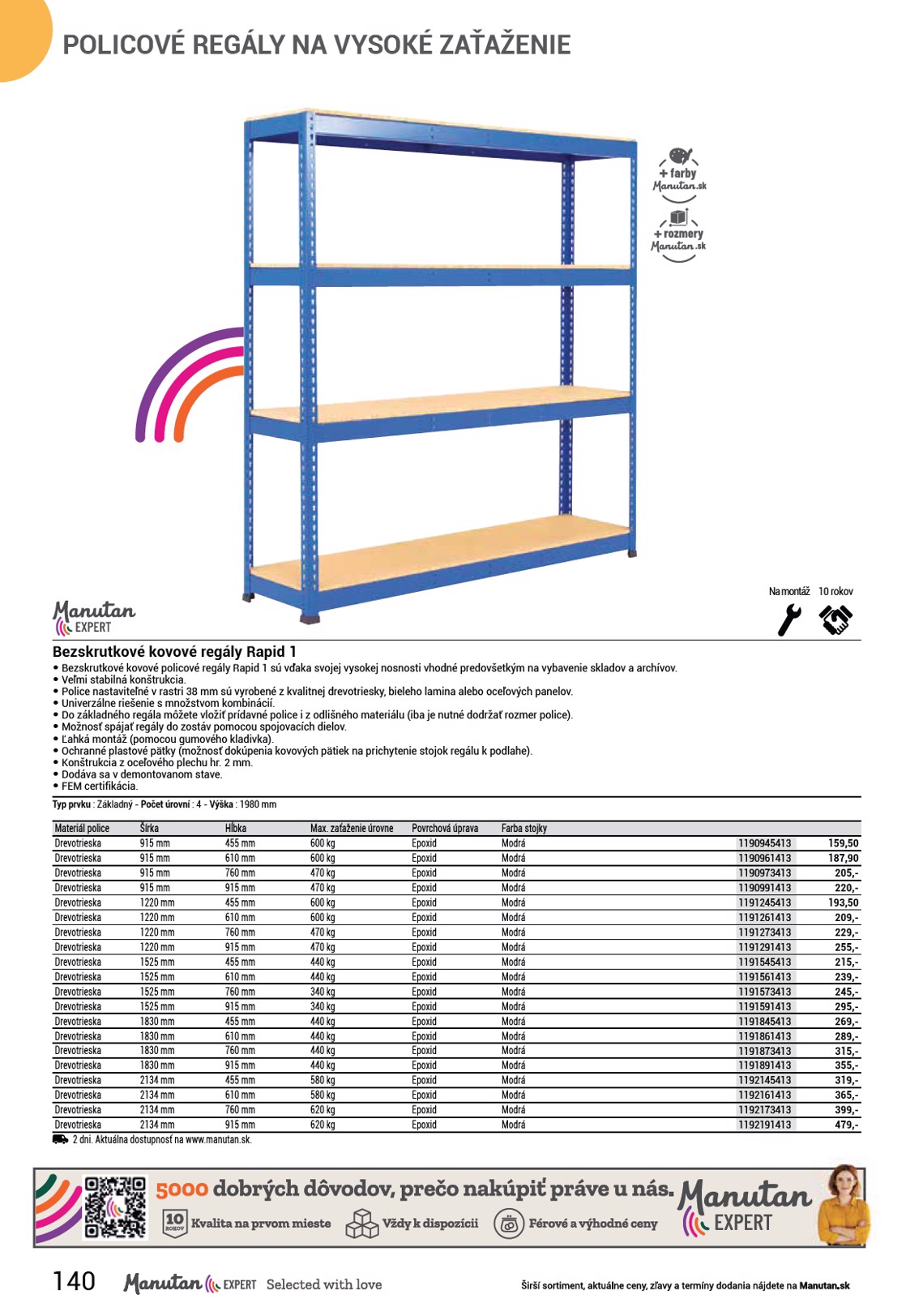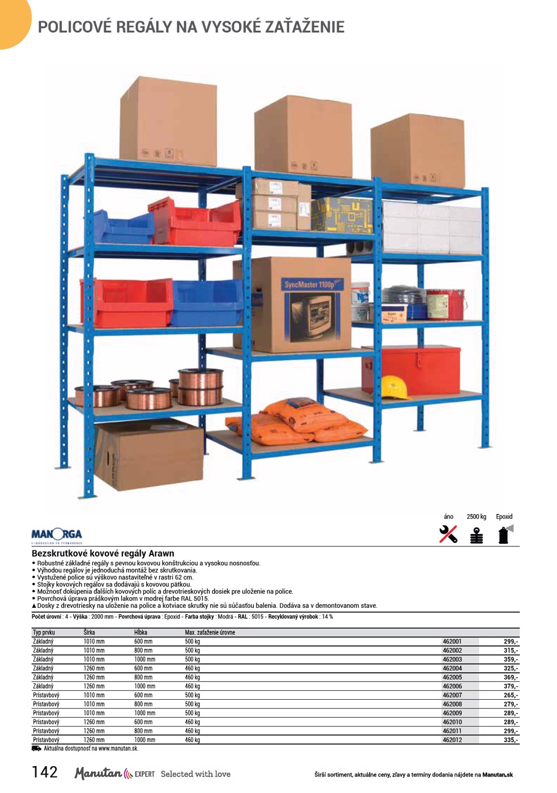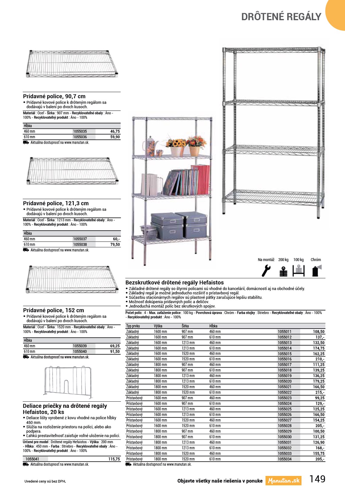 POLICOVÉ REGÁLY NA VYSOKÉ ZAŤAŽENIE Prídavné police, 101 cm, 500 kg • Prídavné drôtené police s mrežovanou výplňou k regálom s vysokou nosnosťou. • Každá polica s nosnosťou 500 kg je vystužená hranatým profilom. Výška : 35 mm - Šírka : 1010 mm Hĺbka 600 mm 800 mm 1000 mm Aktuálna dostupnosť na www.manutan.sk. 462077 462078 462079 76,75 87,25 96,75 Uprednostnite vo svojej firme EKOLOGICKY ZODPOVEDNÝ výber Prídavné police, 126 cm, 500 kg • Prídavné drôtené police s mrežovanou výplňou k regálom s vysokou nosnosťou. • Každá polica s nosnosťou 500 kg je vystužená hranatým profilom. Výška : 35 mm - Šírka : 1260 mm Hĺbka 600 mm 800 mm 1000 mm Aktuálna dostupnosť na www.manutan.sk. 462080 462081 462082 86,50 96,75 105,75 Nájdite viac ako 4 800 starostlivo vybraných PRODUKTOV Kritériá "EKOLOGICKY ZODPOVEDNÝCH PRODUKTOV" Držiteľ uznávanej ekologickej značky (EU Ecolabel, Ecocert atď.) alebo Vyrobené z minimálne 25 % recyklovaného materiálu alebo Z druhej ruky (použité alebo repasované) 145