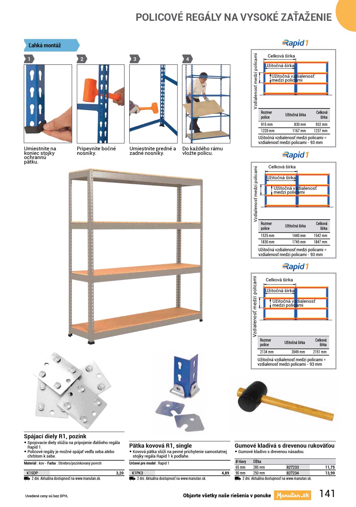 POLICOVÉ REGÁLY NA VYSOKÉ ZAŤAŽENIE áno 2500 kg 500 kg Epoxid Bezskrutkové kovové regály Arian • Kovové regály s pevnou bezskrutkovou konštrukciou a vysokou nosnosťou vhodné na skladovanie ťažkých a rôzne veľkých častí. • Drôtené kovové police sú vystužené hranatými profilmi a sú výškovo nastaviteľné v rastri 62 mm. • Regály sa dodávajú s kovovými pätkami, ktoré slúžia na ukotvenie regála k zemi. • Jednoduchá montáž bez použitia nástrojov. • Možnosť dokúpenia prídavných políc. • Povrchová úprava práškovým lakom v modrej farbe RAL 5015. SS Kotviace skrutky nie sú súčasťou balenia. Počet úrovní : 4 - Výška : 2000 mm - Max. zaťaženie úrovne : 500 kg - Povrchová úprava : Epoxid - Farba stojky : Modrá - RAL : 5015 - Recyklovaný výrobok : 14 % Typ prvku Šírka Základný 1010 mm Základný 1010 mm Základný 1010 mm Základný 1260 mm Základný 1260 mm Základný 1260 mm Prístavbový 1010 mm Prístavbový 1010 mm Prístavbový 1010 mm Prístavbový 1260 mm Prístavbový 1260 mm Prístavbový 1260 mm Aktuálna dostupnosť na www.manutan.sk. Hĺbka 600 mm 800 mm 1000 mm 600 mm 800 mm 1000 mm 600 mm 800 mm 1000 mm 600 mm 800 mm 1000 mm 144 462065 462066 462067 462068 462069 462070 462071 462072 462073 462074 462075 462076 405,- 475,- 519,- 439,- 519,- 550,- 369,- 409,- 475,- 405,- 445,- 515,-