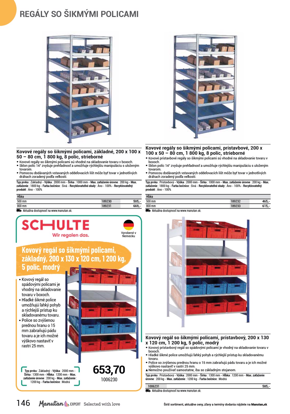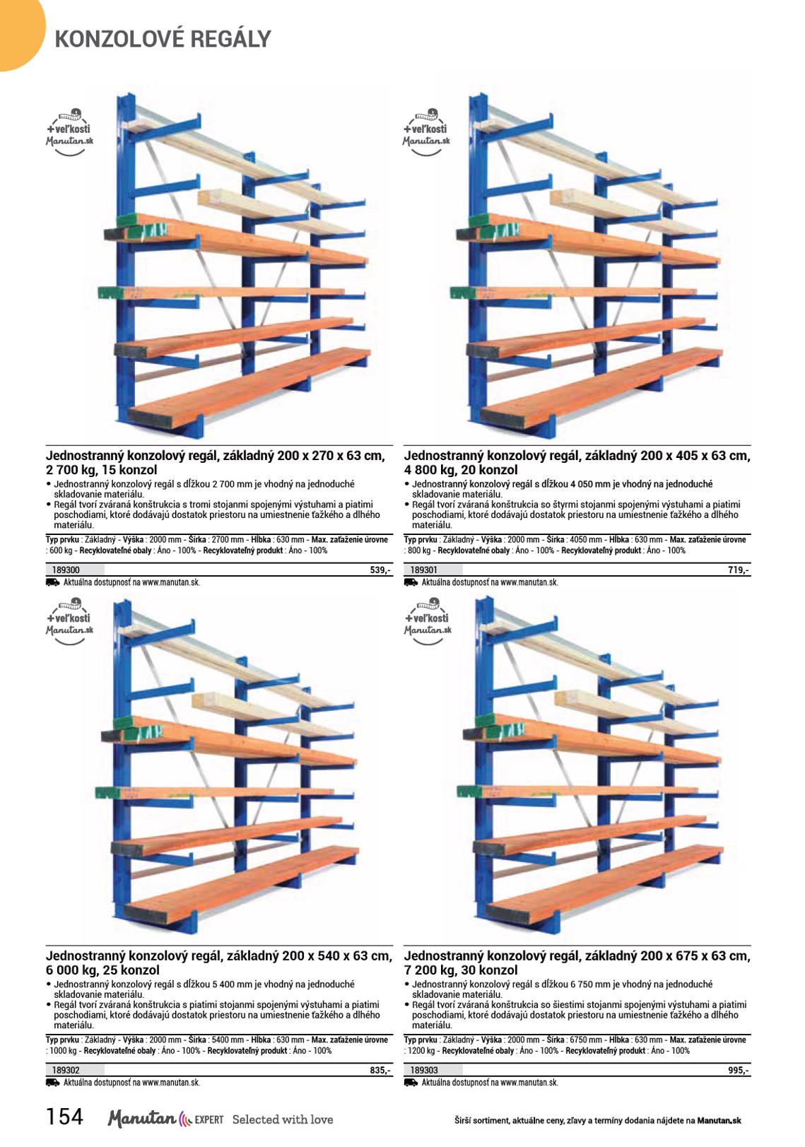 REGÁLY NA PNEUMATIKY 600 kg 150 kg 750 kg 150 kg Regály na pneumatiky, základné, 250 x 100 – 150 x 40 cm, 4 poschodia • Kovové regály s povrchovou úpravou pozinkovaním sú vhodné na skladovanie automobilových pneumatík s priemerom od 550 do 650 mm. • Výhodou regála na pneu je jeho bezproblémová a rýchla montáž bez použitia spojovacieho materiálu a náradia. • Špeciálny povrch priečok bráni poškodeniu pneumatík. Typ prvku : Základný - Počet úrovní : 4 - Výška : 2500 mm - Hĺbka : 400 mm - Max. zaťaženie úrovne : 150 kg Šírka 1000 mm 1300 mm 1500 mm Aktuálna dostupnosť na www.manutan.sk. 1006179 1006180 1006181 209,- 225,- 239,10 Regály na pneumatiky, základné, 300 x 100 – 150 x 40 cm, 5 poschodí • Kovové regály s povrchovou úpravou pozinkovaním sú vhodné na skladovanie automobilových pneumatík s priemerom od 550 do 650 mm. • Výhodou regála na pneu je jeho bezproblémová a rýchla montáž bez použitia spojovacieho materiálu a náradia. • Špeciálny povrch priečok bráni poškodeniu pneumatík. Typ prvku : Základný - Počet úrovní : 5 - Výška : 3000 mm - Hĺbka : 400 mm - Max. zaťaženie úrovne : 150 kg Šírka 1000 mm 1300 mm 1500 mm Aktuálna dostupnosť na www.manutan.sk. 1006182 1006183 1006184 250,- 269,10 279,- 600 kg 150 kg 750 kg 150 kg Regály na pneumatiky, prístavbové, 250 x 100 – 150 x 40 cm, 4 poschodia • Kovové prístavbové regály s povrchovou úpravou pozinkovaním sú vhodné na skladovanie automobilových pneumatík s priemerom od 550 do 650 mm. • Výhodou regála na pneu je jeho bezproblémová a rýchla montáž bez použitia spojovacieho materiálu a náradia. • Špeciálny povrch priečok bráni poškodeniu pneumatík. Typ prvku : Prístavbový - Počet úrovní : 4 - Výška : 2500 mm - Hĺbka : 400 mm - Max. zaťaženie úrovne : 150 kg Šírka 1000 mm 1300 mm 1500 mm Aktuálna dostupnosť na www.manutan.sk. 1006188 1006189 1006190 144,50 158,50 165,30 Regály na pneumatiky, prístavbové, 300 x 100 – 150 x 40 cm, 5 poschodí • Kovové prístavbové regály s povrchovou úpravou pozinkovaním sú vhodné na skladovanie automobilových pneumatík s priemerom od 550 do 650 mm. • Výhodou regála na pneu je jeho bezproblémová a rýchla montáž bez použitia spojovacieho materiálu a náradia. • Špeciálny povrch priečok bráni poškodeniu pneumatík. Typ prvku : Prístavbový - Počet úrovní : 5 - Výška : 3000 mm - Hĺbka : 400 mm - Max. zaťaženie úrovne : 150 kg Šírka 1000 mm 1300 mm 1500 mm Aktuálna dostupnosť na www.manutan.sk. 1006191 1006192 1006193 174,90 189,10 205,- 151