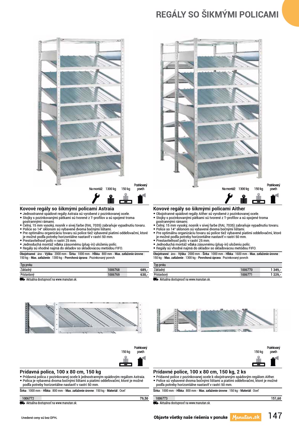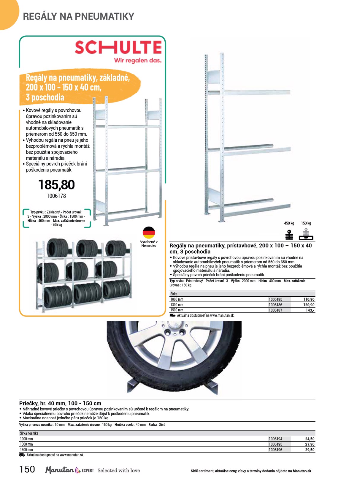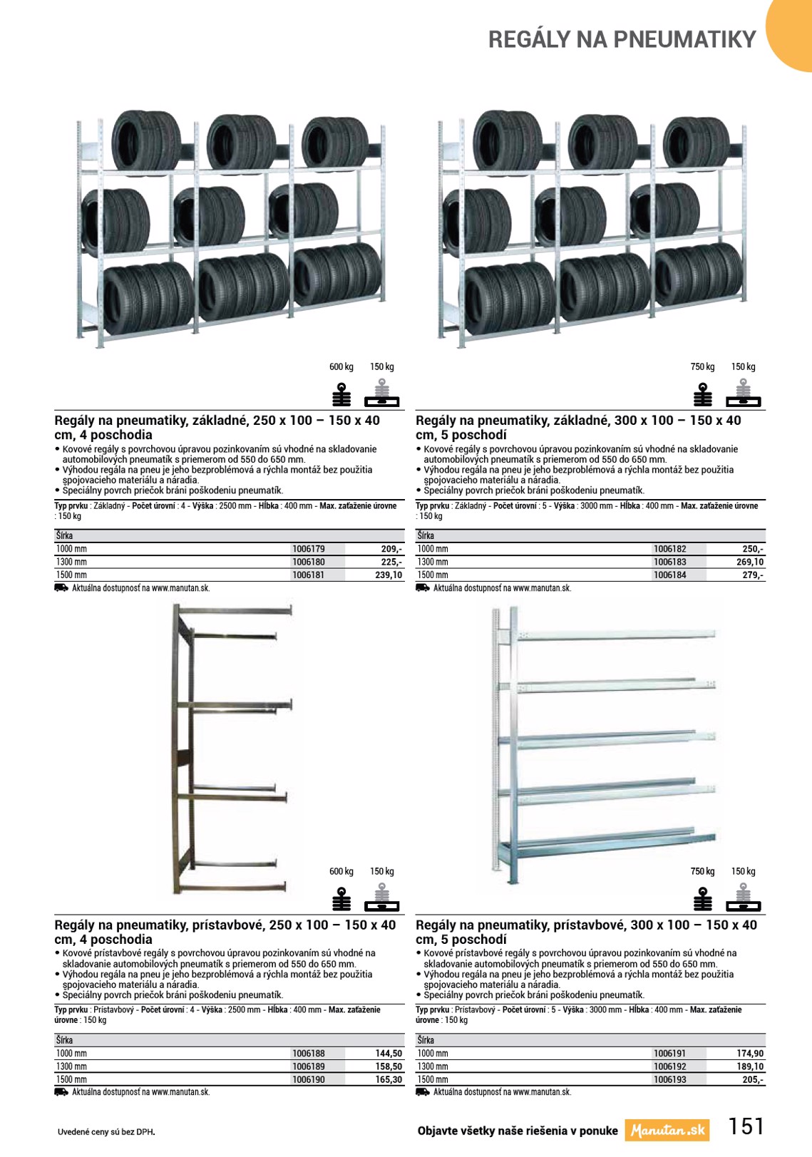 REGÁLY NA PNEUMATIKY Regály na pneumatiky, základné, 200 x 100 – 150 x 40 cm, 3 poschodia • Kovové regály s povrchovou úpravou pozinkovaním sú vhodné na skladovanie automobilových pneumatík s priemerom od 550 do 650 mm. • Výhodou regála na pneu je jeho bezproblémová a rýchla montáž bez použitia spojovacieho materiálu a náradia. • Špeciálny povrch priečok bráni poškodeniu pneumatík. 185,80 1006178 Typ prvku : Základný - Počet úrovní : 3 - Výška : 2000 mm - Šírka : 1500 mm - Hĺbka : 400 mm - Max. zaťaženie úrovne : 150 kg 450 kg 150 kg Vyrobené v Nemecku Regály na pneumatiky, prístavbové, 200 x 100 – 150 x 40 cm, 3 poschodia • Kovové prístavbové regály s povrchovou úpravou pozinkovaním sú vhodné na skladovanie automobilových pneumatík s priemerom od 550 do 650 mm. • Výhodou regála na pneu je jeho bezproblémová a rýchla montáž bez použitia spojovacieho materiálu a náradia. • Špeciálny povrch priečok bráni poškodeniu pneumatík. Typ prvku : Prístavbový - Počet úrovní : 3 - Výška : 2000 mm - Hĺbka : 400 mm - Max. zaťaženie úrovne : 150 kg Šírka 1000 mm 1300 mm 1500 mm Aktuálna dostupnosť na www.manutan.sk. 1006185 1006186 1006187 110,90 120,90 143,- Priečky, hr. 40 mm, 100 - 150 cm • Náhradné kovové priečky s povrchovou úpravou pozinkovaním sú určené k regálom na pneumatiky. • Vďaka špeciálnemu povrchu priečok nemôže dôjsť k poškodeniu pneumatík. • Maximálna nosnosť jedného páru priečok je 150 kg. Výška prierezu nosníka : 50 mm - Max. zaťaženie úrovne : 150 kg - Hrúbka ocele : 40 mm - Farba : Sivá Šírka nosníka 1000 mm 1300 mm 1500 mm Aktuálna dostupnosť na www.manutan.sk. 150 1006194 1006195 1006196 24,50 27,90 29,50