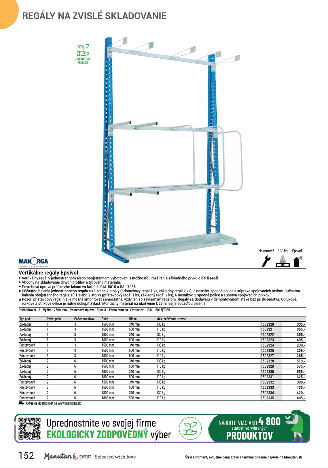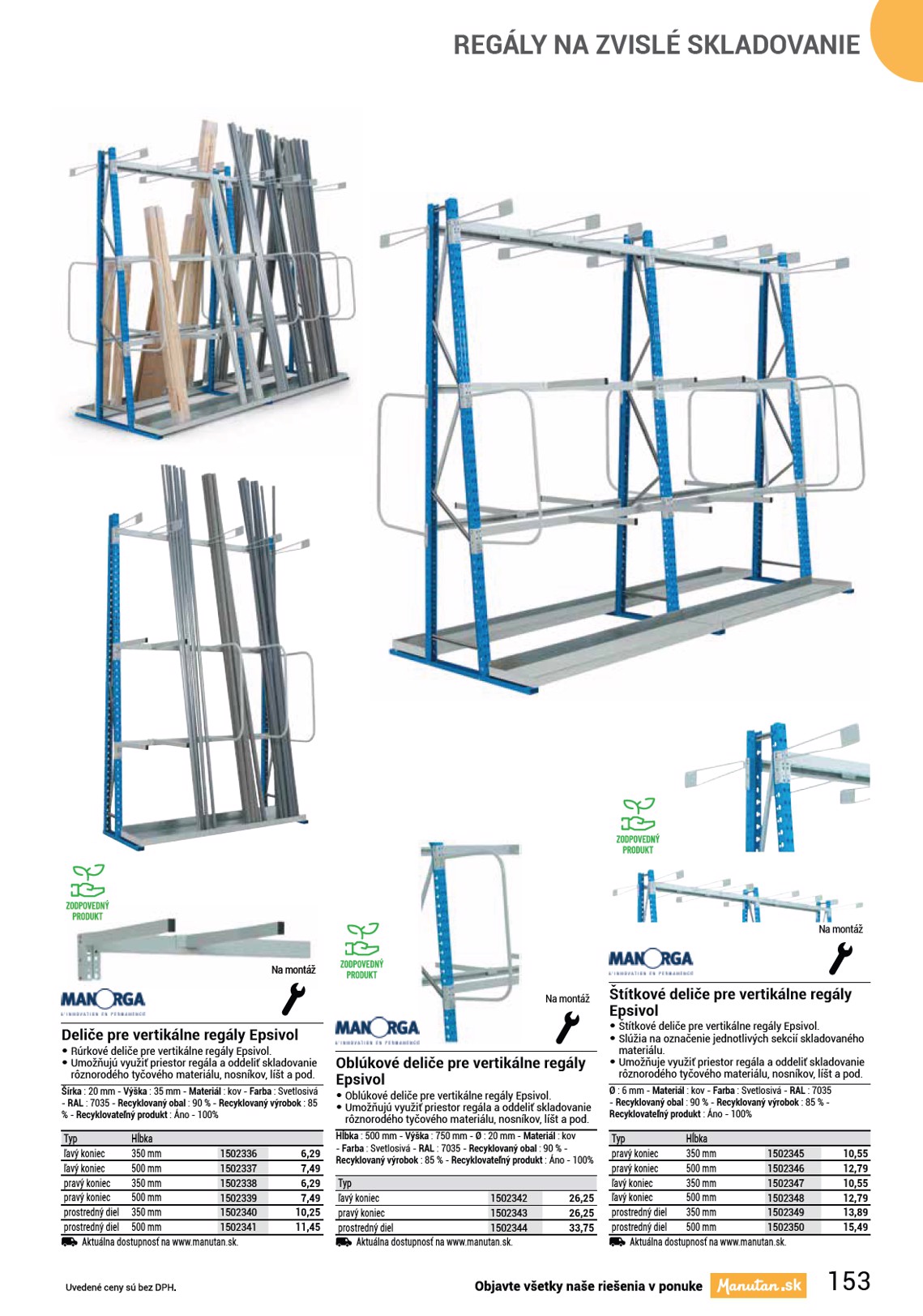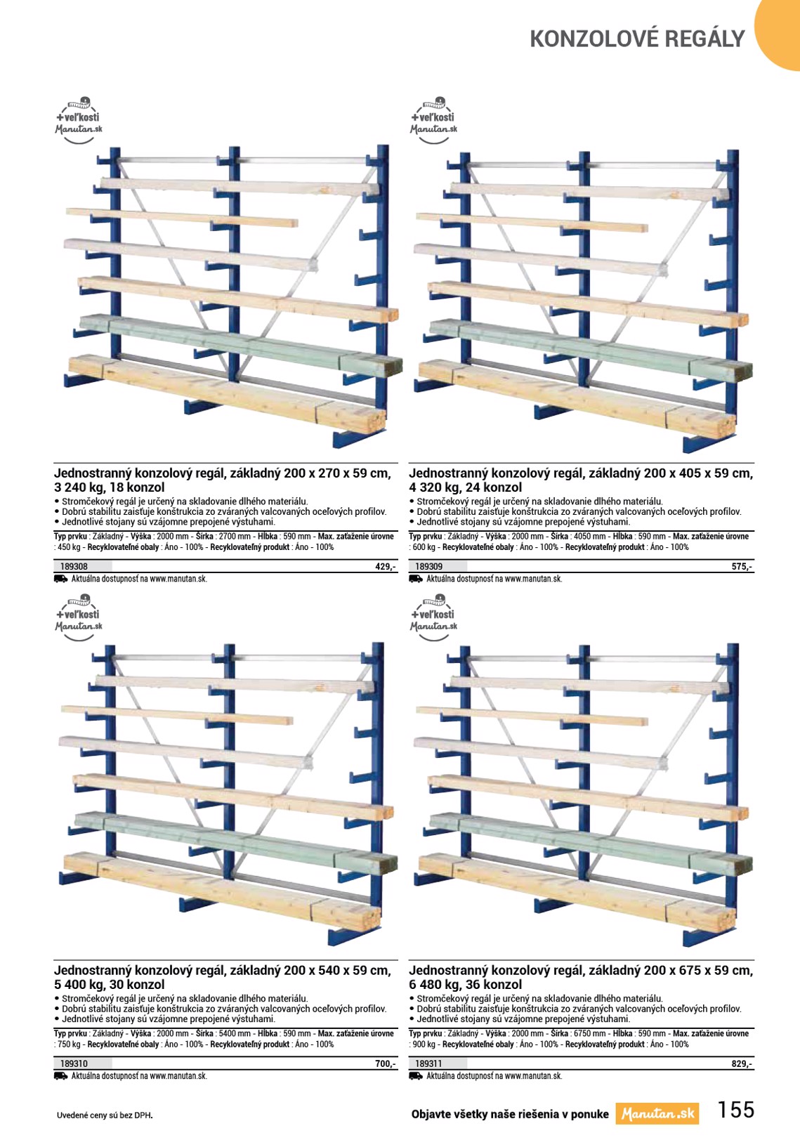 REGÁLY NA PNEUMATIKY Regály na pneumatiky, základné, 200 x 100 – 150 x 40 cm, 3 poschodia • Kovové regály s povrchovou úpravou pozinkovaním sú vhodné na skladovanie automobilových pneumatík s priemerom od 550 do 650 mm. • Výhodou regála na pneu je jeho bezproblémová a rýchla montáž bez použitia spojovacieho materiálu a náradia. • Špeciálny povrch priečok bráni poškodeniu pneumatík. 185,80 1006178 Typ prvku : Základný - Počet úrovní : 3 - Výška : 2000 mm - Šírka : 1500 mm - Hĺbka : 400 mm - Max. zaťaženie úrovne : 150 kg 450 kg 150 kg Vyrobené v Nemecku Regály na pneumatiky, prístavbové, 200 x 100 – 150 x 40 cm, 3 poschodia • Kovové prístavbové regály s povrchovou úpravou pozinkovaním sú vhodné na skladovanie automobilových pneumatík s priemerom od 550 do 650 mm. • Výhodou regála na pneu je jeho bezproblémová a rýchla montáž bez použitia spojovacieho materiálu a náradia. • Špeciálny povrch priečok bráni poškodeniu pneumatík. Typ prvku : Prístavbový - Počet úrovní : 3 - Výška : 2000 mm - Hĺbka : 400 mm - Max. zaťaženie úrovne : 150 kg Šírka 1000 mm 1300 mm 1500 mm Aktuálna dostupnosť na www.manutan.sk. 1006185 1006186 1006187 110,90 120,90 143,- Priečky, hr. 40 mm, 100 - 150 cm • Náhradné kovové priečky s povrchovou úpravou pozinkovaním sú určené k regálom na pneumatiky. • Vďaka špeciálnemu povrchu priečok nemôže dôjsť k poškodeniu pneumatík. • Maximálna nosnosť jedného páru priečok je 150 kg. Výška prierezu nosníka : 50 mm - Max. zaťaženie úrovne : 150 kg - Hrúbka ocele : 40 mm - Farba : Sivá Šírka nosníka 1000 mm 1300 mm 1500 mm Aktuálna dostupnosť na www.manutan.sk. 150 1006194 1006195 1006196 24,50 27,90 29,50