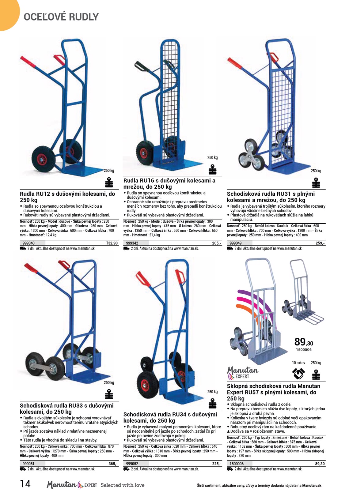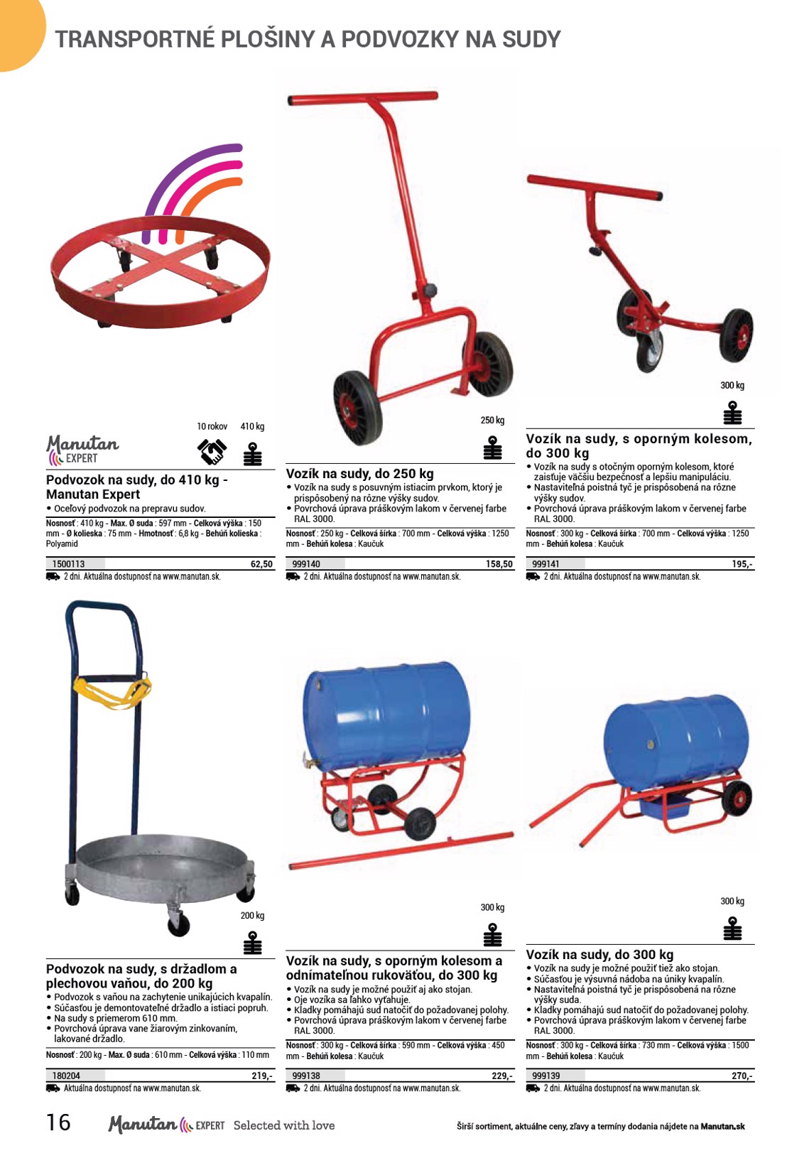 TRANSPORTNÉ PLOŠINY A PODVOZKY NA SUDY 300 kg 10 rokov 410 kg Podvozok na sudy, do 410 kg - Manutan Expert • Oceľový podvozok na prepravu sudov. Nosnosť : 410 kg - Max. Ø suda : 597 mm - Celková výška : 150 mm - Ø kolieska : 75 mm - Hmotnosť : 6,8 kg - Behúň kolieska : Polyamid 1500113 2 dni. Aktuálna dostupnosť na www.manutan.sk. 62,50 250 kg Vozík na sudy, do 250 kg • Vozík na sudy s posuvným istiacim prvkom, ktorý je prispôsobený na rôzne výšky sudov. • Povrchová úprava práškovým lakom v červenej farbe RAL 3000. Nosnosť : 250 kg - Celková šírka : 700 mm - Celková výška : 1250 mm - Behúň kolesa : Kaučuk 999140 2 dni. Aktuálna dostupnosť na www.manutan.sk. 158,50 Vozík na sudy, s oporným kolesom, do 300 kg • Vozík na sudy s otočným oporným kolesom, ktoré zaisťuje väčšiu bezpečnosť a lepšiu manipuláciu. • Nastaviteľná poistná tyč je prispôsobená na rôzne výšky sudov. • Povrchová úprava práškovým lakom v červenej farbe RAL 3000. Nosnosť : 300 kg - Celková šírka : 700 mm - Celková výška : 1250 mm - Behúň kolesa : Kaučuk 999141 2 dni. Aktuálna dostupnosť na www.manutan.sk. 195,- 200 kg 300 kg 300 kg Podvozok na sudy, s držadlom a plechovou vaňou, do 200 kg • Podvozok s vaňou na zachytenie unikajúcich kvapalín. • Súčasťou je demontovateľné držadlo a istiaci popruh. • Na sudy s priemerom 610 mm. • Povrchová úprava vane žiarovým zinkovaním, lakované držadlo. Nosnosť : 200 kg - Max. Ø suda : 610 mm - Celková výška : 110 mm 180204 Aktuálna dostupnosť na www.manutan.sk. 219,- Vozík na sudy, s oporným kolesom a odnímateľnou rukoväťou, do 300 kg • Vozík na sudy je možné použiť aj ako stojan. • Oje vozíka sa ľahko vyťahuje. • Kladky pomáhajú sud natočiť do požadovanej polohy. • Povrchová úprava práškovým lakom v červenej farbe RAL 3000. Nosnosť : 300 kg - Celková šírka : 590 mm - Celková výška : 450 mm - Behúň kolesa : Kaučuk 999138 2 dni. Aktuálna dostupnosť na www.manutan.sk. 229,- Vozík na sudy, do 300 kg • Vozík na sudy je možné použiť tiež ako stojan. • Súčasťou je výsuvná nádoba na úniky kvapalín. • Nastaviteľná poistná tyč je prispôsobená na rôzne výšky suda. • Kladky pomáhajú sud natočiť do požadovanej polohy. • Povrchová úprava práškovým lakom v červenej farbe RAL 3000. Nosnosť : 300 kg - Celková šírka : 730 mm - Celková výška : 1500 mm - Behúň kolesa : Kaučuk 999139 2 dni. Aktuálna dostupnosť na www.manutan.sk. 270,- 16