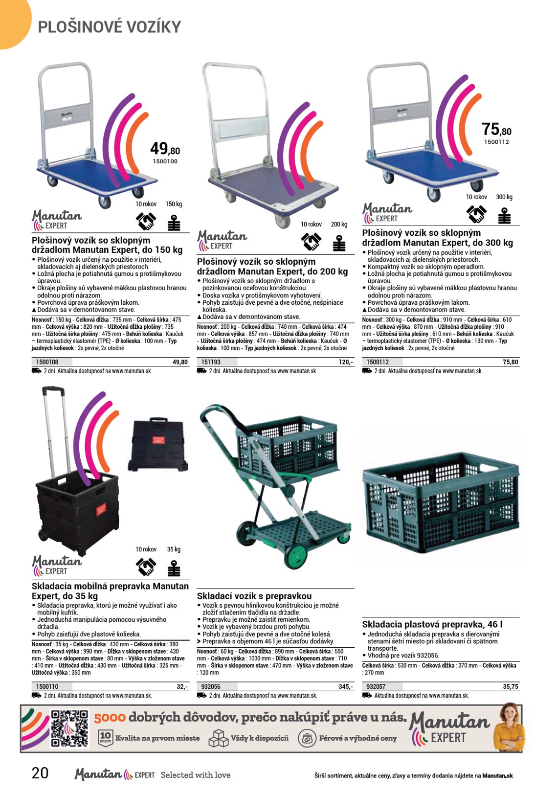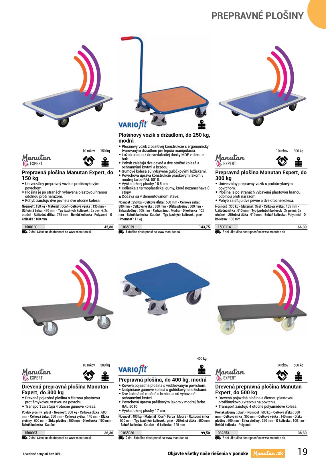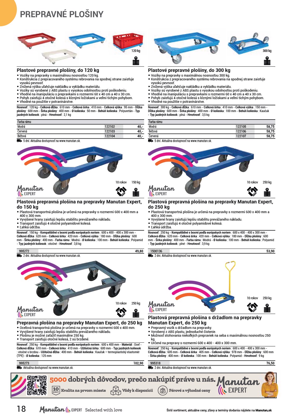 TRANSPORTNÉ PLOŠINY, VOZÍKY A SÚPRAVY 2500 kg 6000 kg Zdvíhacia tyč na transportné plošiny, 2,15 m • Oceľová tyč slúži na nadvihnutie bremena, pod ktoré sa následne podsunie transportná plošina. • Povrchová úprava práškovým lakom. Nosnosť : 1500 kg - Výška zdvihu : 140 mm - Celková dĺžka : 2150 mm - Hmotnosť : 16,5 kg 1500109 Aktuálna dostupnosť na www.manutan.sk. 106,10 Transportná plošina MA25, do 2 500 kg • Sťahovacia plošina slúži na presun a transport ťažkých strojov a predmetov. • Kvalitné nylonové kolieska chránia podlahu pred poškodením. • Plošina je vybavená držadlom pre jednoduchšiu manipuláciu. • Gumový protišmykový povrch napomáha stabilite pri transporte predmetu. • Oceľová konštrukcia lakovaná práškovou modrou farbou RAL 5017. Nosnosť : 2500 kg - Celková dĺžka : 210 mm - Celková šírka : 100 mm - Celková výška : 105 mm - Šírka plošiny : 88 mm - Dĺžka plošiny : 220 mm - Materiál kolies : Nylon - Ø kolesa : 85 mm - Počet koliesok : 2 - Počet náprav : 2 - Hmotnosť : 4 kg Transportná plošina MA60, do 6 000 kg • Prepravná plošina na transport strojov a zariadení. • Kvalitné nylonové kolieska chránia podlahu pred poškodením. • Plošina je vybavená držadlom pre jednoduchšiu manipuláciu. • Gumový protišmykový povrch napomáha stabilite pri transporte predmetu. • Oceľová konštrukcia lakovaná práškovou modrou farbou RAL 5017. Nosnosť : 6000 kg - Celková dĺžka : 260 mm - Celková šírka : 230 mm - Celková výška : 105 mm - Šírka plošiny : 188 mm - Dĺžka plošiny : 262 mm - Materiál kolies : Nylon - Ø kolesa : 85 mm - Počet koliesok : 6 - Počet náprav : 3 - Hmotnosť : 12 kg 1133239 2 dni. Aktuálna dostupnosť na www.manutan.sk. 60,75 1133241 2 dni. Aktuálna dostupnosť na www.manutan.sk. 126,75 111 ,50 1500117 60000 kg 10 rokov 600 kg 1800 kg Rohové transportné plošiny, do 600 kg • Štyri sťahovacie plošiny. • Každá plošina je vybavená tromi nešpiniacimi kolesami. • Nízka výška a protišmykový povrch plošín uľahčujú manipuláciu s bremenami. Nosnosť : 600 kg - Dĺžka : 265 mm - Šírka : 265 mm - Výška : 85 mm - Svetlá výška : 27 mm - Ø kolieska : 50 mm - Typ jazdných koliesok : otočné - Hmotnosť : 9,28 kg - Behúň kolieska : Polyamid - Materiál : oceľ 1500117 2 dni. Aktuálna dostupnosť na www.manutan.sk. 111,50 Transportná súprava, do 1 800 kg • Prepravná súprava s pákovým hydraulickým zdvíhacím mechanizmom na veľmi ťažké bremená. • Penová páska zabraňujúca poškodeniu prevážaného bremena. • Uviazanie a zabezpečenie bremena pomocou istiacej pásky, ktorá je súčasťou sady. • Pohyb zaisťujú 4 otočné kolesá z polyuretánu. Nosnosť : 1800 kg - Celková šírka : 420 mm - Celková výška : 1070 mm - Hmotnosť : 86 kg 1500118 Aktuálna dostupnosť na www.manutan.sk. 735,- Transportná súprava HS60, do 60 000 kg • Sťahovacia súprava na prepravu ťažkých bremien a strojov. • Gumový protišmykový povrch pre maximálnu bezpečnosť. • Odolné nylonové kolesá. • Praktický kufor na prenos a uskladnenie súpravy. OO Súprava obsahuje 4x vodiacu valčekovú dráhu, 2x pevnú plošinu, 2x otočnú plošinu, 2x rukoväť, 2x spojovací profil, háčik a kovový kufor. SS Maximálna povolená rýchlosť prepravy je 5 m/min. Polomer otáčania je min. 3 m. Nosnosť : 60000 kg - Hmotnosť : 92 kg 1501820 Aktuálna dostupnosť na www.manutan.sk. 825,- 17