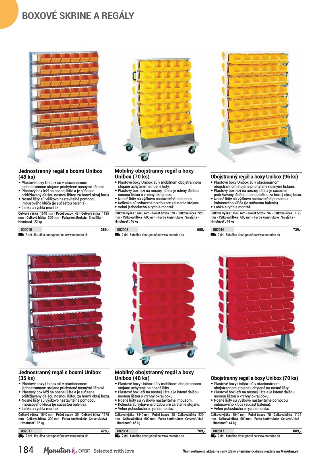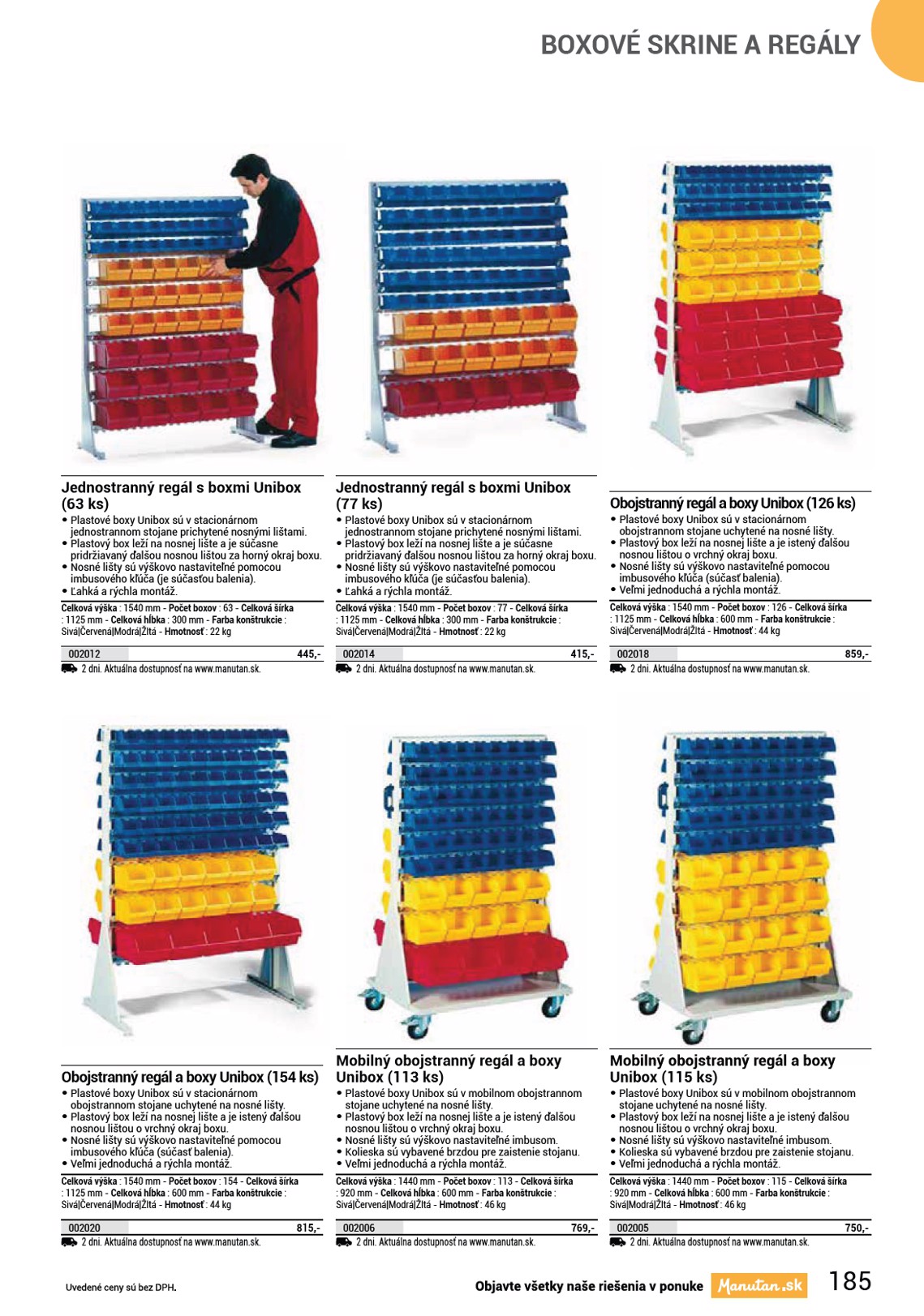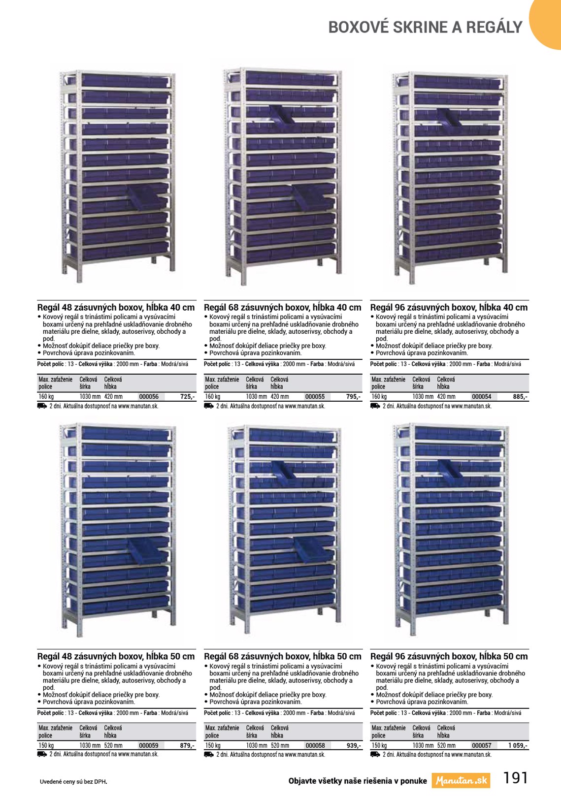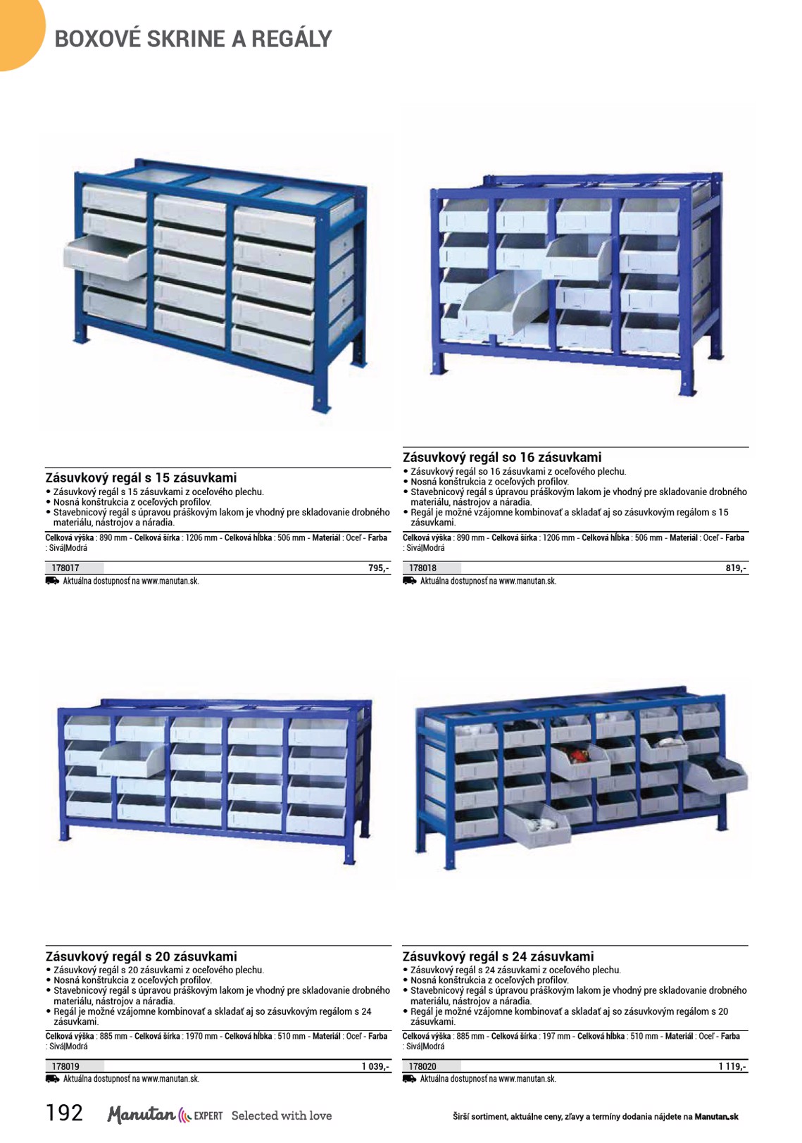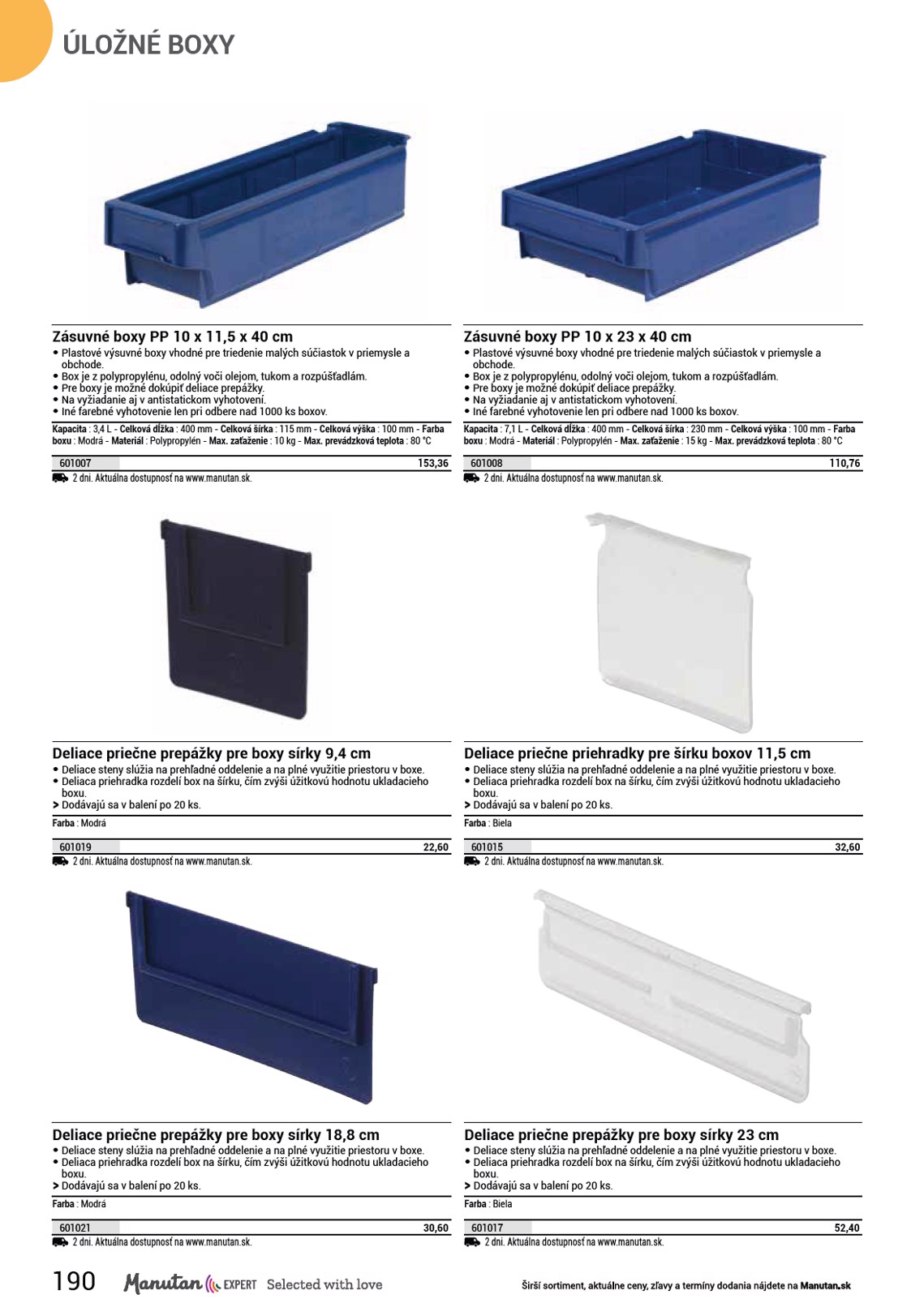 ÚLOŽNÉ BOXY Zásuvné boxy PP 10 x 11,5 x 30 cm • Plastové výsuvné boxy vhodné pre triedenie malých súčiastok v priemysle a obchode. • Box je z polypropylénu, odolný voči olejom, tukom a rozpúšťadlám. • Pre boxy je možné dokúpiť deliace prepážky. • Na vyžiadanie aj v antistatickom vyhotovení. • Iné farebné vyhotovenie len pri odbere nad 1000 ks boxov. Kapacita : 2,4 L - Celková dĺžka : 300 mm - Celková šírka : 115 mm - Celková výška : 100 mm - Farba boxu : Modrá - Materiál : Polypropylén - Max. zaťaženie : 8 kg - Max. prevádzková teplota : 80 °C 601003 2 dni. Aktuálna dostupnosť na www.manutan.sk. 168,64 Zásuvné boxy PP 10 x 11,5 x 50 cm • Plastové výsuvné boxy vhodné pre triedenie malých súčiastok v priemysle a obchode. • Box je z polypropylénu, odolný voči olejom, tukom a rozpúšťadlám. • Pre boxy je možné dokúpiť deliace prepážky. • Na vyžiadanie aj v antistatickom vyhotovení. • Iné farebné vyhotovenie len pri odbere nad 1000 ks boxov. Kapacita : 4,4 L - Celková dĺžka : 500 mm - Celková šírka : 115 mm - Celková výška : 100 mm - Farba boxu : Modrá - Materiál : Polypropylén - Max. zaťaženie : 10 kg - Max. prevádzková teplota : 80 °C 601011 2 dni. Aktuálna dostupnosť na www.manutan.sk. 154,- Zásuvné boxy PP 10 x 11,5 x 60 cm • Plastové výsuvné boxy vhodné pre triedenie malých súčiastok v priemysle a obchode. • Box je z polypropylénu, odolný voči olejom, tukom a rozpúšťadlám. • Pre boxy je možné dokúpiť deliace prepážky. • Na vyžiadanie aj v antistatickom vyhotovení. • Iné farebné vyhotovenie len pri odbere nad 1000 ks boxov. Kapacita : 5,2 L - Celková dĺžka : 600 mm - Celková šírka : 115 mm - Celková výška : 100 mm - Farba boxu : Modrá - Materiál : Polypropylén - Max. zaťaženie : 10 kg - Max. prevádzková teplota : 80 °C 601013 2 dni. Aktuálna dostupnosť na www.manutan.sk. 163,84 Zásuvné boxy PP 10 x 23 x 30 cm • Plastové výsuvné boxy vhodné pre triedenie malých súčiastok v priemysle a obchode. • Box je z polypropylénu, odolný voči olejom, tukom a rozpúšťadlám. • Pre boxy je možné dokúpiť deliace prepážky. • Na vyžiadanie aj v antistatickom vyhotovení. • Iné farebné vyhotovenie len pri odbere nad 1000 ks boxov. Kapacita : 4,9 L - Celková dĺžka : 300 mm - Celková šírka : 230 mm - Celková výška : 100 mm - Farba boxu : Modrá - Materiál : Polypropylén - Max. zaťaženie : 8 kg - Max. prevádzková teplota : 80 °C 601004 2 dni. Aktuálna dostupnosť na www.manutan.sk. 124,80 Zásuvné boxy PP 10 x 23 x 50 cm • Plastové výsuvné boxy vhodné pre triedenie malých súčiastok v priemysle a obchode. • Box je z polypropylénu, odolný voči olejom, tukom a rozpúšťadlám. • Pre boxy je možné dokúpiť deliace prepážky. • Na vyžiadanie aj v antistatickom vyhotovení. • Iné farebné vyhotovenie len pri odbere nad 1000 ks boxov. Kapacita : 8,7 L - Celková dĺžka : 500 mm - Celková šírka : 230 mm - Celková výška : 100 mm - Farba boxu : Modrá - Materiál : Polypropylén - Max. zaťaženie : 15 kg - Max. prevádzková teplota : 80 °C 601012 2 dni. Aktuálna dostupnosť na www.manutan.sk. 103,95 Zásuvné boxy PP 10 x 23 x 60 cm • Plastové výsuvné boxy vhodné pre triedenie malých súčiastok v priemysle a obchode. • Box je z polypropylénu, odolný voči olejom, tukom a rozpúšťadlám. • Pre boxy je možné dokúpiť deliace prepážky. • Na vyžiadanie aj v antistatickom vyhotovení. • Iné farebné vyhotovenie len pri odbere nad 1000 ks boxov. Kapacita : 10,2 L - Celková dĺžka : 600 mm - Celková šírka : 230 mm - Celková výška : 100 mm - Farba boxu : Modrá - Materiál : Polypropylén - Max. zaťaženie : 15 kg - Max. prevádzková teplota : 80 °C 601014 2 dni. Aktuálna dostupnosť na www.manutan.sk. 107,04 189