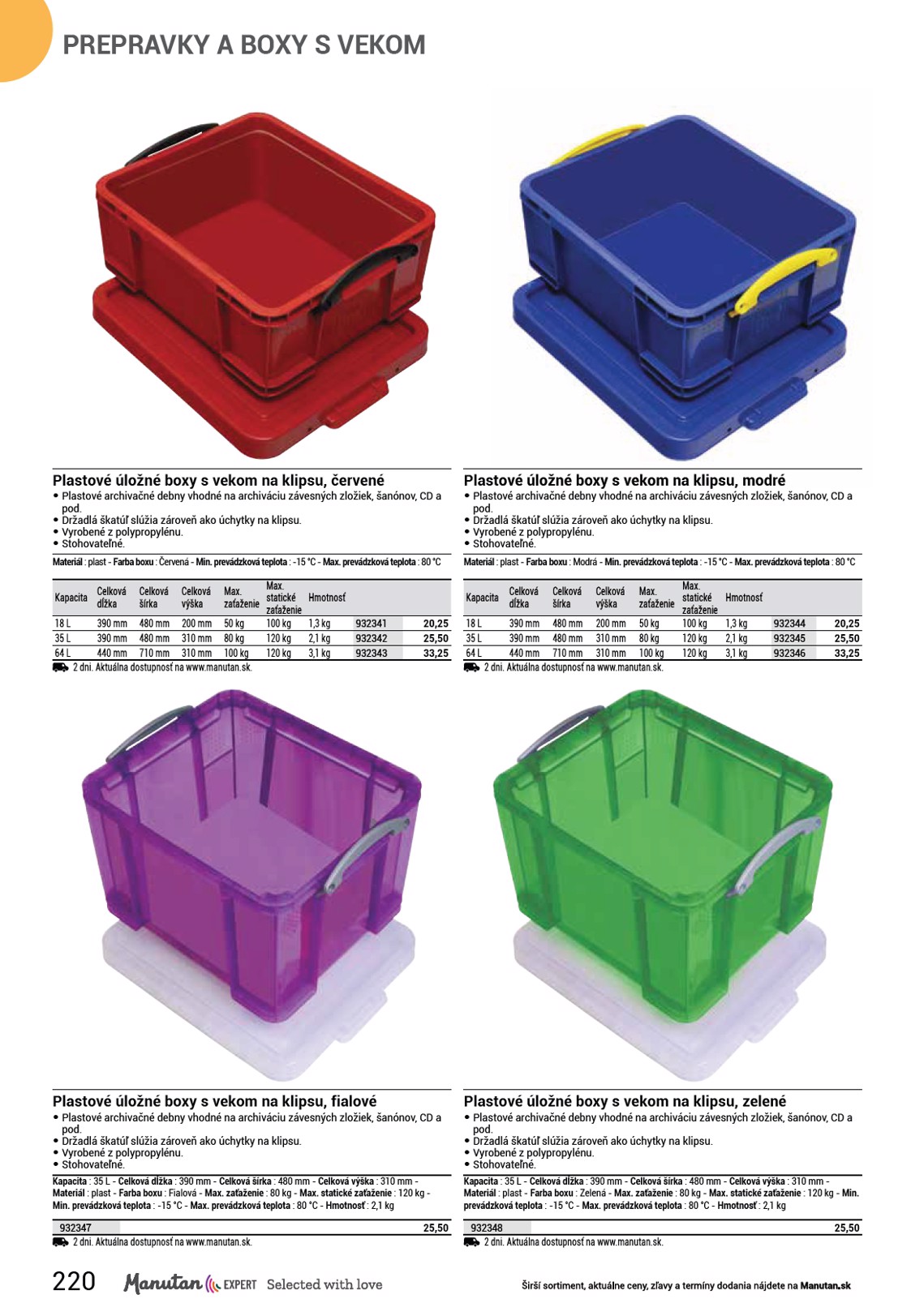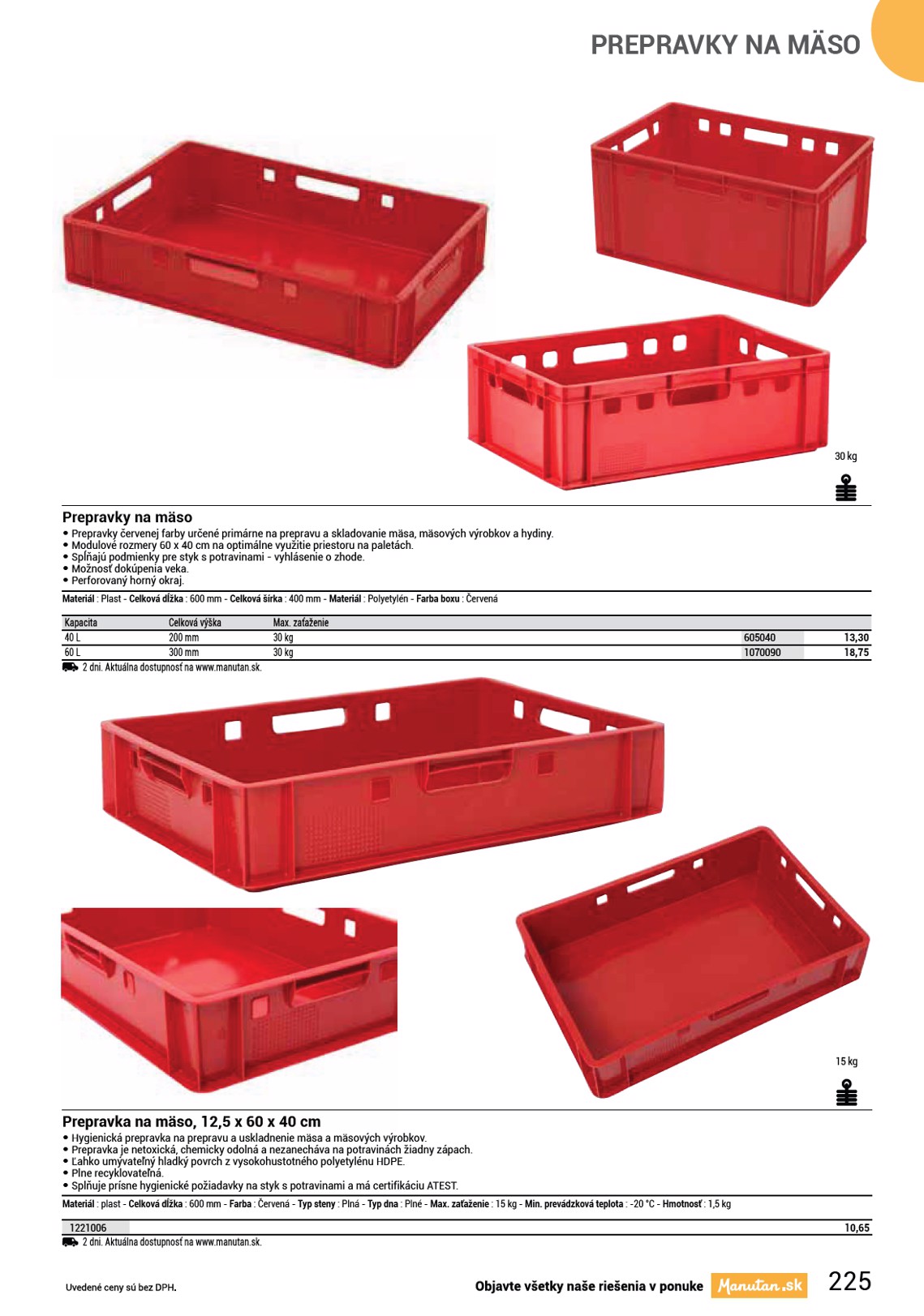 POTRAVINÁRSKE NÁDOBY 40 kg Skladovacie potravinárske boxy, zasúvacie • Multifunkčné plastové boxy vhodné predovšetkým na použitie v potravinárstve. • Vyrobené z polyetylénu s vysokou hustotou, vhodné na skladovanie v chlade. • Určené pre styk s potravinami. • Dodávajú sa v bielej farbe. • Možnosť dokúpenia veka. Materiál : plast - Farba : Biela - Min. prevádzková teplota : -20 °C Celková dĺžka 550 mm 630 mm 720 mm 2 dni. Aktuálna dostupnosť na www.manutan.sk. 840253 840254 840255 11,45 15,85 19,45 Potravinárske EURO prepravky, biele • Plastové potravinárske prepravky sú vhodné na prepravu mäsa a ďalších potravín, kde sa kladie dôraz na pevnosť. • Určené pre styk s potravinami (vyhlásenie o zhode, certifikát zdravotnej neškodnosti). • Dodávajú sa v bielej farbe. • Možnosť dokúpenia veka. Materiál : Plast - Celková dĺžka : 600 mm - Celková šírka : 400 mm - Na použitie v potravinárstve : áno - Materiál : Vysokohustotný polyetylén - Farba boxu : Biela Kapacita Celková výška Max. zaťaženie Max. statické zaťaženie 38 L 200 mm 35 kg 200 kg 55 L 300 mm 40 kg 350 kg 85 L 410 mm 40 kg 400 kg 2 dni. Aktuálna dostupnosť na www.manutan.sk. 894019 894017 894018 16,85 20,25 26,25 Úložný potravinársky box, 19 l • Multifunkčný ukladací box vhodný predovšetkým na skladovanie a prepravu potravín. • Vhodné do umývačiek i mraziacich boxov. • Možnosť popisov pre ľahkú kontrolu. • Vyrobené z polyetylénu. • Certifikácia NSF a HACCP. • Spĺňa podmienky pre styk s potravinami - vyhlásenie o zhode. Materiál : plast - Celková dĺžka : 457 mm - Farba : Biela - Recyklovateľné obaly : Áno - 100% Úložný potravinársky box, 62,9 l • Multifunkčný úložný box vhodný najmä pre skladovanie a prepravu potravín. • Možnosť používania v umývačke a v mrazničke. • Miesto pre etiketu na popis uloženého tovaru. • Vyrobené z polyetylénu. • Certifikované pre NSF a HACCP. • Spĺňa podmienky pre kontakt s potravinami - prehlásenie o zhode. Materiál : plast - Celková dĺžka : 457 mm - Farba : Biela - Recyklovateľné obaly : Áno - 100% 949228 22,50 949231 48,- 2 dni. Aktuálna dostupnosť na www.manutan.sk. 2 dni. Aktuálna dostupnosť na www.manutan.sk. Veko na potravinársku EURO prepravku, biele • Veko k potravinárskym europrepravkám. • Určené pre styk s potravinami (vyhlásenie o zhode, certifikát zdravotnej neškodnosti). • Prepravka je stohovateľná aj po použití veka. Farba : Biela - Dĺžka : 600 mm - Šírka : 400 mm - Hmotnosť : 0,64 kg 894016 2 dni. Aktuálna dostupnosť na www.manutan.sk. Veká pre skladovacie potravinárske boxy, zasúvacie • Veká k úložným potravinárskym boxom. • Vyrobené z polyetylénu s vysokou hustotou. • Vhodné na skladovanie v chlade. • Určené na styk s potravinami. Farba : Biela Dĺžka Šírka Hmotnosť 430 mm 550 mm 0,75 kg 840256 5,09 440 mm 630 mm 0,9 kg 840257 6,39 7,79 470 mm 720 mm 1,2 kg 840258 7,29 2 dni. Aktuálna dostupnosť na www.manutan.sk. 223
