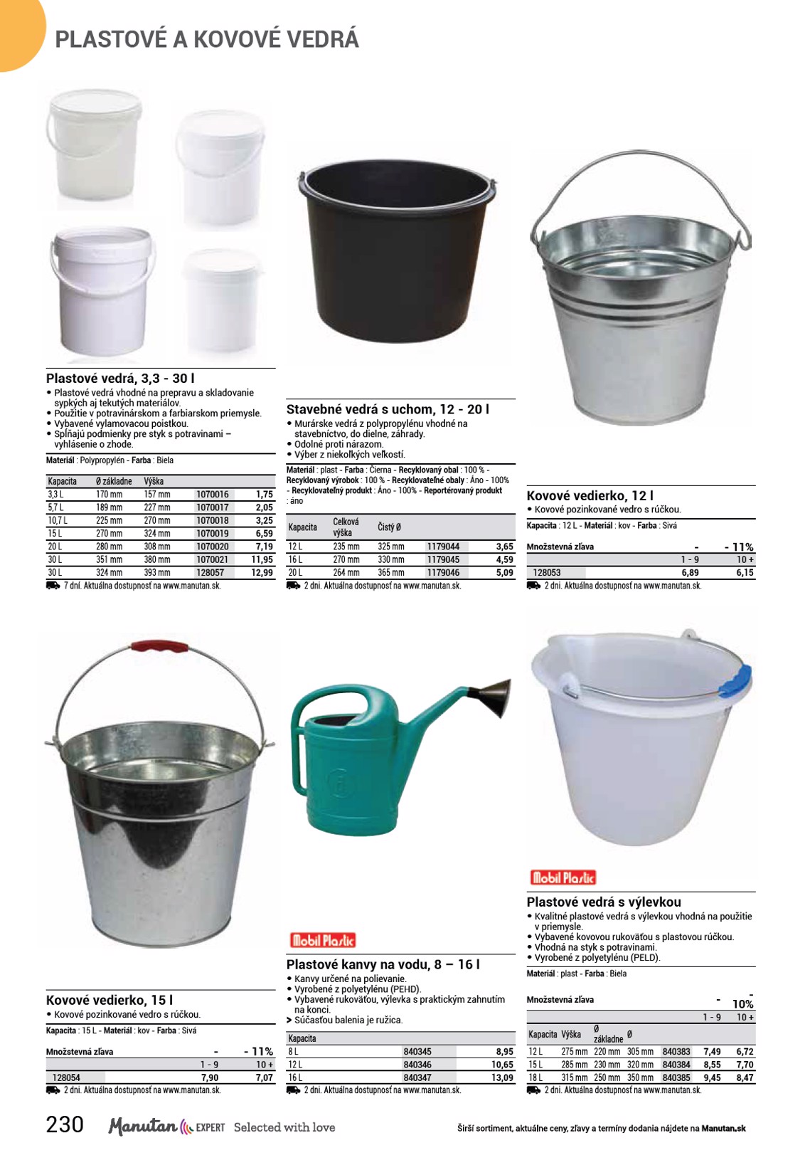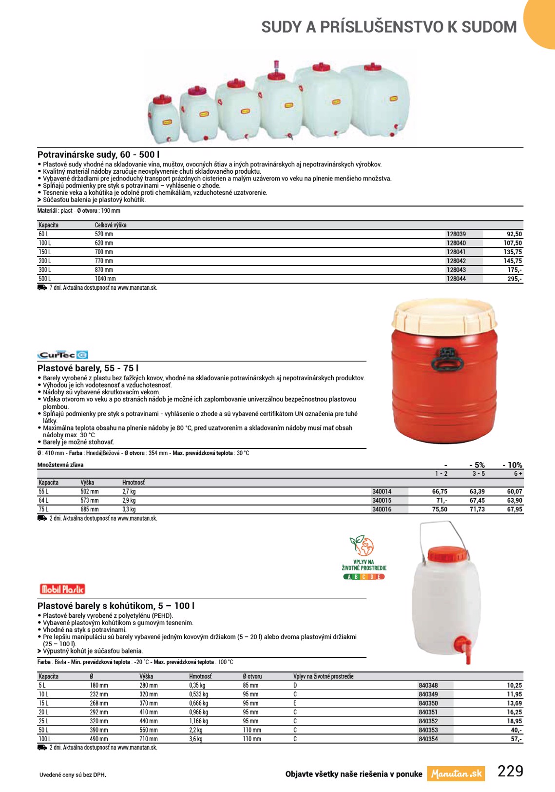 SUDY A PRÍSLUŠENSTVO K SUDOM Potravinárske sudy, 60 - 500 l • Plastové sudy vhodné na skladovanie vína, muštov, ovocných štiav a iných potravinárskych aj nepotravinárskych výrobkov. • Kvalitný materiál nádoby zaručuje neovplyvnenie chuti skladovaného produktu. • Vybavené držadlami pre jednoduchý transport prázdnych cisterien a malým uzáverom vo veku na plnenie menšieho množstva. • Spĺňajú podmienky pre styk s potravinami – vyhlásenie o zhode. • Tesnenie veka a kohútika je odolné proti chemikáliám, vzduchotesné uzatvorenie. OO Súčasťou balenia je plastový kohútik. Materiál : plast - Ø otvoru : 190 mm Kapacita Celková výška 60 L 520 mm 100 L 620 mm 150 L 700 mm 200 L 770 mm 300 L 870 mm 500 L 1040 mm 7 dní. Aktuálna dostupnosť na www.manutan.sk. 128039 128040 128041 128042 128043 128044 92,50 107,50 135,75 145,75 175,- 295,- Plastové barely, 55 - 75 l • Barely vyrobené z plastu bez ťažkých kovov, vhodné na skladovanie potravinárskych aj nepotravinárskych produktov. • Výhodou je ich vodotesnosť a vzduchotesnosť. • Nádoby sú vybavené skrutkovacím vekom. • Vďaka otvorom vo veku a po stranách nádob je možné ich zaplombovanie univerzálnou bezpečnostnou plastovou plombou. • Spĺňajú podmienky pre styk s potravinami - vyhlásenie o zhode a sú vybavené certifikátom UN označenia pre tuhé látky. • Maximálna teplota obsahu na plnenie nádoby je 80 °C, pred uzatvorením a skladovaním nádoby musí mať obsah nádoby max. 30 °C. • Barely je možné stohovať. Ø : 410 mm - Farba : Hnedá|Béžová - Ø otvoru : 354 mm - Max. prevádzková teplota : 30 °C Množstevná zľava Kapacita Výška Hmotnosť 55 L 502 mm 2,7 kg 64 L 573 mm 2,9 kg 75 L 685 mm 3,3 kg 2 dni. Aktuálna dostupnosť na www.manutan.sk. 340014 340015 340016 - 1 - 2 66,75 71,- 75,50 - 5% 3 - 5 63,39 67,45 71,73 - 10% 6 + 60,07 63,90 67,95 Plastové barely s kohútikom, 5 – 100 l • Plastové barely vyrobené z polyetylénu (PEHD). • Vybavené plastovým kohútikom s gumovým tesnením. • Vhodné na styk s potravinami. • Pre lepšiu manipuláciu sú barely vybavené jedným kovovým držiakom (5 – 20 l) alebo dvoma plastovými držiakmi (25 – 100 l). OO Výpustný kohút je súčasťou balenia. Farba : Biela - Min. prevádzková teplota : -20 °C - Max. prevádzková teplota : 100 °C Kapacita Ø Výška 5 L 180 mm 280 mm 10 L 232 mm 320 mm 15 L 268 mm 370 mm 20 L 292 mm 410 mm 25 L 320 mm 440 mm 50 L 390 mm 560 mm 100 L 490 mm 710 mm 2 dni. Aktuálna dostupnosť na www.manutan.sk. Hmotnosť 0,35 kg 0,533 kg 0,666 kg 0,966 kg 1,166 kg 2,2 kg 3,6 kg Ø otvoru 85 mm 95 mm 95 mm 95 mm 95 mm 110 mm 110 mm Vplyv na životné prostredie D C E C C C C 840348 840349 840350 840351 840352 840353 840354 10,25 11,95 13,69 16,25 18,95 40,- 57,- 229