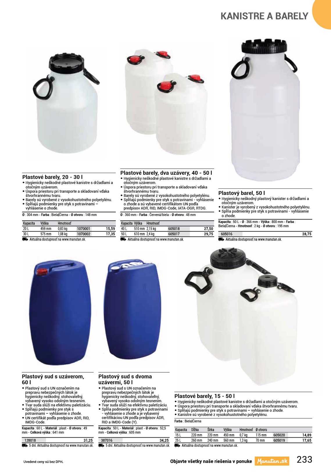 SUDY A PRÍSLUŠENSTVO K SUDOM Plastové dózy, 0,25 - 2 l • Plastové nádoby ideálne na skladovanie sypkých materiálov alebo pastovitých hmôt v potravinárskom, farmaceutickom, chemickom či drogistickom priemysle. • UN certifikácia umožňuje plnenie i nebezpečných látok. Ø : 80 mm - Dĺžka : 80 mm - Ø otvoru : 80 mm - Farba : Červená/biela Množstevná zľava Kapacita Šírka Výška 0,25 L 99 mm 70 mm 0,5 L 99 mm 103 mm 0,65 L 99 mm 128 mm 0,78 L 99 mm 141 mm 1 L 99 mm 166 mm 1,3 L 99 mm 183 mm 1,6 L 103 mm 212 mm 2 L 99 mm 227 mm 7 dní. Aktuálna dostupnosť na www.manutan.sk. 128058 128059 128060 128061 128062 128063 128064 128065 - - 6% - 12% 1 - 4 5 - 9 10 + 2,05 1,93 1,81 2,15 2,04 1,92 2,35 2,18 2,06 2,45 2,28 2,17 2,45 2,28 2,17 2,75 2,58 2,46 2,75 2,58 2,47 3,45 3,23 3,07 Plastové sudy, 3,6 - 26 l • Barely vyrobené z plastu bez ťažkých kovov, vhodné na skladovanie potravinárskych aj nepotravinárskych produktov. • Výhodou plastových sudov je vodotesnosť a vzduchotesnosť. • Nádoby sú vybavené skrutkovacím vekom. • Vďaka otvorom vo veku a po stranách nádob je možné ich zaplombovanie univerzálnou bezpečnostnou plastovou plombou. • Barely je možné stohovať. • Spĺňajú podmienky pre styk s potravinami – vyhlásenie o zhode. • Certifikát UN pre tuhé látky X. • Maximálna teplota obsahu na plnenie nádoby je 80 °C, pred uzatvorením a skladovaním nádoby musí mať obsah nádoby max. 30 °C. Materiál : plast Množstevná zľava Kapacita Ø otvoru Čistý Ø Celková výška 3,6 L 136 mm 198 mm 175 mm 340001 6 L 136 mm 198 mm 266 mm 340002 10 L 204 mm 274 mm 239 mm 340003 15 L 204 mm 274 mm 328 mm 340004 20 L 204 mm 274 mm 418 mm 340005 26 L 204 mm 316 mm 424 mm 340006 2 dni. Aktuálna dostupnosť na www.manutan.sk. - - 5% - 10% 1 - 2 3 - 5 6 + 13,99 17,35 27,75 31,90 34,25 39,75 13,26 16,44 26,36 30,27 32,49 37,74 12,58 15,58 24,97 28,69 30,78 35,77 Plastové barely, 42 - 68 l • Barely s držadlami sú vyrobené z plastu bez ťažkých kovov. • Vhodné na skladovanie potravinárskych aj nepotravinárskych produktov. • Výhodou plastových sudov je vodotesnosť a vzduchotesnosť. • Nádoby sú vybavené skrutkovacím vekom. • Vďaka otvorom vo veku a po stranách nádob je možné ich zaplombovanie univerzálnou bezpečnostnou plastovou plombou. • Spĺňajú podmienky pre styk s potravinami - vyhlásenie o zhode a sú vybavené certifikátom UN označenia pre tuhé látky (X). • Maximálna teplota obsahu na plnenie nádoby je 80 °C, pred uzatvorením a skladovaním nádoby musí mať obsah nádoby max. 30 °C. • Barely je možné stohovať. Ø : 410 mm - Farba : Červená/biela - Ø otvoru : 282 mm - Max. prevádzková teplota : 30 °C Množstevná zľava Kapacita Výška Hmotnosť 42 L 415 mm 2,3 kg 340007 54 L 518 mm 2,5 kg 340008 68 L 632 mm 3 kg 340009 2 dni. Aktuálna dostupnosť na www.manutan.sk. - 1 - 2 52,90 58,75 61,25 - 5% 3 - 5 50,22 55,78 58,15 - 10% 6 + 47,59 52,86 55,09 Plastové sudy, 17 - 110 l • Barely vyrobené z plastu bez ťažkých kovov, vhodné na skladovanie potravinárskych aj nepotravinárskych produktov. • Ich výhodou je vodotesnosť a vzduchotesnosť. • Nádoby sú vybavené skrutkovacím vekom. • Vďaka otvorom vo veku a po stranách nádob je možné ich zaplombovanie univerzálnou bezpečnostnou plastovou plombou. • Spĺňajú podmienky pre styk s potravinami - vyhlásenie o zhode a sú vybavené certifikáciou UN. • Barely je možné stohovať. • Maximálna teplota obsahu na plnenie nádoby je 80 °C, pred uzatvorením a skladovaním nádoby musí mať obsah nádoby max. 30 °C. Materiál : plast Množstevná zľava Kapacita Ø otvoru Čistý Ø Celková výška 26 L 295 mm 338 mm 356 mm 34 L 295 mm 338 mm 450 mm 110 L 395 mm 455 mm 778 mm 2 dni. Aktuálna dostupnosť na www.manutan.sk. 340011 340012 340013 - - 5% - 10% 1-2 3-5 6 + 46,25 52,75 98,75 43,90 50,11 93,81 41,61 47,48 88,87 228