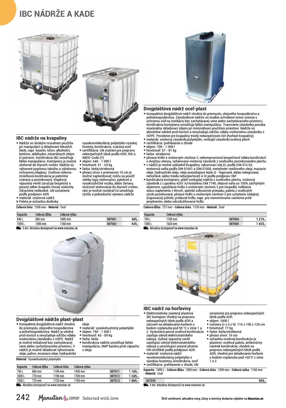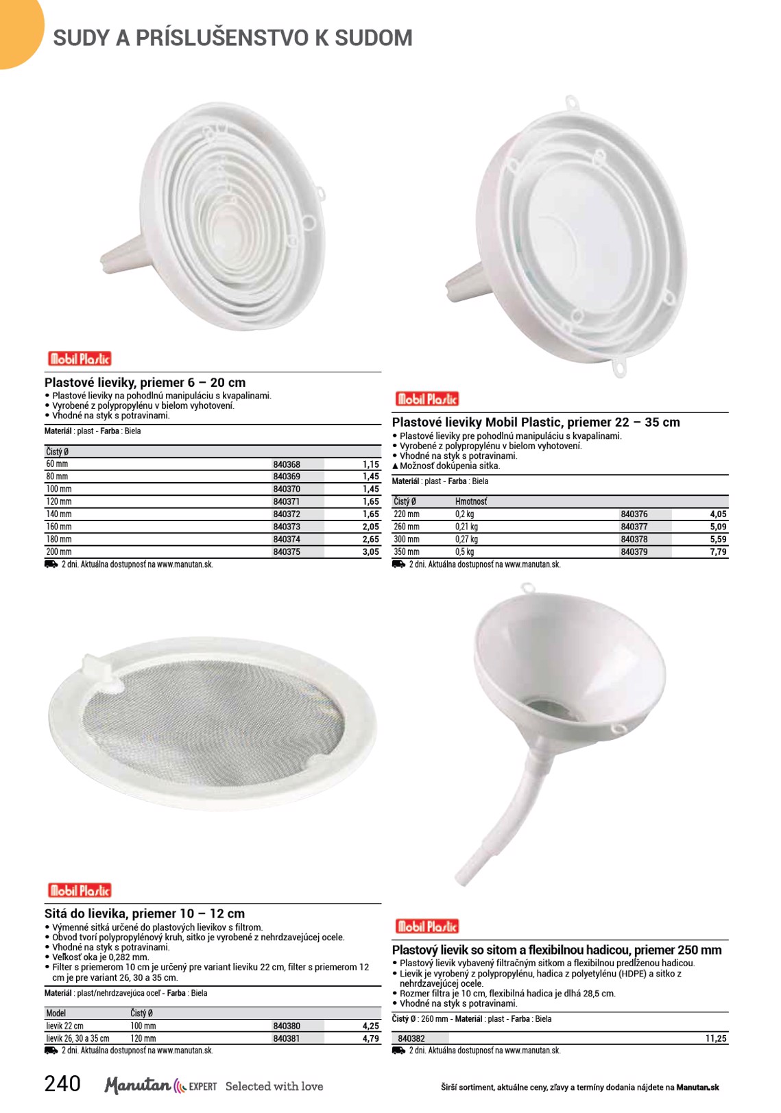 SUDY A PRÍSLUŠENSTVO K SUDOM Mosadzný čapovací kohút • Robustný samouzatvárací vypúšťací kohút odolný proti vykurovaciemu oleju a benzínu. • Vhodný na viskózne kvapaliny SAE 30. • Vybavený PTFE tesnením a 2" závitom. Materiál : kov - Závit : 2 palcov 270121 Aktuálna dostupnosť na www.manutan.sk. 192,75 Výpustný kohút samozatvárací, na petrolej • Samozatvárací vypúšťací kohút s uzáverom ovládaným pružinou. • Určené na sudy s 2" závitom. • Výpustný kohút s nitrilovým tesnením. • Vhodný na minerálne oleje. Materiál : hliník - Závit : 2 palcov 270117 Aktuálna dostupnosť na www.manutan.sk. 72,90 Výpustný kohút • Výpustný kohút zo sivej liatiny je vhodný na husté látky. • Určené na sudy s 2" závitom. • Kohút s mosadznou uzatváracou doštičkou a tesnením z PTFE. • Oválny vypúšťací otvor s rozmermi 40 x 45 mm. Materiál : kov - Závit : 2 palcov 270116 Aktuálna dostupnosť na www.manutan.sk. 127,90 Lievik so sitom, priemer 16 cm • Plastový lievik z HDPE zaisťuje pohodlnú manipuláciu s plechovkami na olej v priemysle a dielni. • Je odolný proti oleju, kyselinám i nafte. • Vysoký prepadový okraj zaručuje ochranu proti striekaniu kvapaliny. • Jeho súčasťou je bezpečné držadlo, vymeniteľné sito z mosadze, vzduchové drážky na odvzdušnenie a bezpečnostný výpust z polyetylénu. Čistý Ø : 160 mm - Materiál : plast - Hmotnosť : 0,12 kg - Farba : Oranžová 074082 9,35 2 dni. Aktuálna dostupnosť na www.manutan.sk. Pocínované lieviky • Pocínované lieviky zaisťujú pohodlnú manipuláciu s kvapalinami v priemysle a dielni. • Vysoký prepadový okraj chráni proti striekaniu. • Ich súčasťou je ergonomické a bezpečné držadlo, vymeniteľné sito z mosadze, vzduchové drážky na odvzdušnenie a bezpečnostný výpust z polyetylénu. Materiál : kov/plast - Farba : Oranžová/sivá Čistý Ø Hmotnosť 160 mm 0,25 kg 200 mm 0,43 kg 2 dni. Aktuálna dostupnosť na www.manutan.sk. 074075 074076 17,45 16,- Lievik s flexibilnou hadicou • Plastový lievik z HDPE zaisťuje pohodlnú manipuláciu s kvapalinami v priemysle a dielni. • Je odolný proti oleju, kyselinám i nafte. • Lievik je doplnený flexibilnou výlevkou v podobe PVC hadice, ktorú je možné oddeliť. • Pre ľahšiu manipuláciu má lievik pútko s integrovaným závesným okom. • Dĺžka výlevky je 33 cm, priemer je 1,7 cm. Čistý Ø : 150 mm - Materiál : plast - Hmotnosť : 0,11 kg - Farba : Čierna/oranžová 074085 5,79 2 dni. Aktuálna dostupnosť na www.manutan.sk. 239
