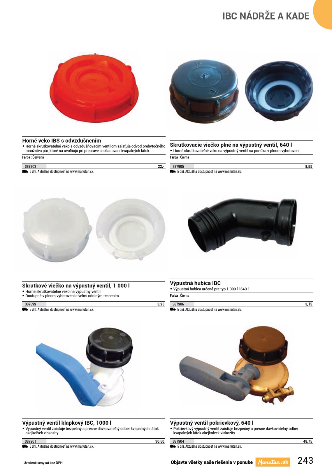 SUDY A PRÍSLUŠENSTVO K SUDOM Polyetylénový výpustný kohút, 4 ks • Polyetylénový výpustný kohút s veľkosťou závitu 3/4" na menej náročné použitie. • Vhodný na ropné látky a riedené kyseliny. 074009 2 dni. Aktuálna dostupnosť na www.manutan.sk. 17,08 Polyetylénový výpustný kohút • Polyetylénový výpustný kohút s veľkosťou závitu 2". • Vhodný na ropné látky a riedené kyseliny. 074010 2 dni. Aktuálna dostupnosť na www.manutan.sk. 24,75 Mosadzný výpustný kohút, na nekorozívne kvapaliny • Samozatvárací vypúšťací kohútik vhodný na nekorozívne kvapaliny. • Určené na sudy s 3/4" závitom. • Protiplameňový záver so závesným zariadením na stáčacie nádoby. • Výpustný kohút s PTFE tesnením. Materiál : kov - Závit : 3/4 palcov 270119 Aktuálna dostupnosť na www.manutan.sk. 54,75 Mosadzný výpustný kohút, na vykurovacie oleje a benzín • Mosadzný vypúšťací kohút je odolný proti vykurovaciemu oleju a benzínu. • Vybavený NBR tesnením a 3/4" závitom. Materiál : kov - Závit : 3/4 palcov 270120 Aktuálna dostupnosť na www.manutan.sk. 46,50 Výpustný kohút samouzatvárací • Robustný samouzatvárací výpustný kohút na jemné dávkovanie. • Vhodný na neutrálne až alkalické vodou riedené rozpúšťadlá a produkty z ropy. • Vybavený plastovým tesnením a protiplameňovým uzáverom. • Určené na sudy s 3/4" závitom. Materiál : kov - Závit : 3/4 palcov Mosadzný výpustný kohút, na agresívne kvapaliny • Mosadzný samozatvárací čapovací kohút vhodný na agresívne kvapaliny. • Vybavený PTFE tesnením a protiplameňovým uzáverom. • Určené na sudy s 3/4" závitom. Materiál : kov - Závit : 3/4 palcov 270122 Aktuálna dostupnosť na www.manutan.sk. 37,- 270123 Aktuálna dostupnosť na www.manutan.sk. 238 59,50