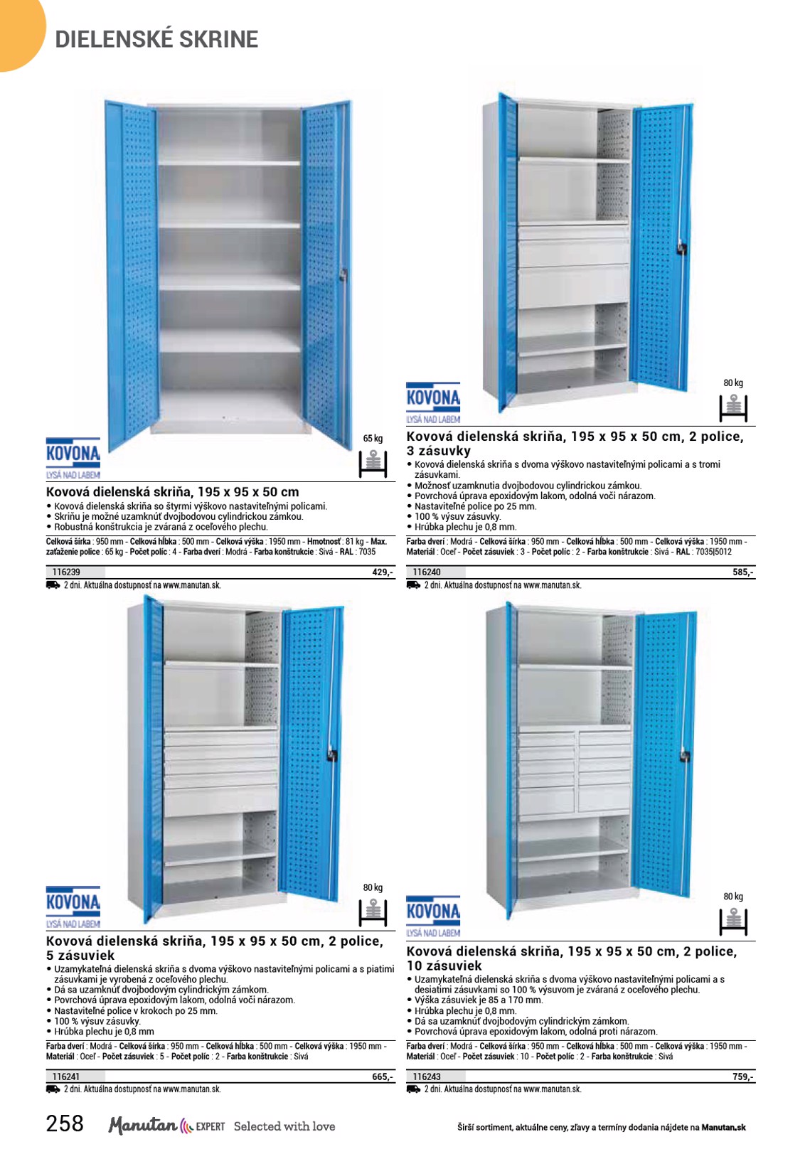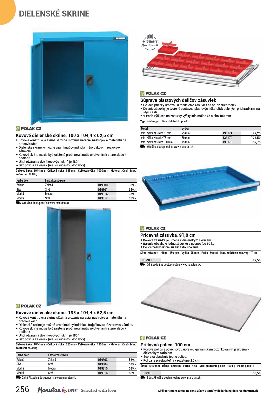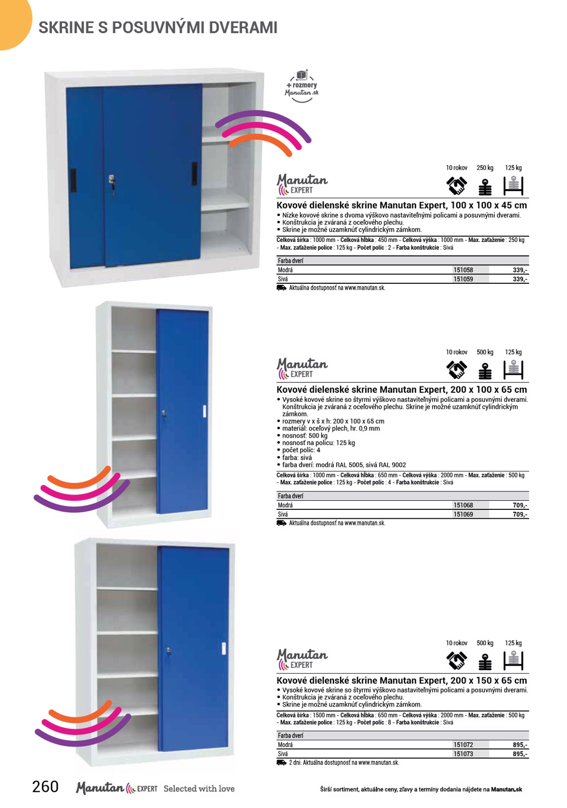 SKRINE S POSUVNÝMI DVERAMI 260 10 rokov 250 kg 125 kg Kovové dielenské skrine Manutan Expert, 100 x 100 x 45 cm • Nízke kovové skrine s dvoma výškovo nastaviteľnými policami a posuvnými dverami. • Konštrukcia je zváraná z oceľového plechu. • Skrine je možné uzamknúť cylindrickým zámkom. Celková šírka : 1000 mm - Celková hĺbka : 450 mm - Celková výška : 1000 mm - Max. zaťaženie : 250 kg - Max. zaťaženie police : 125 kg - Počet políc : 2 - Farba konštrukcie : Sivá Farba dverí Modrá Sivá Aktuálna dostupnosť na www.manutan.sk. 151058 151059 339,- 339,- 10 rokov 500 kg 125 kg Kovové dielenské skrine Manutan Expert, 200 x 100 x 65 cm • Vysoké kovové skrine so štyrmi výškovo nastaviteľnými policami a posuvnými dverami. Konštrukcia je zváraná z oceľového plechu. Skrine je možné uzamknúť cylindrickým zámkom. • rozmery v x š x h: 200 x 100 x 65 cm • materiál: oceľový plech, hr. 0,9 mm • nosnosť: 500 kg • nosnosť na policu: 125 kg • počet políc: 4 • farba: sivá • farba dverí: modrá RAL 5005, sivá RAL 9002 Celková šírka : 1000 mm - Celková hĺbka : 650 mm - Celková výška : 2000 mm - Max. zaťaženie : 500 kg - Max. zaťaženie police : 125 kg - Počet políc : 4 - Farba konštrukcie : Sivá Farba dverí Modrá Sivá Aktuálna dostupnosť na www.manutan.sk. 151068 151069 709,- 709,- 10 rokov 500 kg 125 kg Kovové dielenské skrine Manutan Expert, 200 x 150 x 65 cm • Vysoké kovové skrine so štyrmi výškovo nastaviteľnými policami a posuvnými dverami. • Konštrukcia je zváraná z oceľového plechu. • Skrine je možné uzamknúť cylindrickým zámkom. Celková šírka : 1500 mm - Celková hĺbka : 650 mm - Celková výška : 2000 mm - Max. zaťaženie : 500 kg - Max. zaťaženie police : 125 kg - Počet políc : 8 - Farba konštrukcie : Sivá Farba dverí Modrá Sivá 2 dni. Aktuálna dostupnosť na www.manutan.sk. 151072 151073 895,- 895,-
