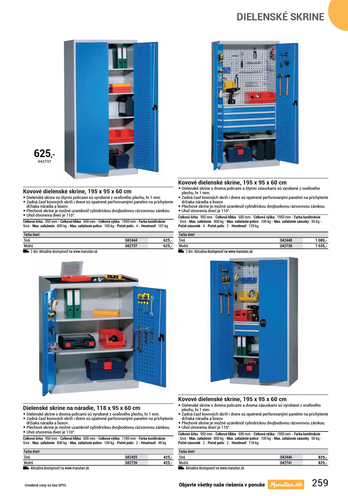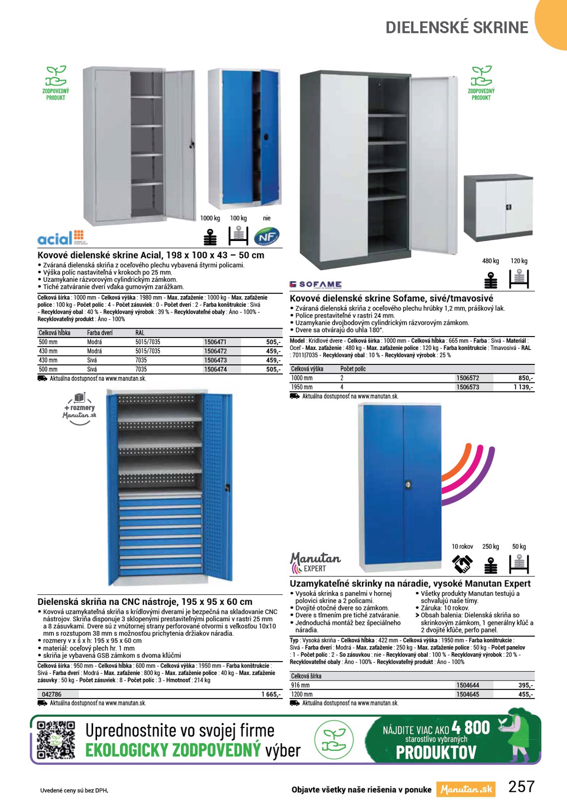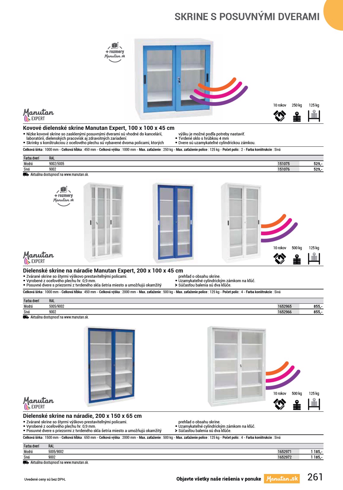 SKRINE S POSUVNÝMI DVERAMI 10 rokov 250 kg 125 kg Kovové dielenské skrine Manutan Expert, 100 x 100 x 45 cm • Nízke kovové skrine so zasklenými posuvnými dverami sú vhodné do kancelárií, výšku je možné podľa potreby nastaviť. laboratórií, dielenských pracovísk aj zdravotných zariadení. • Tvrdené sklo s hrúbkou 4 mm • Skrinky s konštrukciou z oceľového plechu sú vybavené dvoma policami, ktorých • Dvere sú uzamykateľné cylindrickou zámkou. Celková šírka : 1000 mm - Celková hĺbka : 450 mm - Celková výška : 1000 mm - Max. zaťaženie : 250 kg - Max. zaťaženie police : 125 kg - Počet políc : 2 - Farba konštrukcie : Sivá Farba dverí RAL Modrá 9002/5005 Sivá 9002 Aktuálna dostupnosť na www.manutan.sk. 151075 151076 529,- 529,- 10 rokov 500 kg 125 kg Dielenské skrine na náradie Manutan Expert, 200 x 100 x 45 cm • Zvárané skrine so štyrmi výškovo prestaviteľnými policami. prehľad o obsahu skrine. • Vyrobené z oceľového plechu hr. 0,9 mm. • Posuvné dvere s priezormi z tvrdeného skla šetria miesto a umožňujú okamžitý • Uzamykateľné cylindrickým zámkom na kľúč. OO Súčasťou balenia sú dva kľúče. Celková šírka : 1000 mm - Celková hĺbka : 450 mm - Celková výška : 2000 mm - Max. zaťaženie : 500 kg - Max. zaťaženie police : 125 kg - Počet políc : 4 - Farba konštrukcie : Sivá Farba dverí RAL Modrá 5005/9002 Sivá 9002 Aktuálna dostupnosť na www.manutan.sk. 1652965 1652966 855,- 855,- 10 rokov 500 kg 125 kg Dielenské skrine na náradie, 200 x 150 x 65 cm • Zvárané skrine so štyrmi výškovo prestaviteľnými policami. • Vyrobené z oceľového plechu hr. 0,9 mm. • Posuvné dvere s priezormi z tvrdeného skla šetria miesto a umožňujú okamžitý prehľad o obsahu skrine. • Uzamykateľné cylindrickým zámkom na kľúč. OO Súčasťou balenia sú dva kľúče. Celková šírka : 1500 mm - Celková hĺbka : 650 mm - Celková výška : 2000 mm - Max. zaťaženie : 500 kg - Max. zaťaženie police : 125 kg - Počet políc : 4 - Farba konštrukcie : Sivá Farba dverí RAL Modrá 5005/9002 Sivá 9002 Aktuálna dostupnosť na www.manutan.sk. 1652971 1652972 1 185,- 1 185,- 261