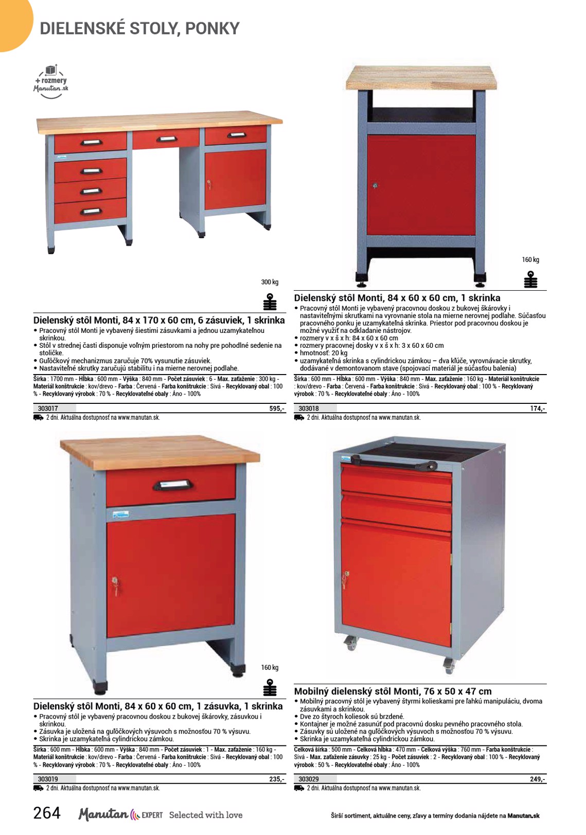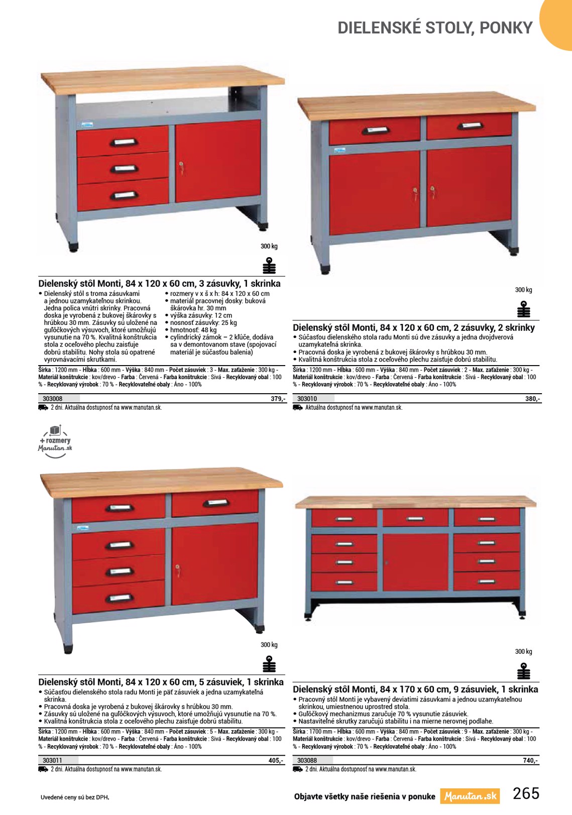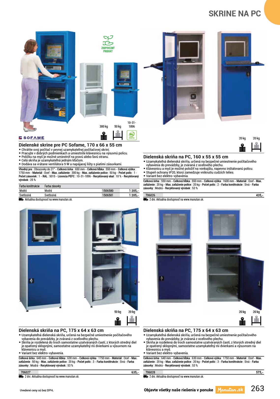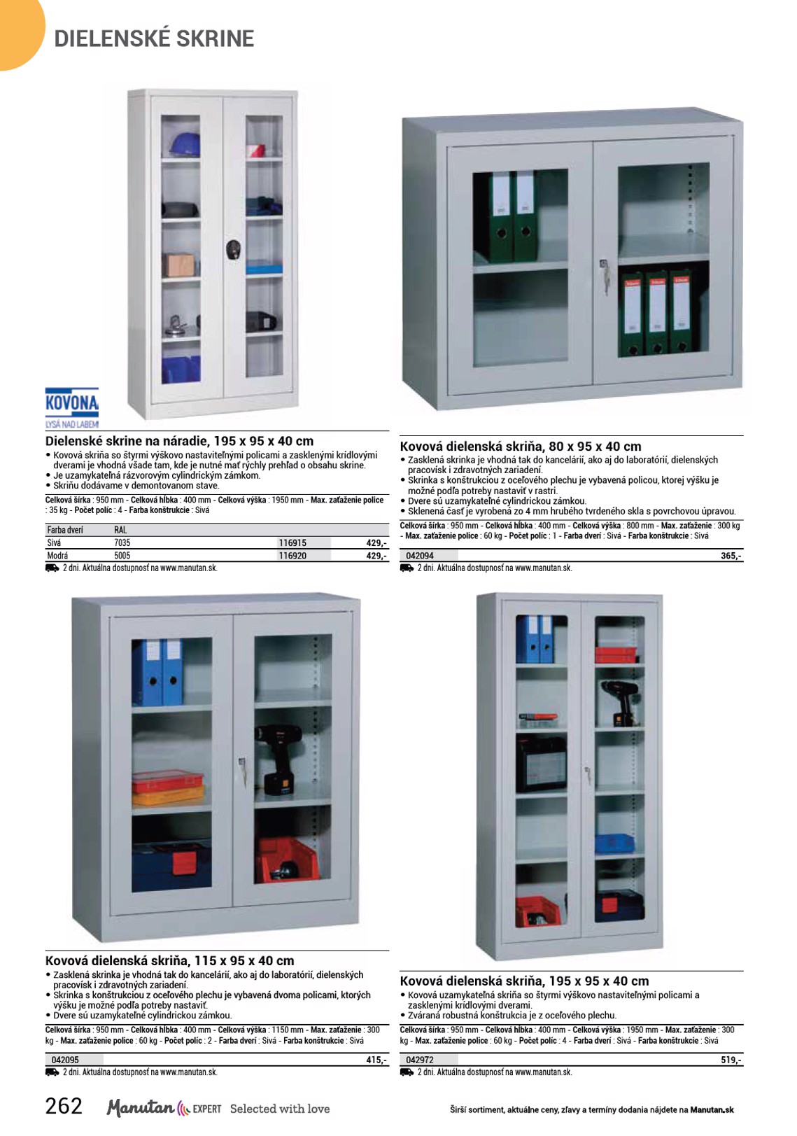 SKRINE S POSUVNÝMI DVERAMI 10 rokov 250 kg 125 kg Kovové dielenské skrine Manutan Expert, 100 x 100 x 45 cm • Nízke kovové skrine so zasklenými posuvnými dverami sú vhodné do kancelárií, výšku je možné podľa potreby nastaviť. laboratórií, dielenských pracovísk aj zdravotných zariadení. • Tvrdené sklo s hrúbkou 4 mm • Skrinky s konštrukciou z oceľového plechu sú vybavené dvoma policami, ktorých • Dvere sú uzamykateľné cylindrickou zámkou. Celková šírka : 1000 mm - Celková hĺbka : 450 mm - Celková výška : 1000 mm - Max. zaťaženie : 250 kg - Max. zaťaženie police : 125 kg - Počet políc : 2 - Farba konštrukcie : Sivá Farba dverí RAL Modrá 9002/5005 Sivá 9002 Aktuálna dostupnosť na www.manutan.sk. 151075 151076 529,- 529,- 10 rokov 500 kg 125 kg Dielenské skrine na náradie Manutan Expert, 200 x 100 x 45 cm • Zvárané skrine so štyrmi výškovo prestaviteľnými policami. prehľad o obsahu skrine. • Vyrobené z oceľového plechu hr. 0,9 mm. • Posuvné dvere s priezormi z tvrdeného skla šetria miesto a umožňujú okamžitý • Uzamykateľné cylindrickým zámkom na kľúč. OO Súčasťou balenia sú dva kľúče. Celková šírka : 1000 mm - Celková hĺbka : 450 mm - Celková výška : 2000 mm - Max. zaťaženie : 500 kg - Max. zaťaženie police : 125 kg - Počet políc : 4 - Farba konštrukcie : Sivá Farba dverí RAL Modrá 5005/9002 Sivá 9002 Aktuálna dostupnosť na www.manutan.sk. 1652965 1652966 855,- 855,- 10 rokov 500 kg 125 kg Dielenské skrine na náradie, 200 x 150 x 65 cm • Zvárané skrine so štyrmi výškovo prestaviteľnými policami. • Vyrobené z oceľového plechu hr. 0,9 mm. • Posuvné dvere s priezormi z tvrdeného skla šetria miesto a umožňujú okamžitý prehľad o obsahu skrine. • Uzamykateľné cylindrickým zámkom na kľúč. OO Súčasťou balenia sú dva kľúče. Celková šírka : 1500 mm - Celková hĺbka : 650 mm - Celková výška : 2000 mm - Max. zaťaženie : 500 kg - Max. zaťaženie police : 125 kg - Počet políc : 4 - Farba konštrukcie : Sivá Farba dverí RAL Modrá 5005/9002 Sivá 9002 Aktuálna dostupnosť na www.manutan.sk. 1652971 1652972 1 185,- 1 185,- 261