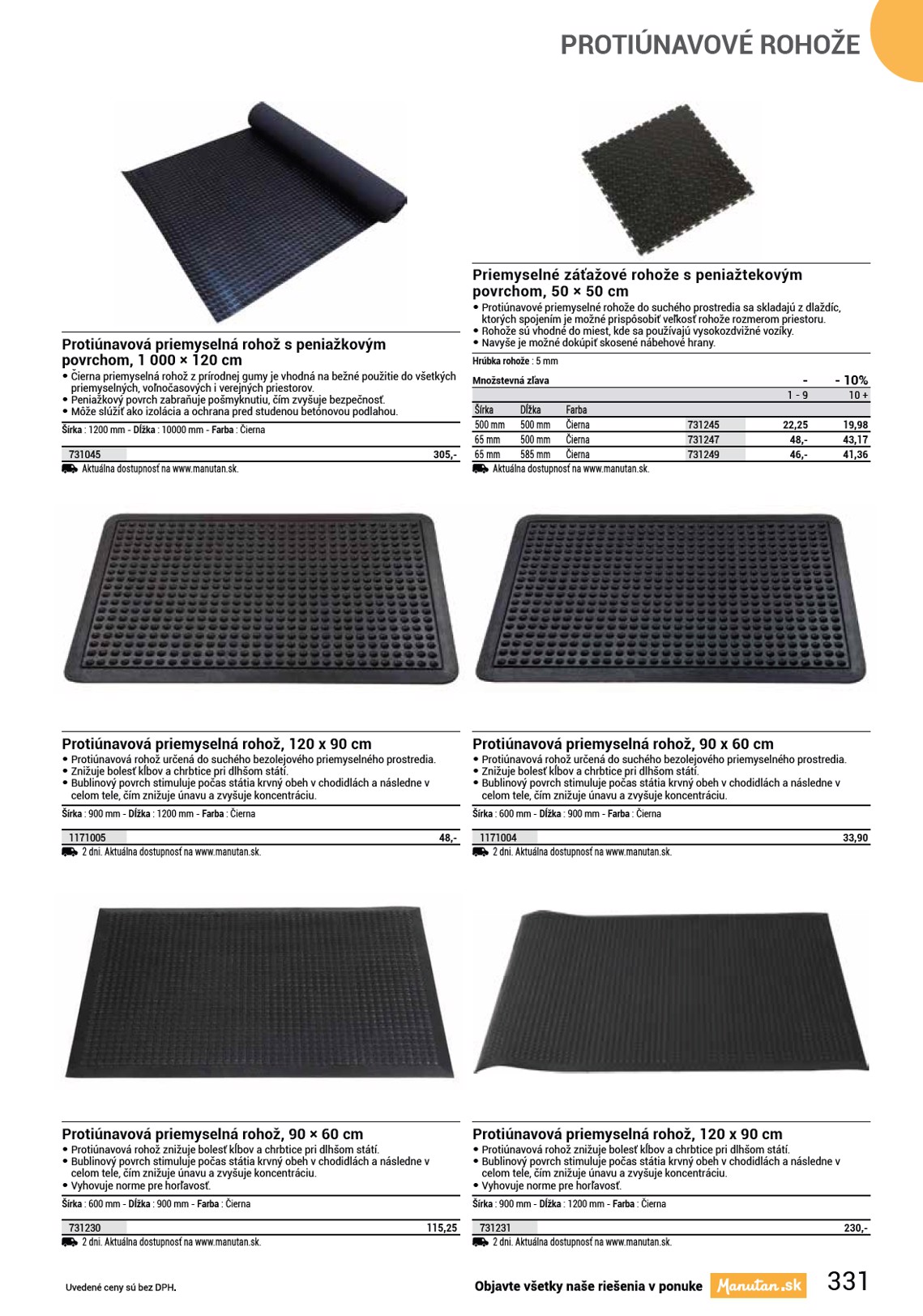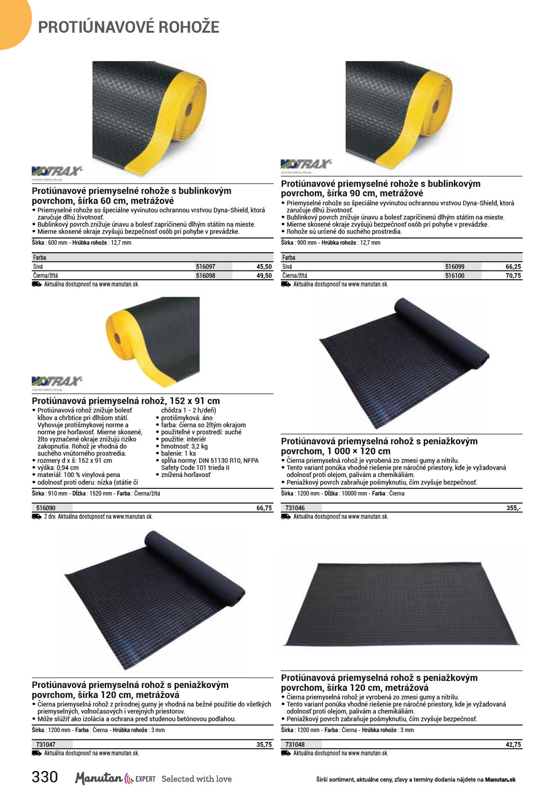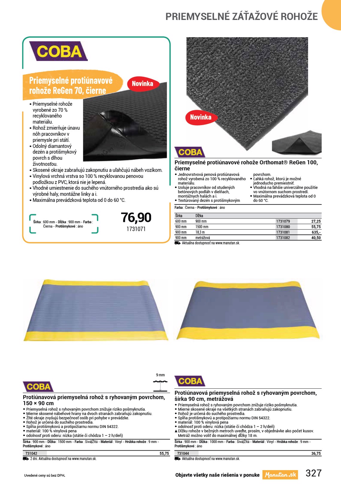 PRIEMYSELNÉ ZÁŤAŽOVÉ ROHOŽE Priemyselné protiúnavové rohože ReGen 70, čierne • Priemyselné rohože vyrobené zo 70 % recyklovaného materiálu. • Rohož zmierňuje únavu nôh pracovníkov v priemysle pri státí. • Odolný diamantový dezén a protišmykový povrch s dlhou životnosťou. • Skosené okraje zabraňujú zakopnutiu a uľahčujú nábeh vozíkom. • Vinylová vrchná vrstva so 100 % recyklovanou penovou podložkou z PVC, ktorá nie je lepená. • Vhodné umiestnenie do suchého vnútorného prostredia ako sú výrobné haly, montážne linky a i. • Maximálna prevádzková teplota od 0 do 60 °C. Šírka : 600 mm - Dĺžka : 900 mm - Farba : Čierna - Protišmykové : áno 76,90 1731071 Priemyselné protiúnavové rohože Orthomat® ReGen 100, čierne • Jednovrstvová penová protiúnavová povrchom. rohož vyrobená zo 100 % recyklovaného • Ľahká rohož, ktorú je možné materiálu. jednoducho premiestniť. • Izoluje pracovníkov od studených • Vhodná na ľahšie univerzálne použitie betónových podláh v dielňach, vo vnútornom suchom prostredí. montážnych halách a i. • Maximálna prevádzková teplota od 0 • Textúrovaný dezén s protišmykovým do 60 °C. Farba : Čierna - Protišmykové : áno Šírka Dĺžka 600 mm 900 mm 900 mm 1500 mm 900 mm 18,3 m 900 mm metrážová Aktuálna dostupnosť na www.manutan.sk. 1731079 1731080 1731081 1731082 27,25 55,75 635,- 40,50 9 mm Protiúnavová priemyselná rohož s ryhovaným povrchom, 150 × 90 cm • Priemyselná rohož s ryhovaným povrchom znižuje riziko pošmyknutia. • Mierne skosené nábehové hrany na dvoch stranách zabraňujú zakopnutiu. • Žlté okraje zvyšujú bezpečnosť osôb pri pohybe v prevádzke. • Rohož je určená do suchého prostredia. • Spĺňa protišmykovú a protipožiarnu normu DIN 54322. • materiál: 100 % vinylová pena • odolnosť proti oderu: nízka (státie či chôdza 1 – 2 h/deň) Šírka : 900 mm - Dĺžka : 1500 mm - Farba : Sivá|Žltá - Materiál : Vinyl - Hrúbka rohože : 9 mm - Protišmykové : áno 731042 2 dni. Aktuálna dostupnosť na www.manutan.sk. 55,75 Protiúnavová priemyselná rohož s ryhovaným povrchom, šírka 90 cm, metrážová • Priemyselná rohož s ryhovaným povrchom znižuje riziko pošmyknutia. • Mierne skosené okraje na všetkých stranách zabraňujú zakopnutiu. • Rohož je určená do suchého prostredia. • Spĺňa protišmykovú a protipožiarnu normu DIN 54322. • materiál: 100 % vinylová pena • odolnosť proti oderu: nízka (státie či chôdza 1 – 2 h/deň) SS Dlžku rohože v bežných metroch uveďte, prosím, v objednávke ako počet kusov. Metráž možno voliť do maximálnej dĺžky 18 m. Šírka : 900 mm - Dĺžka : 1000 mm - Farba : Sivá|Žltá - Materiál : Vinyl - Hrúbka rohože : 9 mm - Protišmykové : áno 731044 Aktuálna dostupnosť na www.manutan.sk. 36,75 327