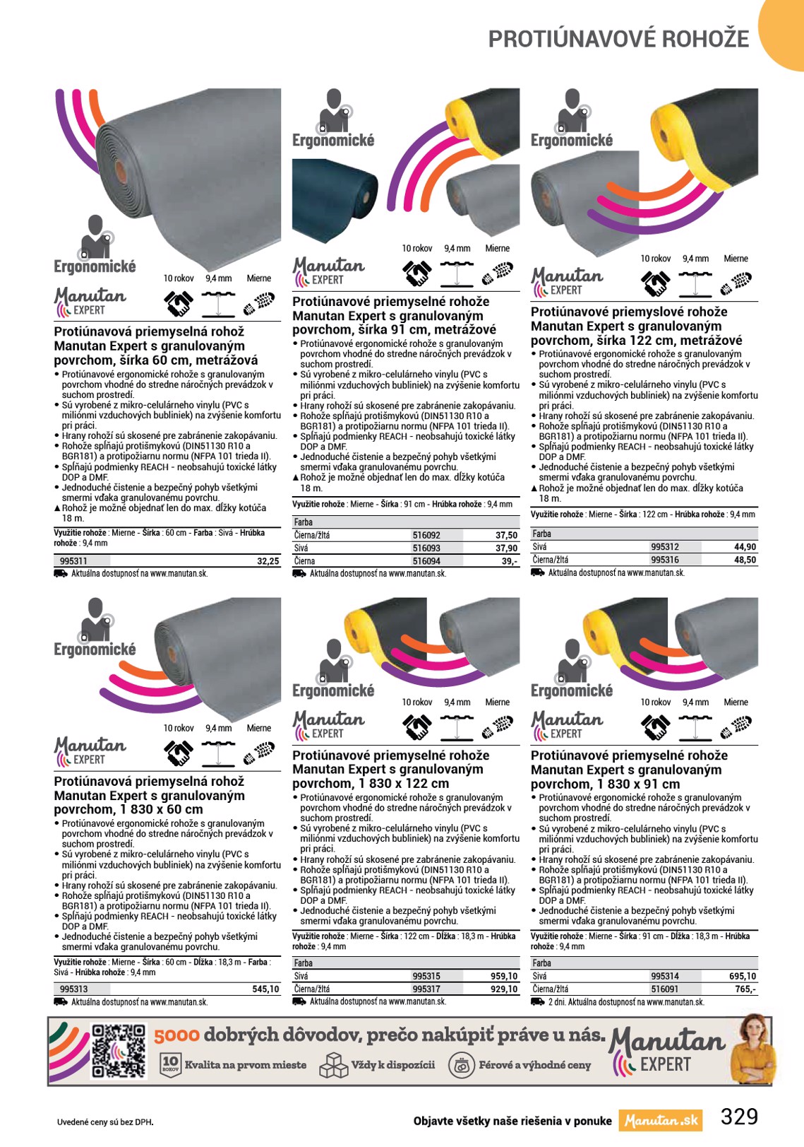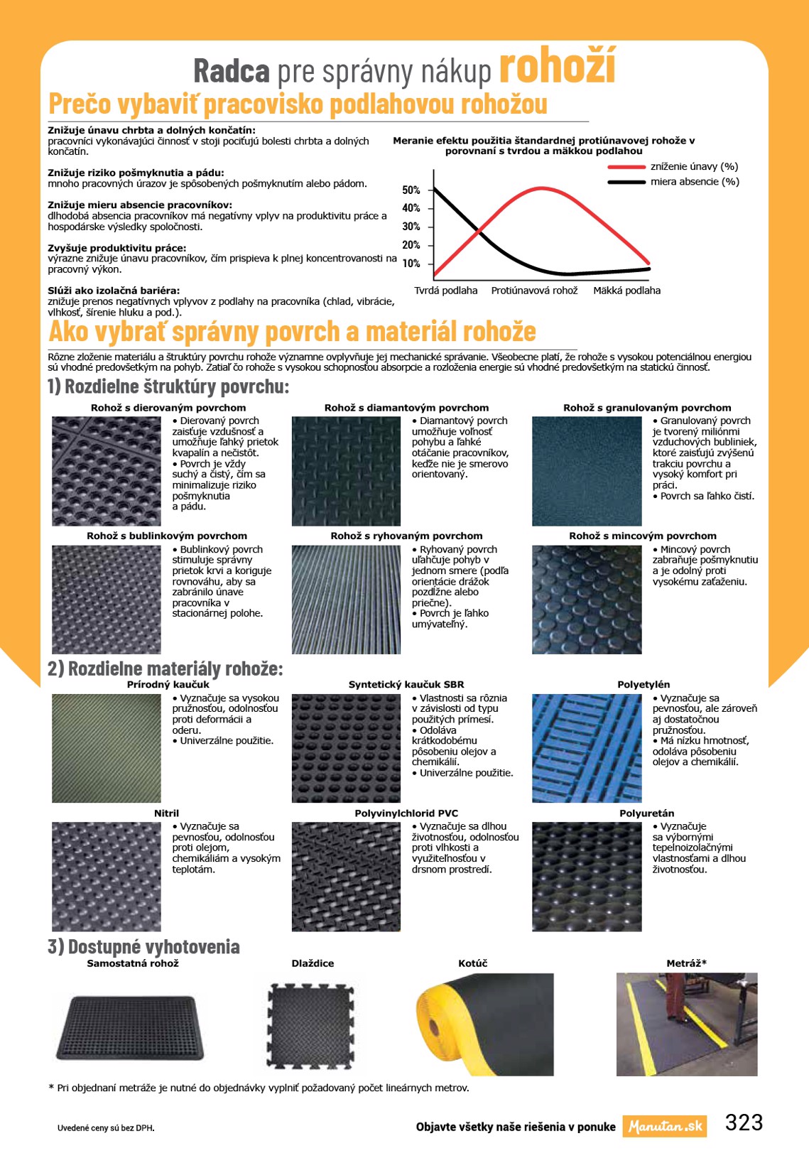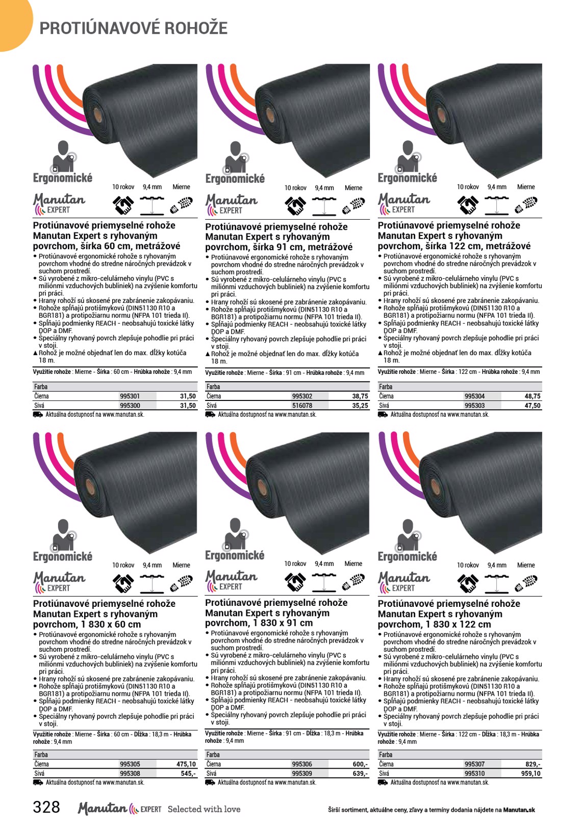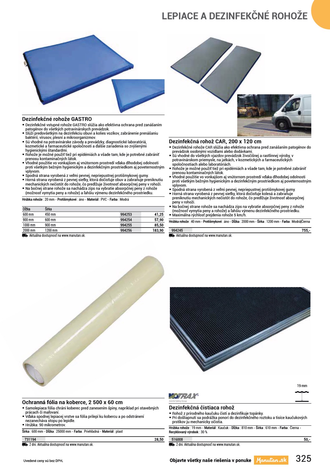 PRIEMYSELNÉ ZÁŤAŽOVÉ ROHOŽE Priemyselné protiúnavové rohože ReGen 70, čierne • Priemyselné rohože vyrobené zo 70 % recyklovaného materiálu. • Rohož zmierňuje únavu nôh pracovníkov v priemysle pri státí. • Odolný diamantový dezén a protišmykový povrch s dlhou životnosťou. • Skosené okraje zabraňujú zakopnutiu a uľahčujú nábeh vozíkom. • Vinylová vrchná vrstva so 100 % recyklovanou penovou podložkou z PVC, ktorá nie je lepená. • Vhodné umiestnenie do suchého vnútorného prostredia ako sú výrobné haly, montážne linky a i. • Maximálna prevádzková teplota od 0 do 60 °C. Šírka : 600 mm - Dĺžka : 900 mm - Farba : Čierna - Protišmykové : áno 76,90 1731071 Priemyselné protiúnavové rohože Orthomat® ReGen 100, čierne • Jednovrstvová penová protiúnavová povrchom. rohož vyrobená zo 100 % recyklovaného • Ľahká rohož, ktorú je možné materiálu. jednoducho premiestniť. • Izoluje pracovníkov od studených • Vhodná na ľahšie univerzálne použitie betónových podláh v dielňach, vo vnútornom suchom prostredí. montážnych halách a i. • Maximálna prevádzková teplota od 0 • Textúrovaný dezén s protišmykovým do 60 °C. Farba : Čierna - Protišmykové : áno Šírka Dĺžka 600 mm 900 mm 900 mm 1500 mm 900 mm 18,3 m 900 mm metrážová Aktuálna dostupnosť na www.manutan.sk. 1731079 1731080 1731081 1731082 27,25 55,75 635,- 40,50 9 mm Protiúnavová priemyselná rohož s ryhovaným povrchom, 150 × 90 cm • Priemyselná rohož s ryhovaným povrchom znižuje riziko pošmyknutia. • Mierne skosené nábehové hrany na dvoch stranách zabraňujú zakopnutiu. • Žlté okraje zvyšujú bezpečnosť osôb pri pohybe v prevádzke. • Rohož je určená do suchého prostredia. • Spĺňa protišmykovú a protipožiarnu normu DIN 54322. • materiál: 100 % vinylová pena • odolnosť proti oderu: nízka (státie či chôdza 1 – 2 h/deň) Šírka : 900 mm - Dĺžka : 1500 mm - Farba : Sivá|Žltá - Materiál : Vinyl - Hrúbka rohože : 9 mm - Protišmykové : áno 731042 2 dni. Aktuálna dostupnosť na www.manutan.sk. 55,75 Protiúnavová priemyselná rohož s ryhovaným povrchom, šírka 90 cm, metrážová • Priemyselná rohož s ryhovaným povrchom znižuje riziko pošmyknutia. • Mierne skosené okraje na všetkých stranách zabraňujú zakopnutiu. • Rohož je určená do suchého prostredia. • Spĺňa protišmykovú a protipožiarnu normu DIN 54322. • materiál: 100 % vinylová pena • odolnosť proti oderu: nízka (státie či chôdza 1 – 2 h/deň) SS Dlžku rohože v bežných metroch uveďte, prosím, v objednávke ako počet kusov. Metráž možno voliť do maximálnej dĺžky 18 m. Šírka : 900 mm - Dĺžka : 1000 mm - Farba : Sivá|Žltá - Materiál : Vinyl - Hrúbka rohože : 9 mm - Protišmykové : áno 731044 Aktuálna dostupnosť na www.manutan.sk. 36,75 327